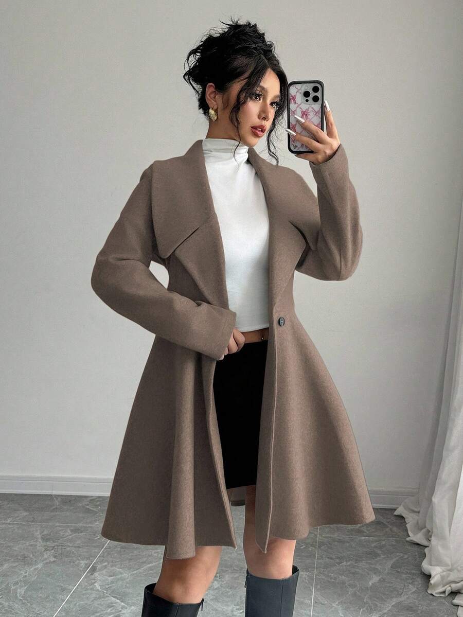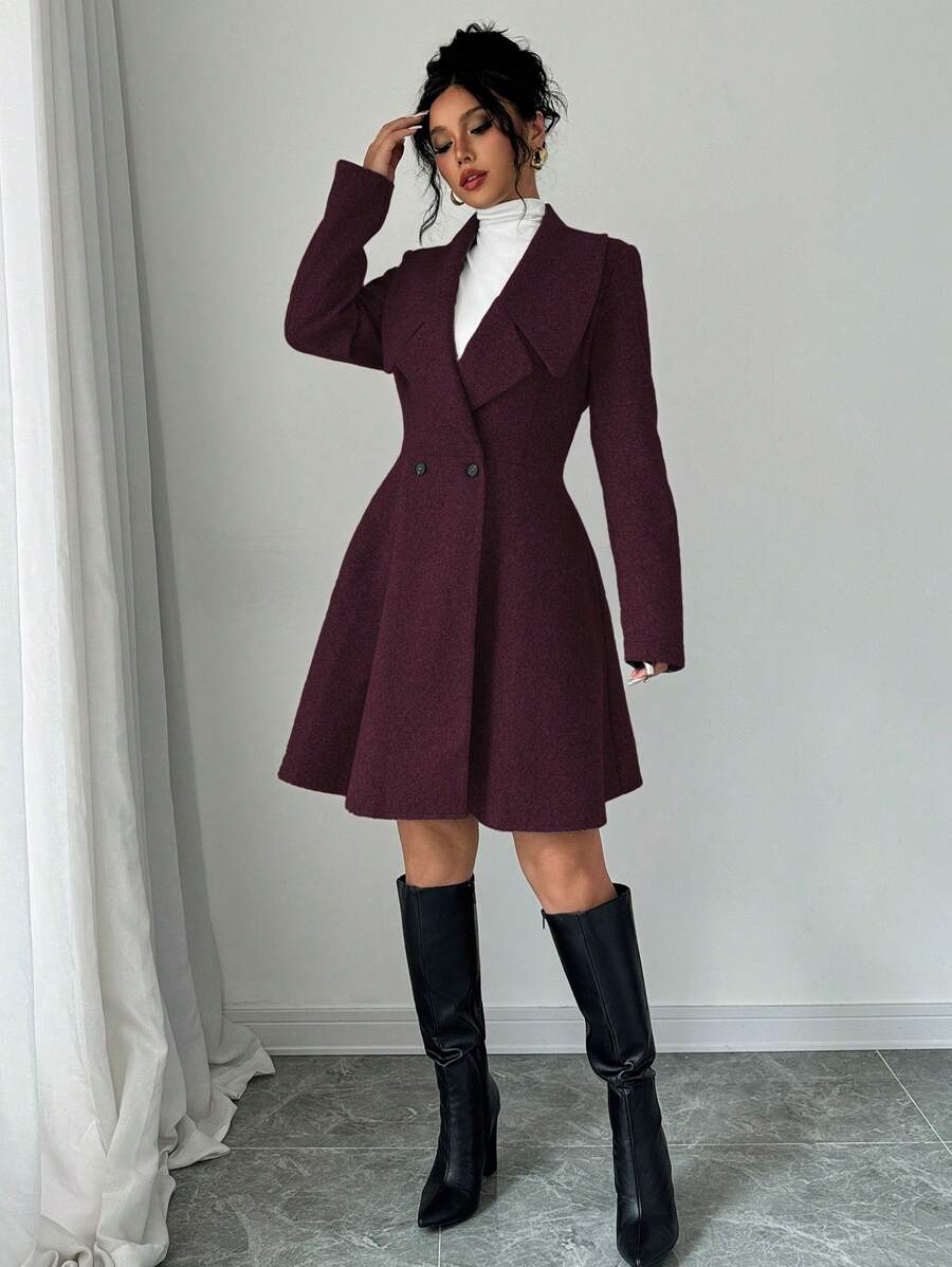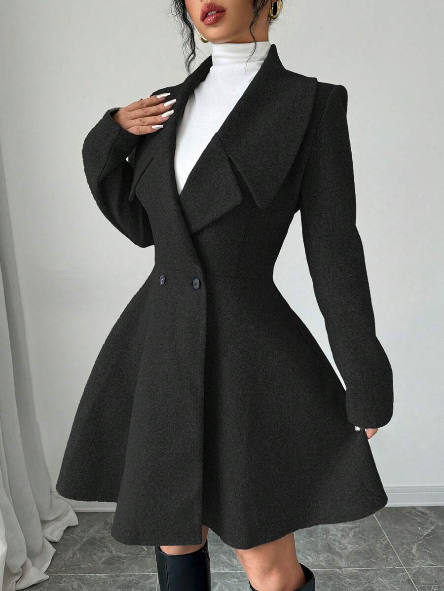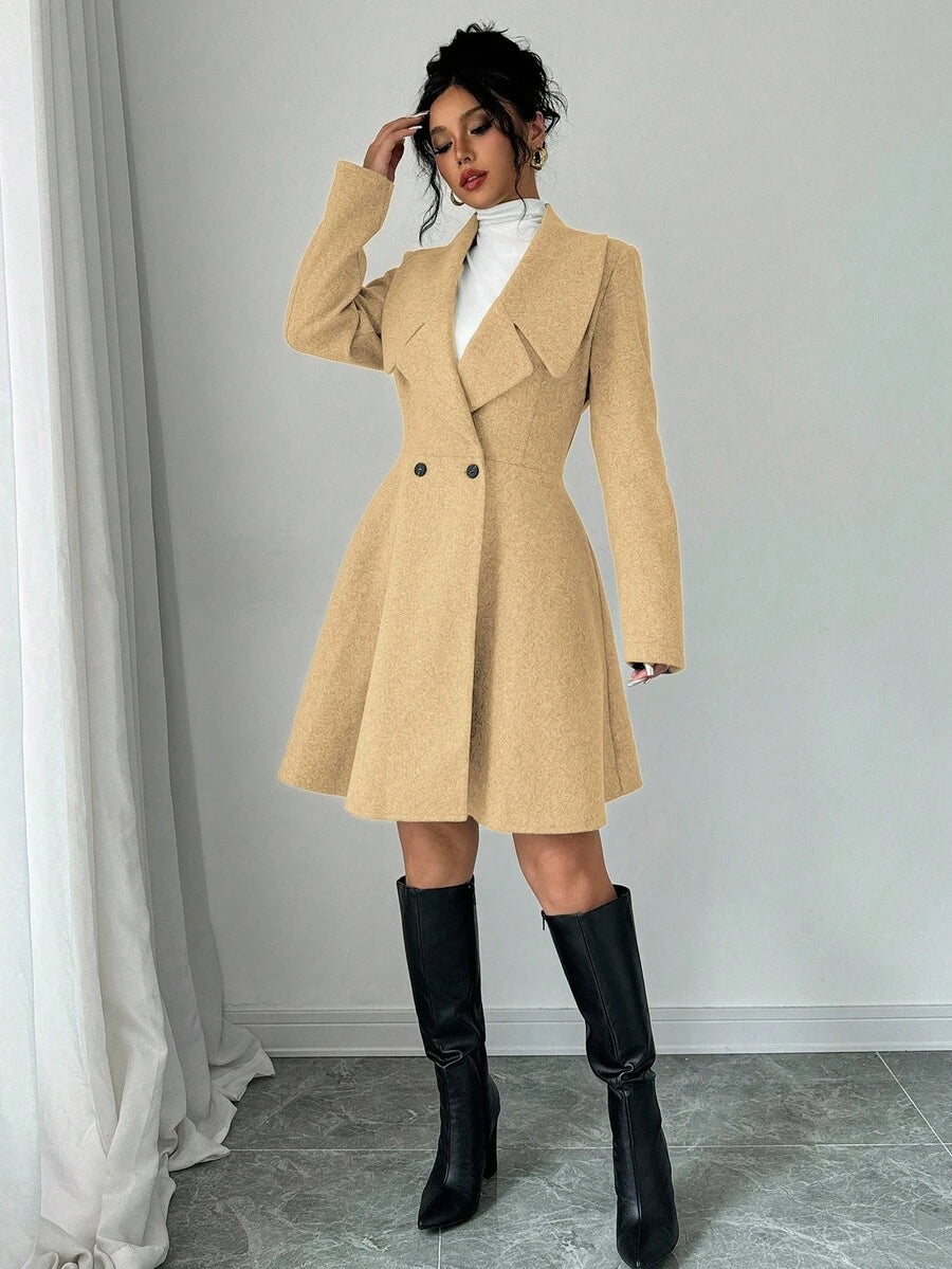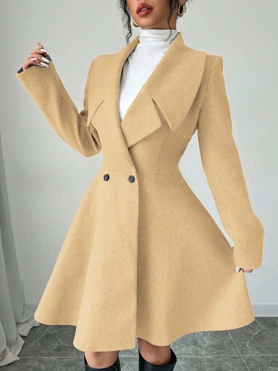 EMI Women's Solid Color Stand Collar Long Sleeve Double-Breasted Elegant Overcoat, Fall/Winter, Ladies Late Fall Elegant Button, Double Button Regular Sleeve Shawl Collar Loose Grey Tweed Plain Women Overcoats, Casual Daily Wear