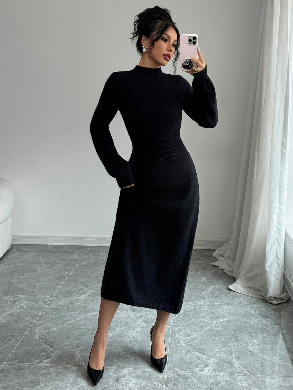 EMI Women's Solid Color Stand Collar Long Sleeve Elegant Knitted Dress, Autumn/Winter Fall Cloth For Women