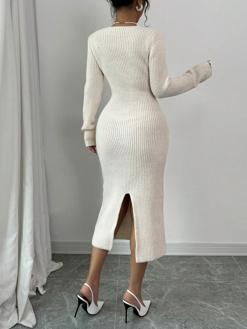 EMI Women's Solid Color V-Neck Long Sleeve Fitted Elegant Sweater Dress, Autumn