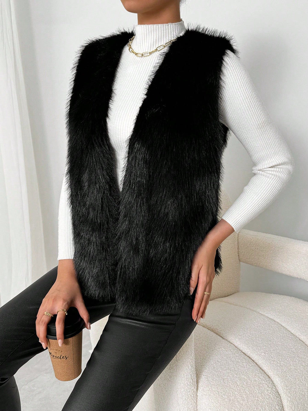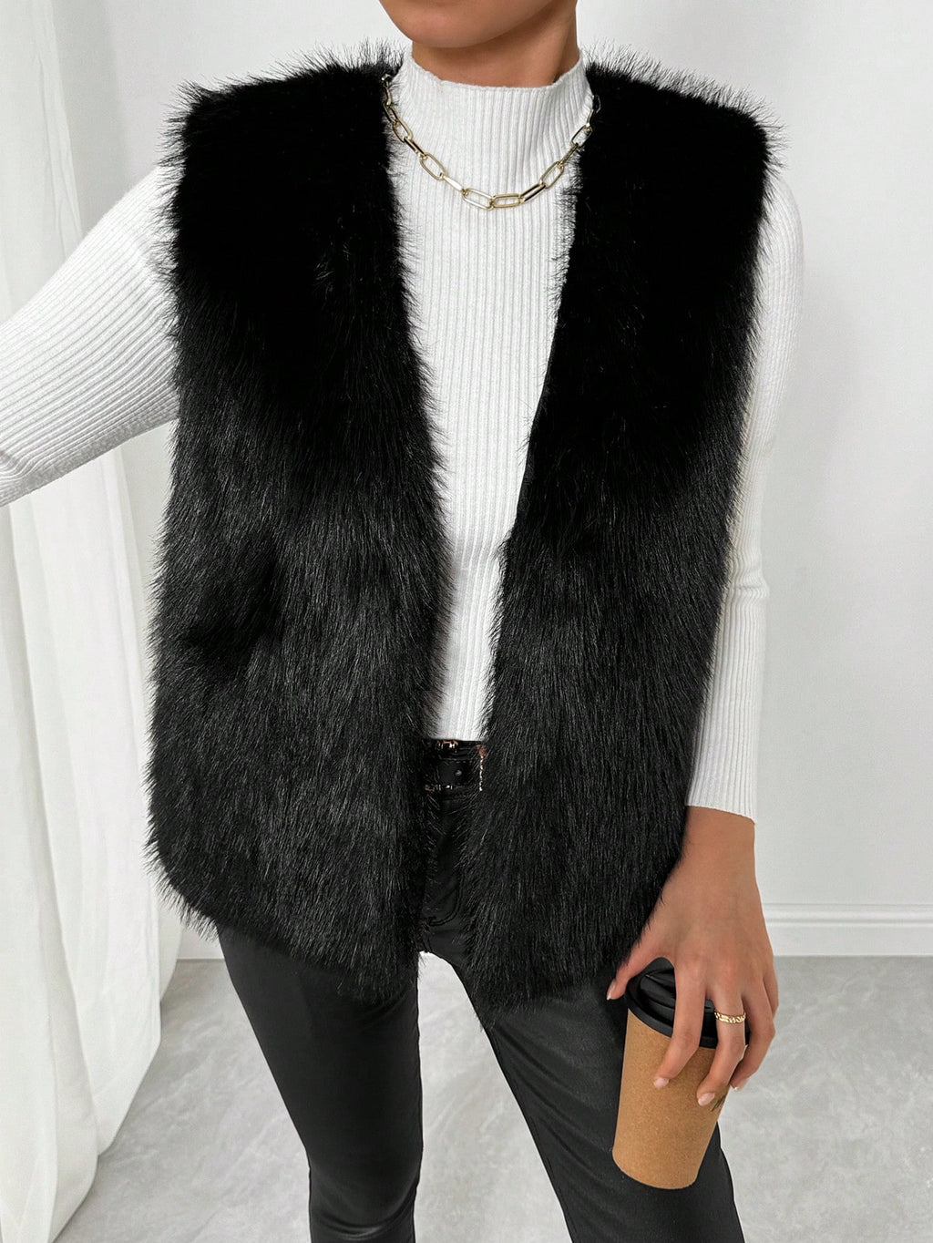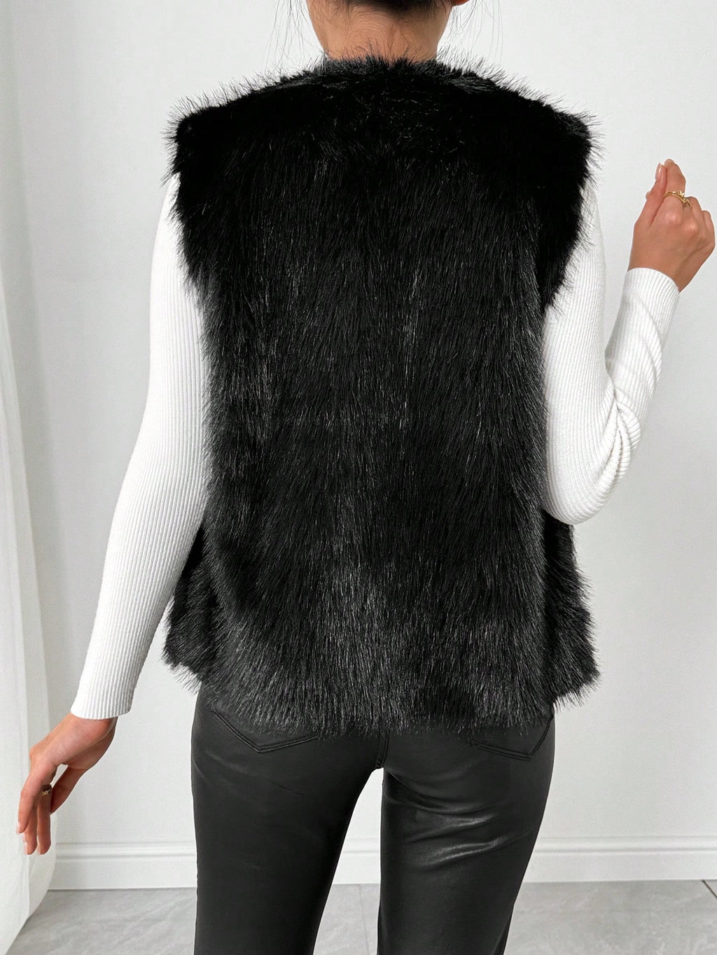 Firerie ženski prsluk od umjetnog krzna s rever kragnom i otvorenim prednjim dijelom, u jednobojnom dizajnu