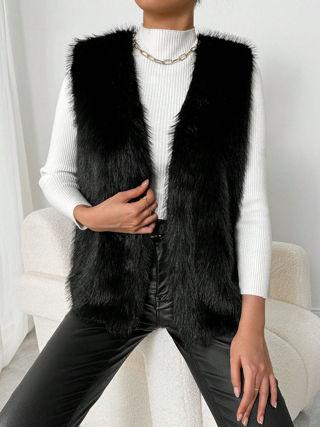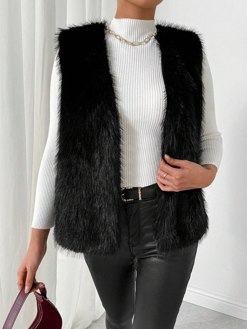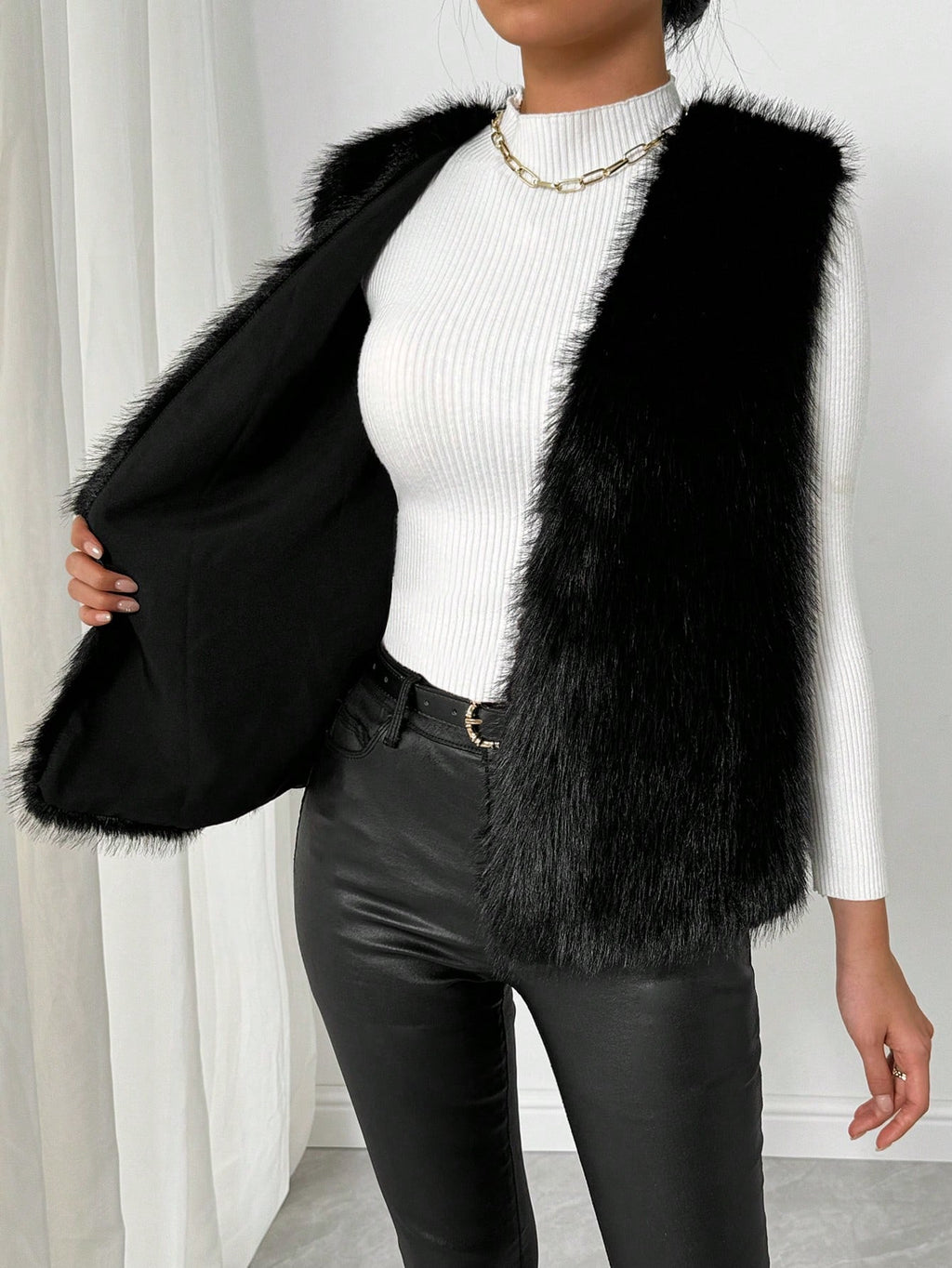 Firerie ženski prsluk od umjetnog krzna s rever kragnom i otvorenim prednjim dijelom, u jednobojnom dizajnu
