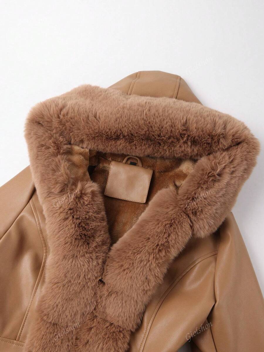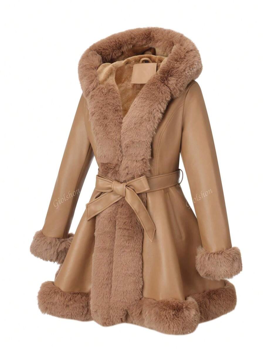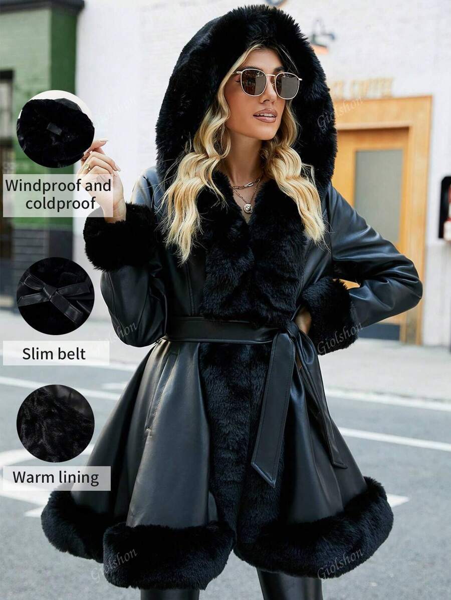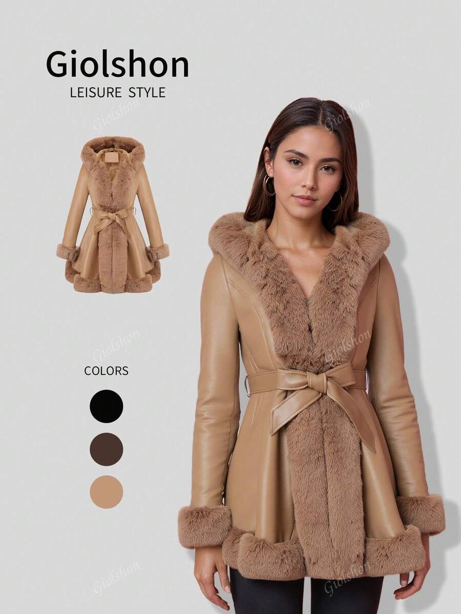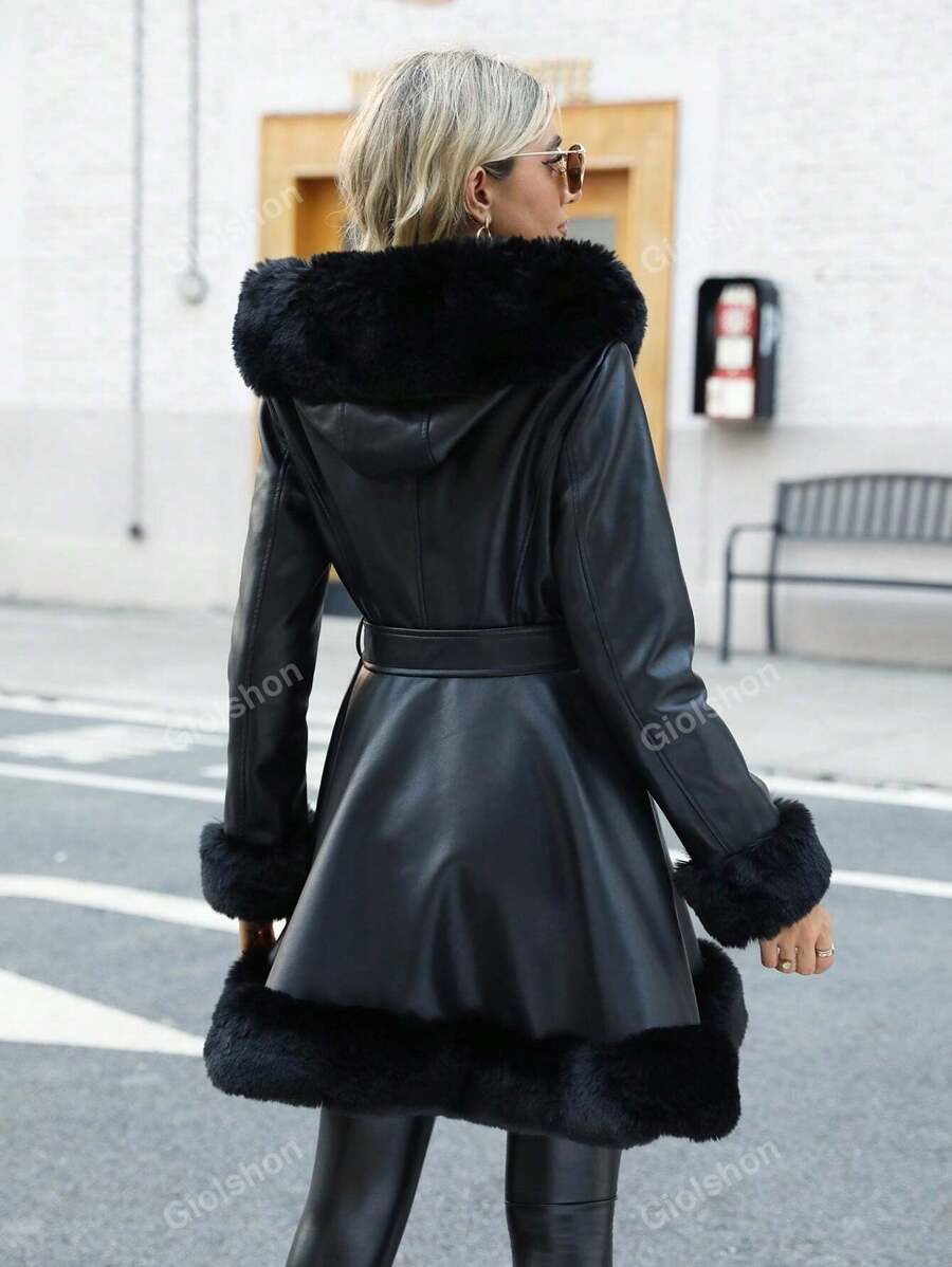 Giolshon ženska PU jakna s postavom od umjetnog krzna, kapuljačom i pojasom — jednostavna i stilizovana za ovu jesen i zimsku sezonu