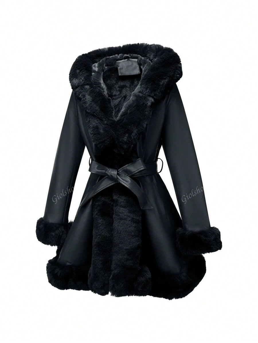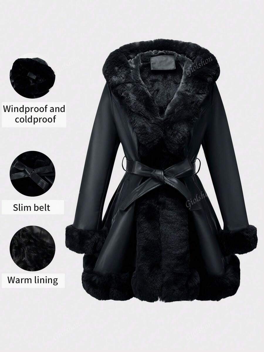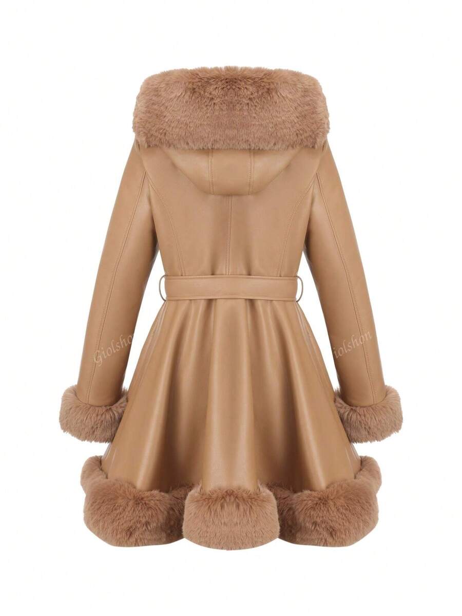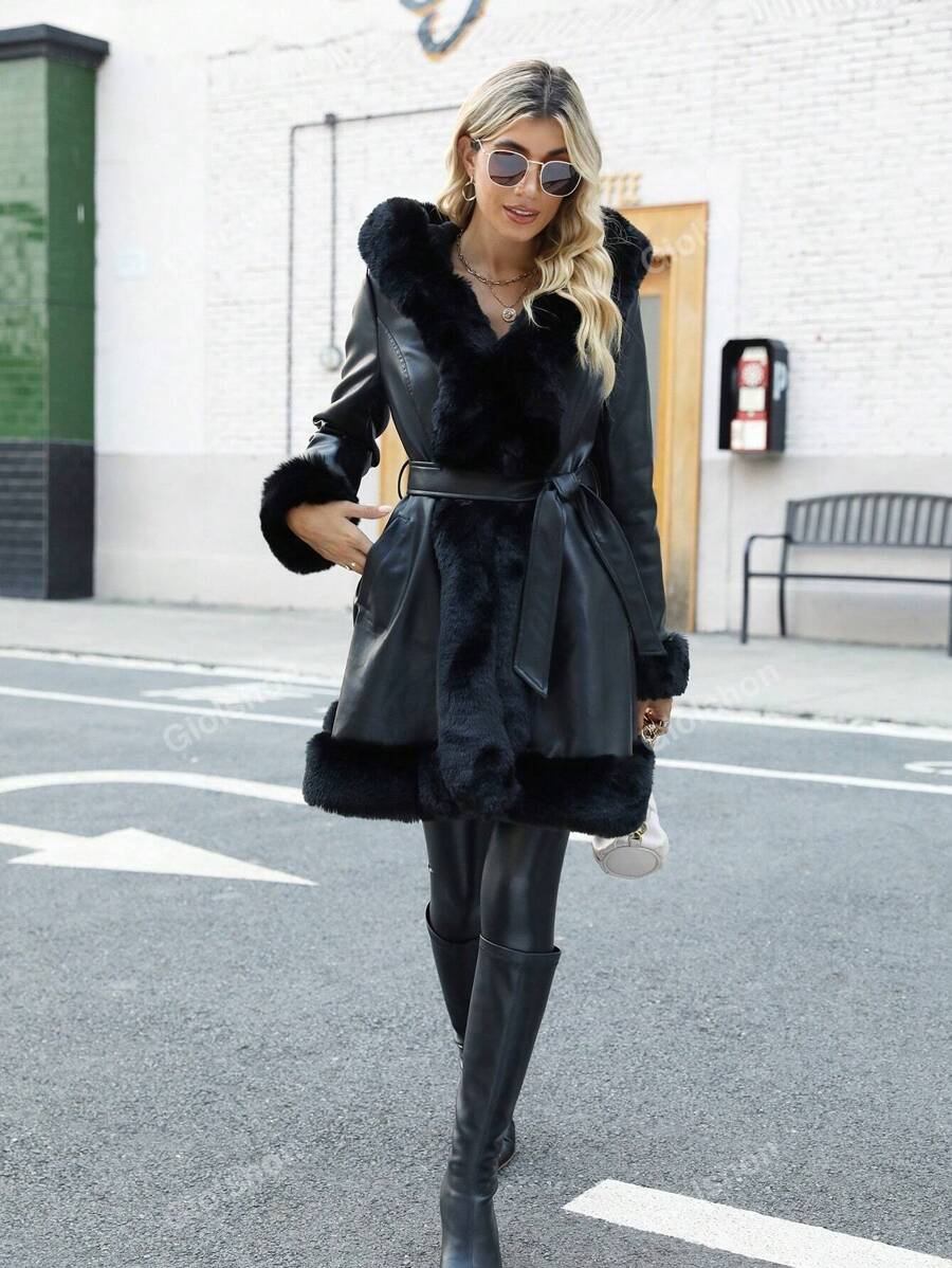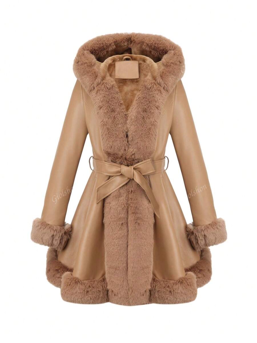 Giolshon ženska PU jakna s postavom od umjetnog krzna, kapuljačom i pojasom — jednostavna i stilizovana za ovu jesen i zimsku sezonu