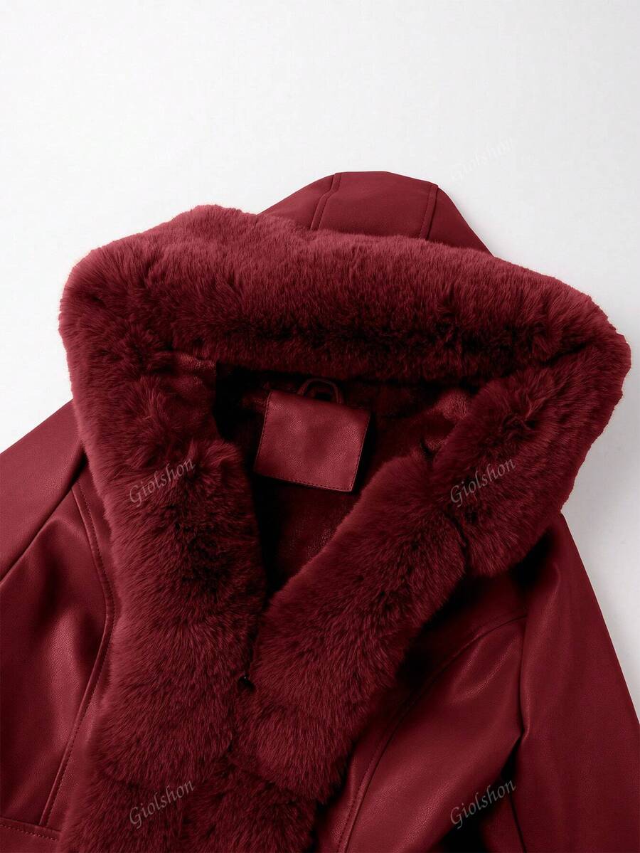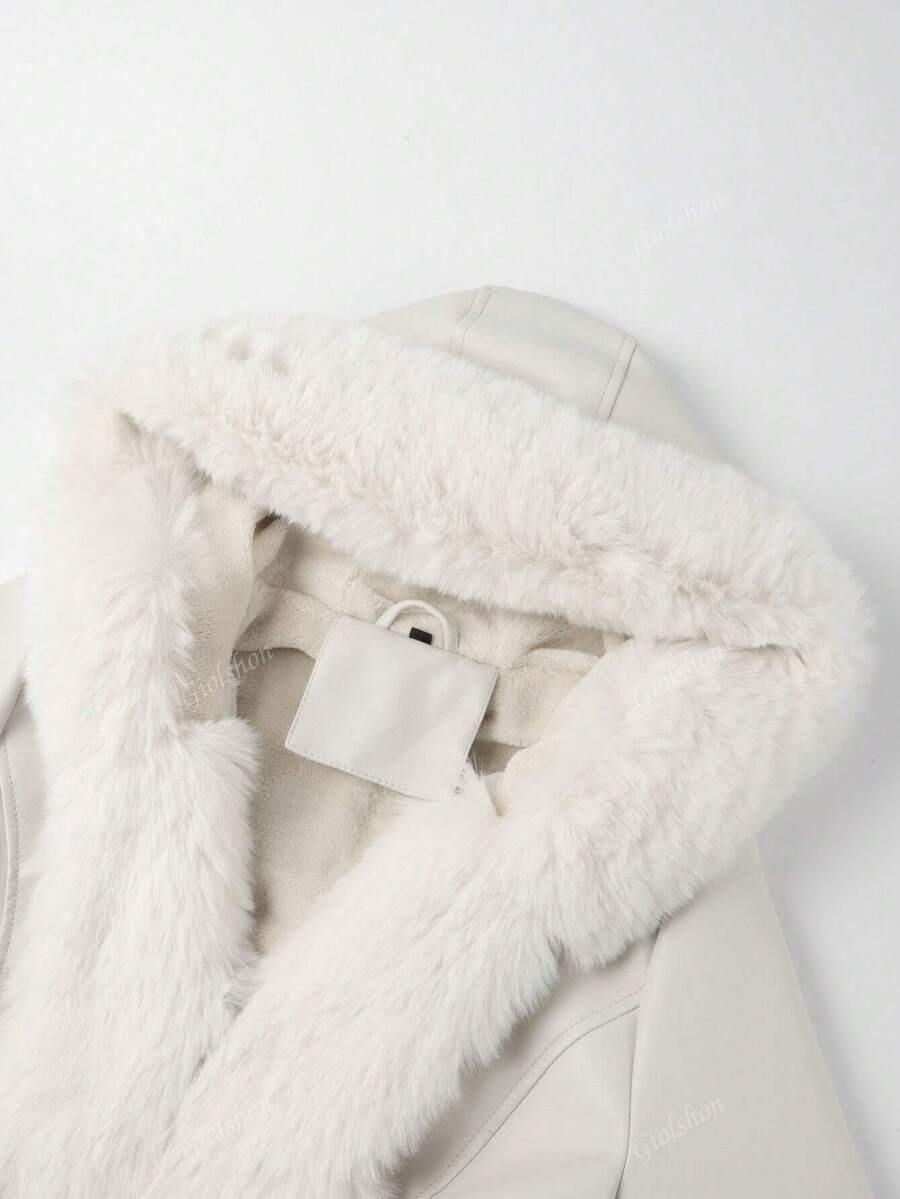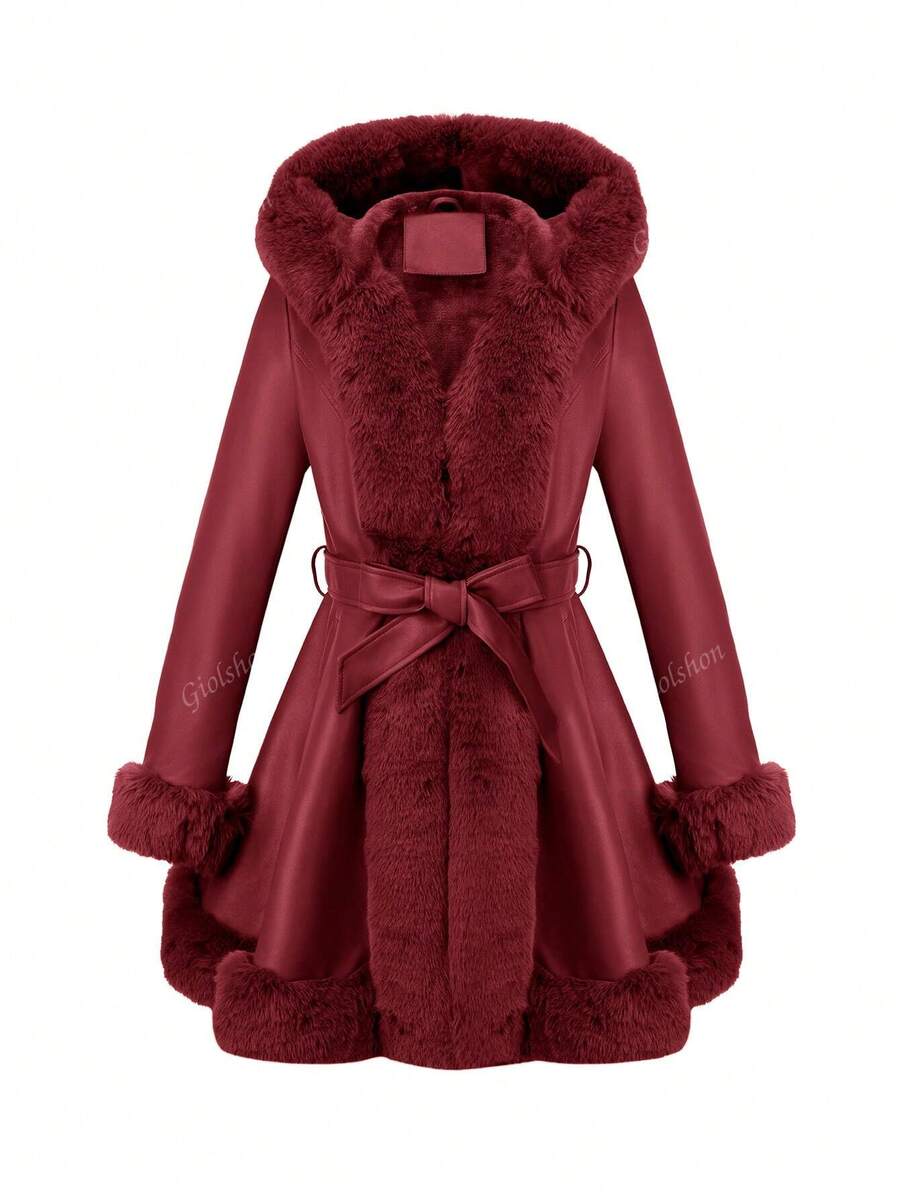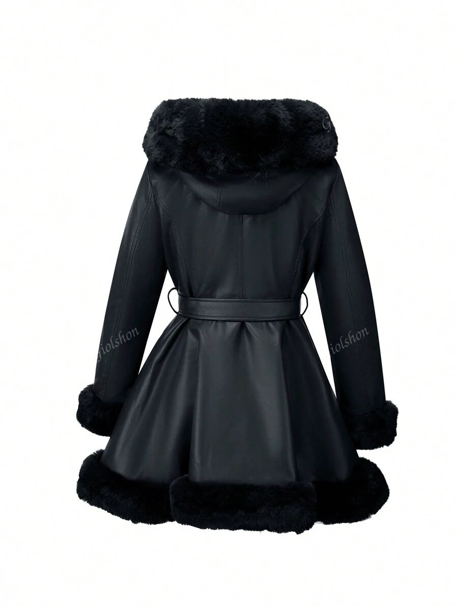 Giolshon ženska PU jakna s postavom od umjetnog krzna, kapuljačom i pojasom — jednostavna i stilizovana za ovu jesen i zimsku sezonu