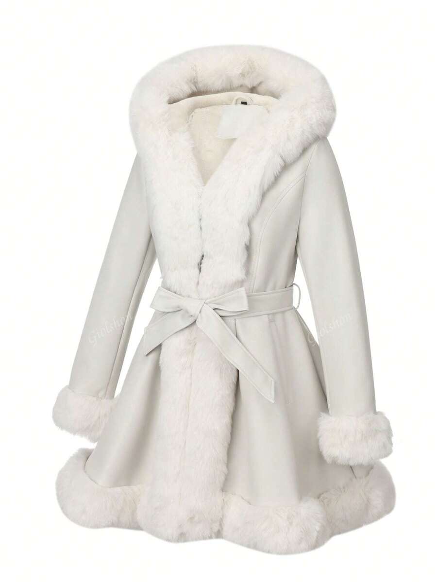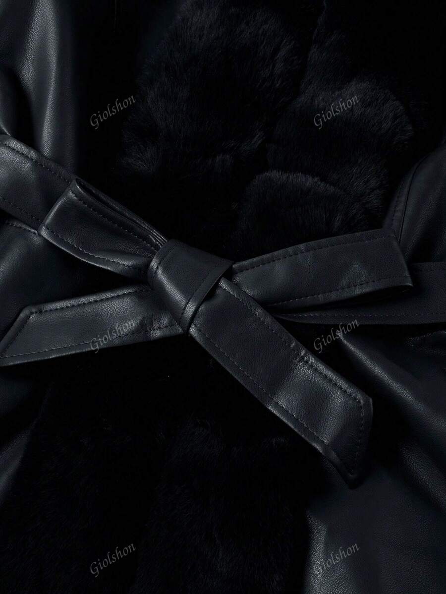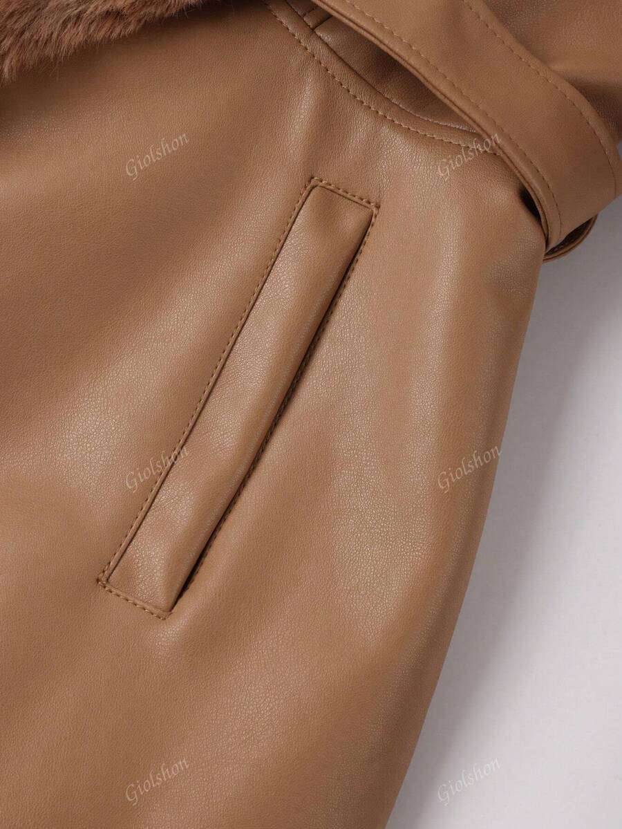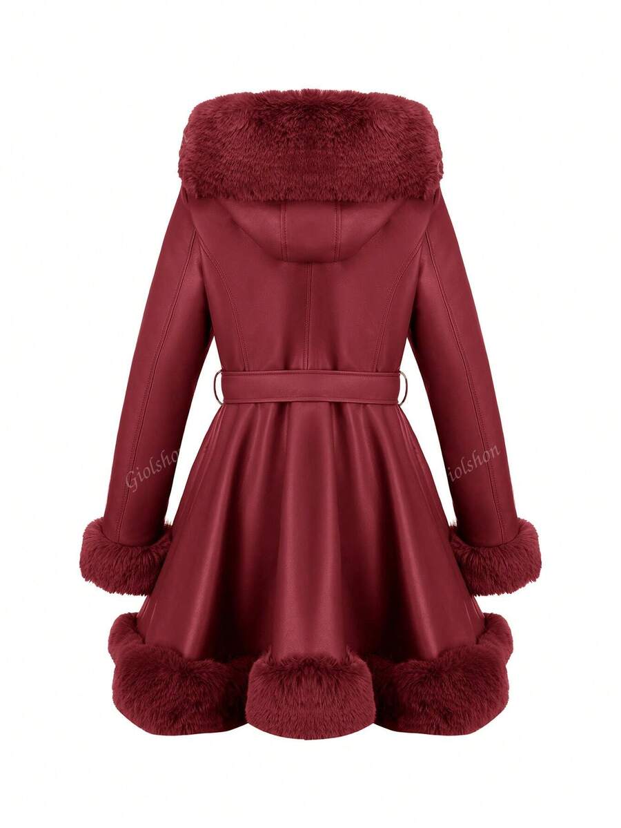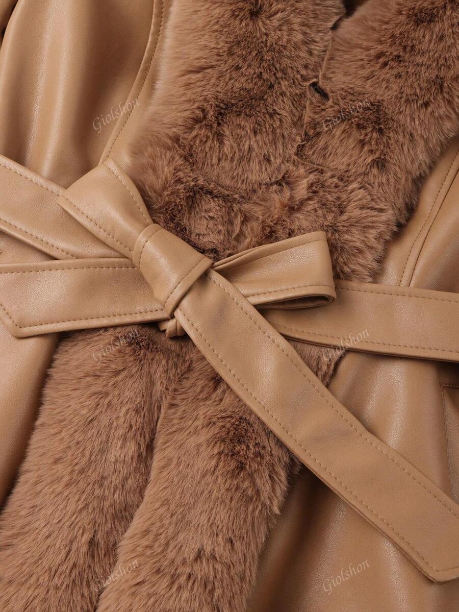 Giolshon ženska PU jakna s postavom od umjetnog krzna, kapuljačom i pojasom — jednostavna i stilizovana za ovu jesen i zimsku sezonu