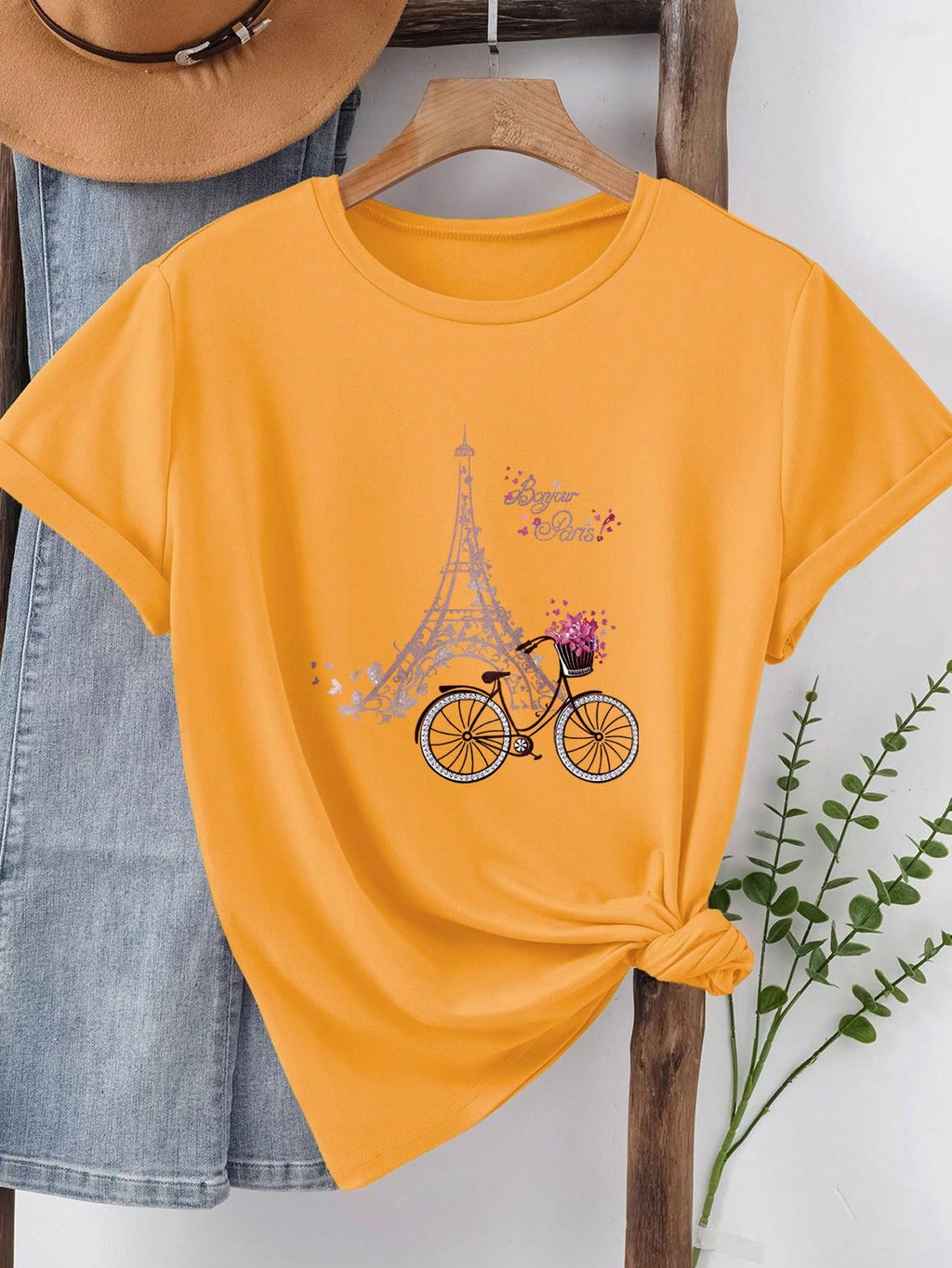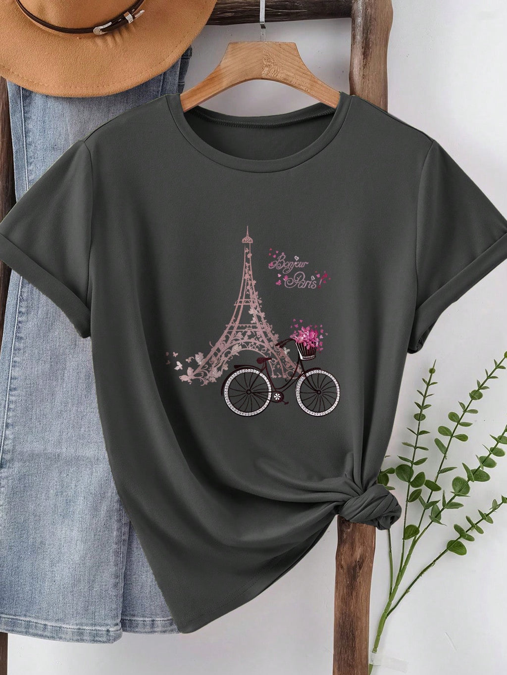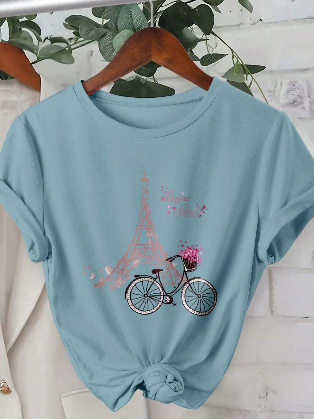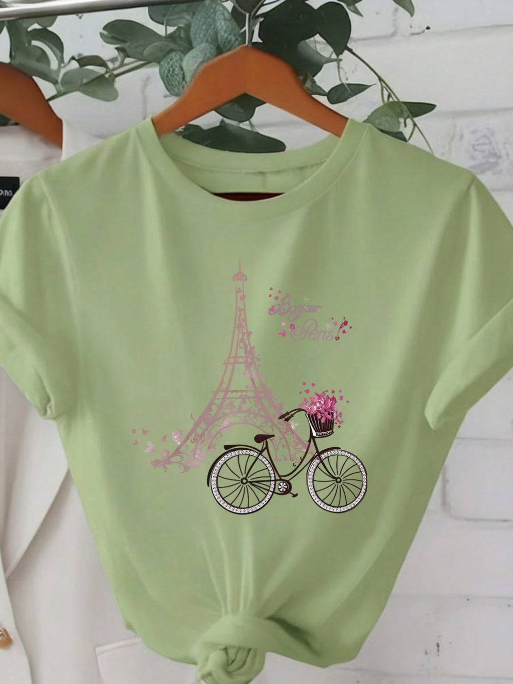INAWLY Ženska majica kratkih rukava s okruglim izrezom i kratkim rukavima s printom na cvijet, Eiffelov toranj i bicikl