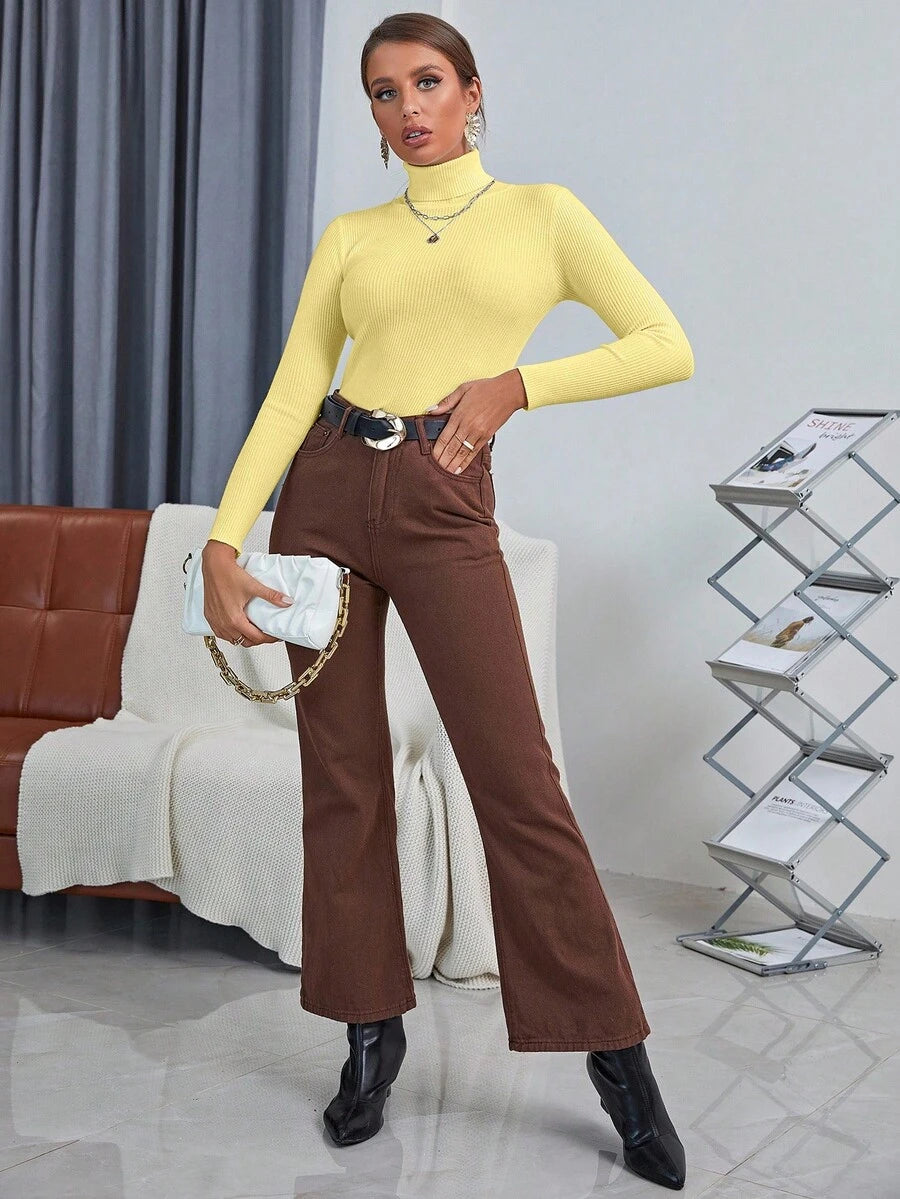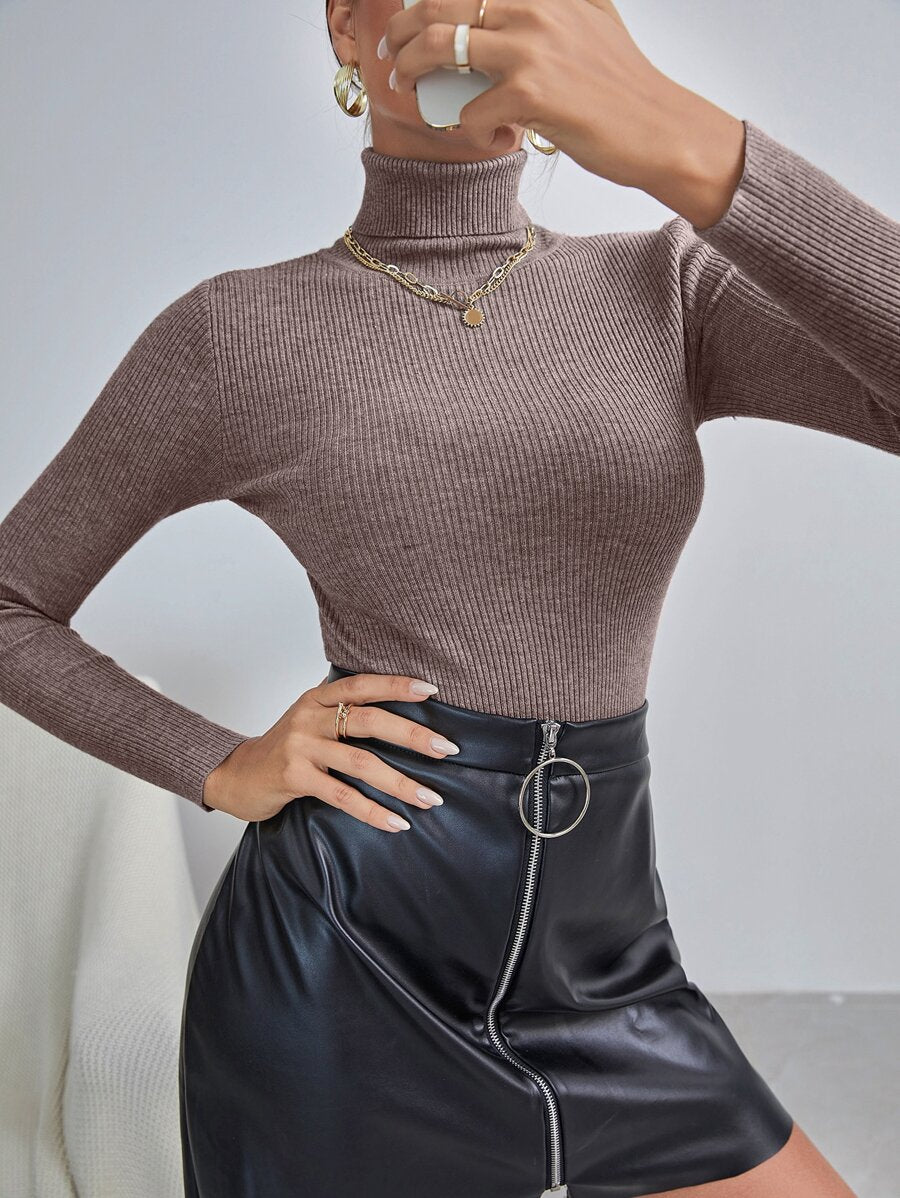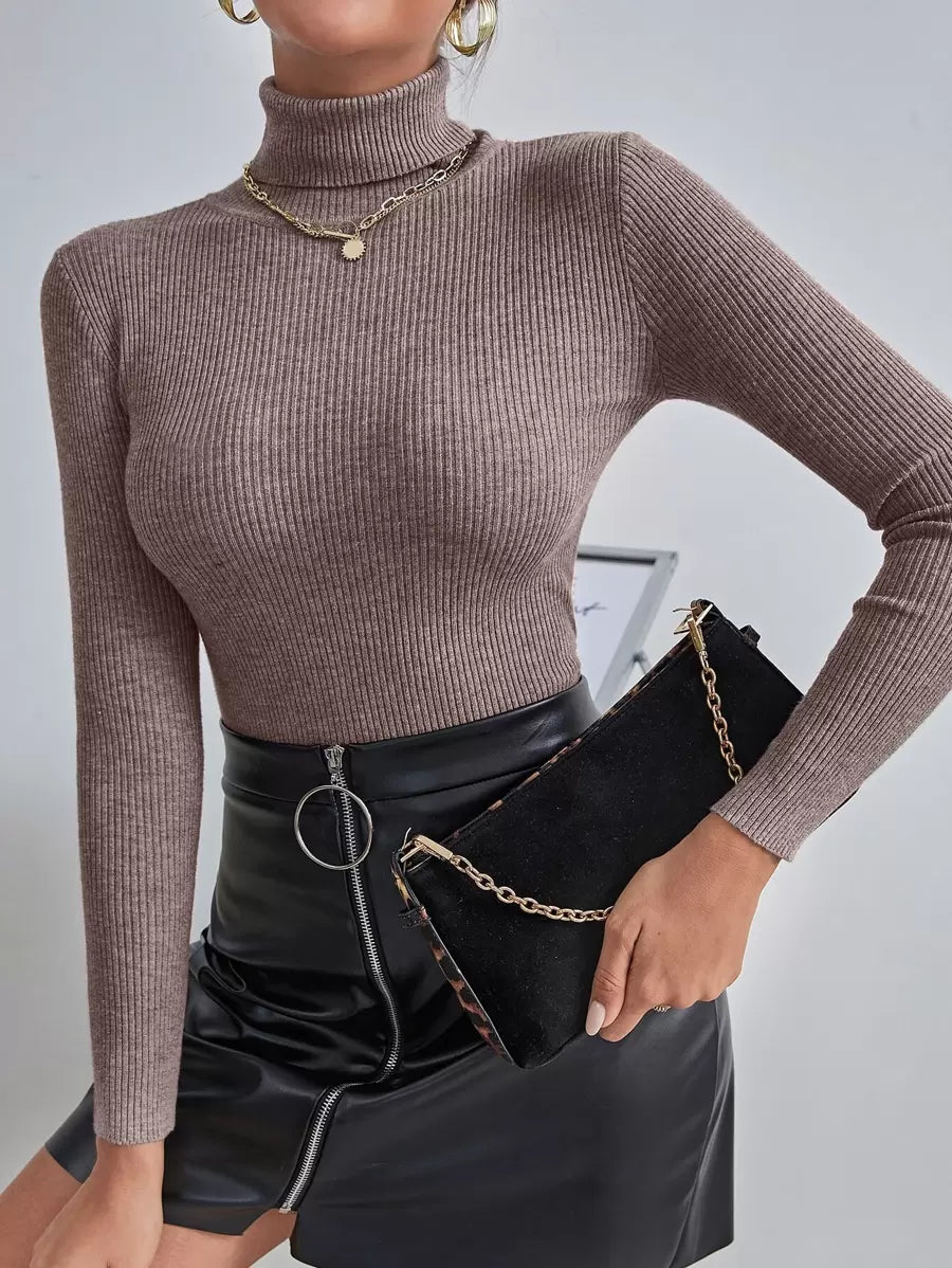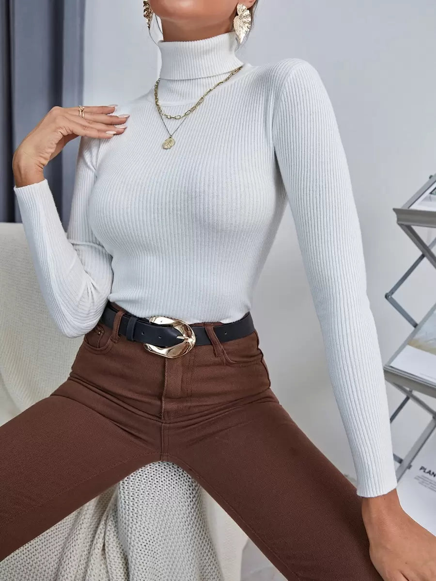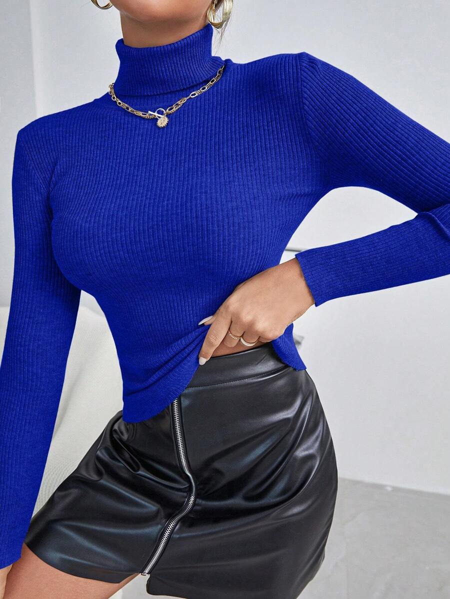 INAWLY Solid High Neck Rib Knit Sweater,Long Sleeve Tops Knit Pullover Fall Winter Outfit