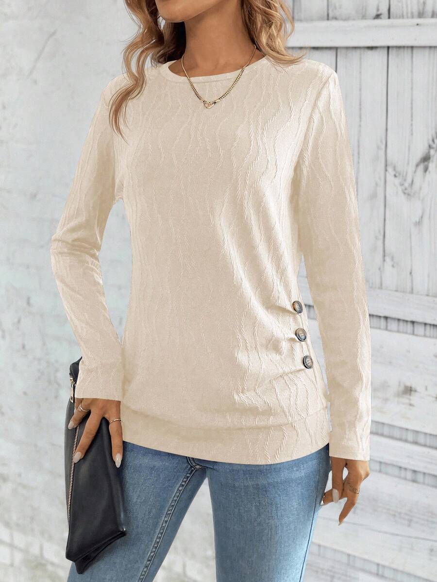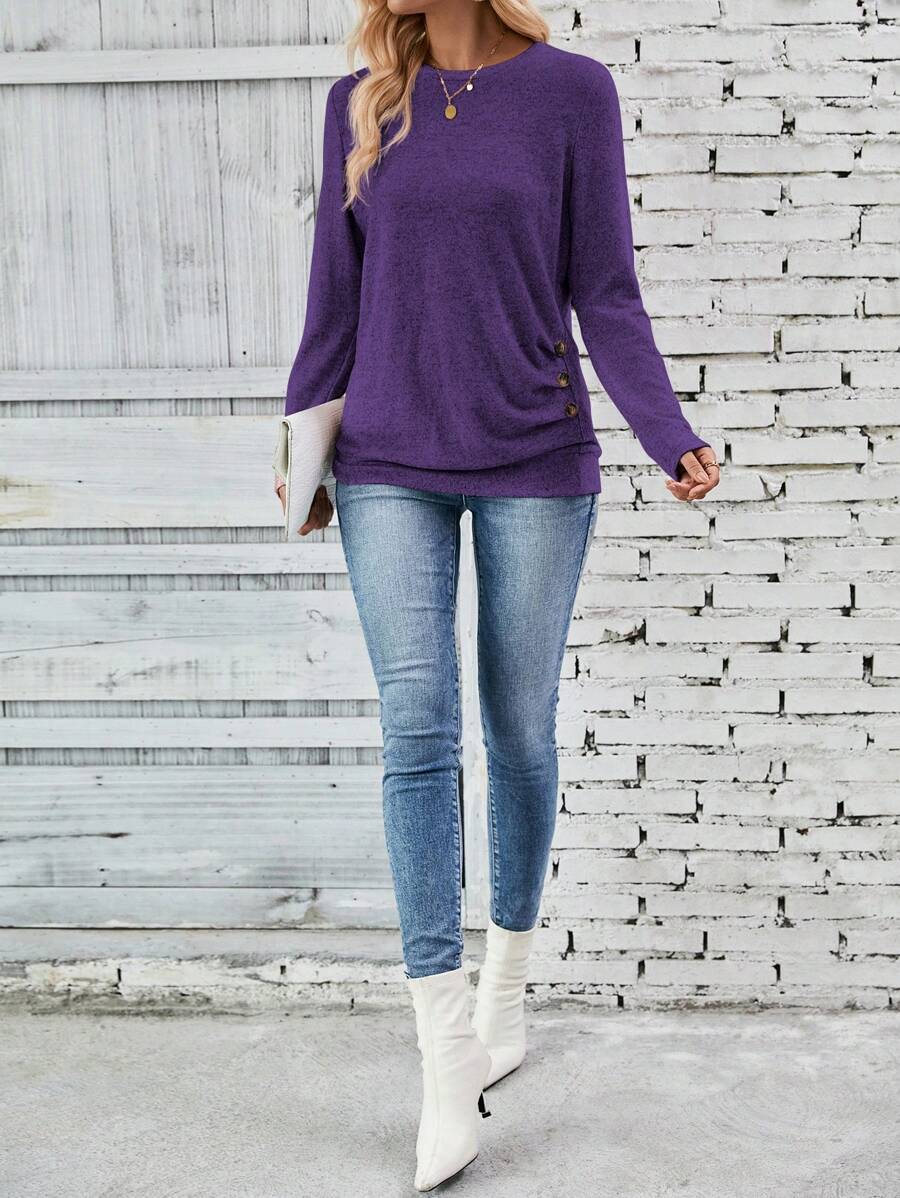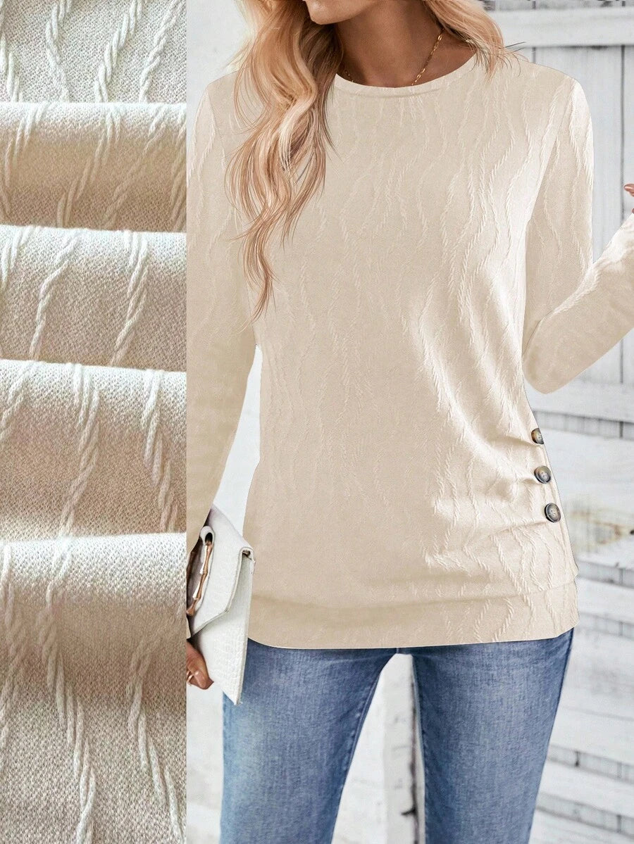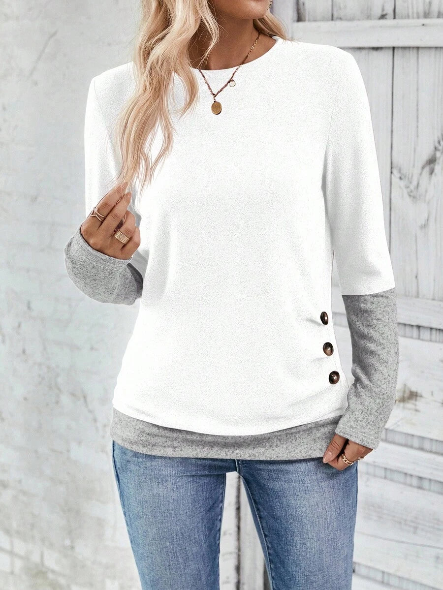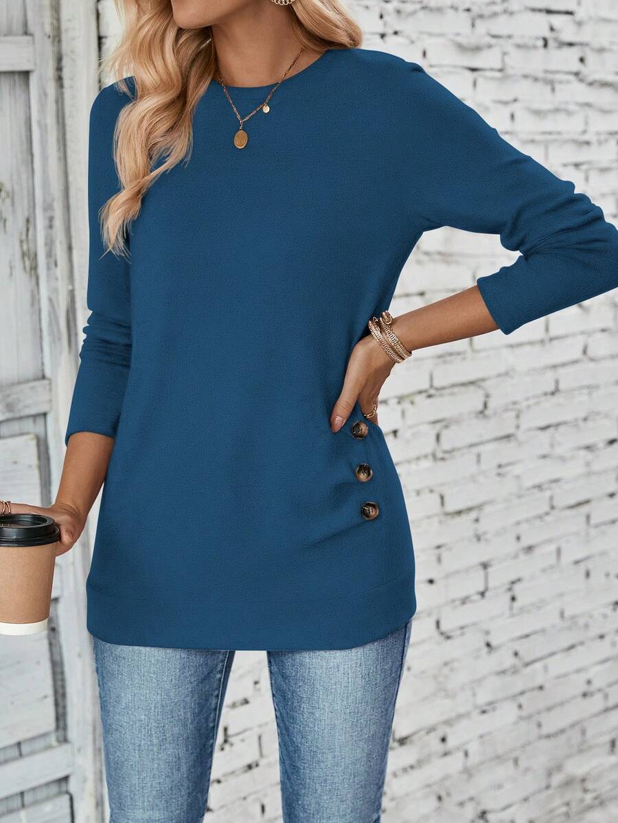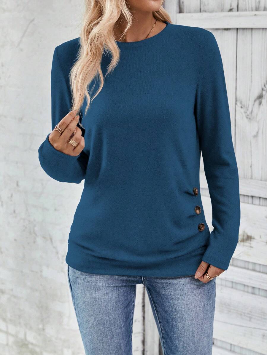 MAJA LUNE Ženska T-shirt dugih rukava s okruglim izrezom u jednobojnoj boji s bočnim dugmetom