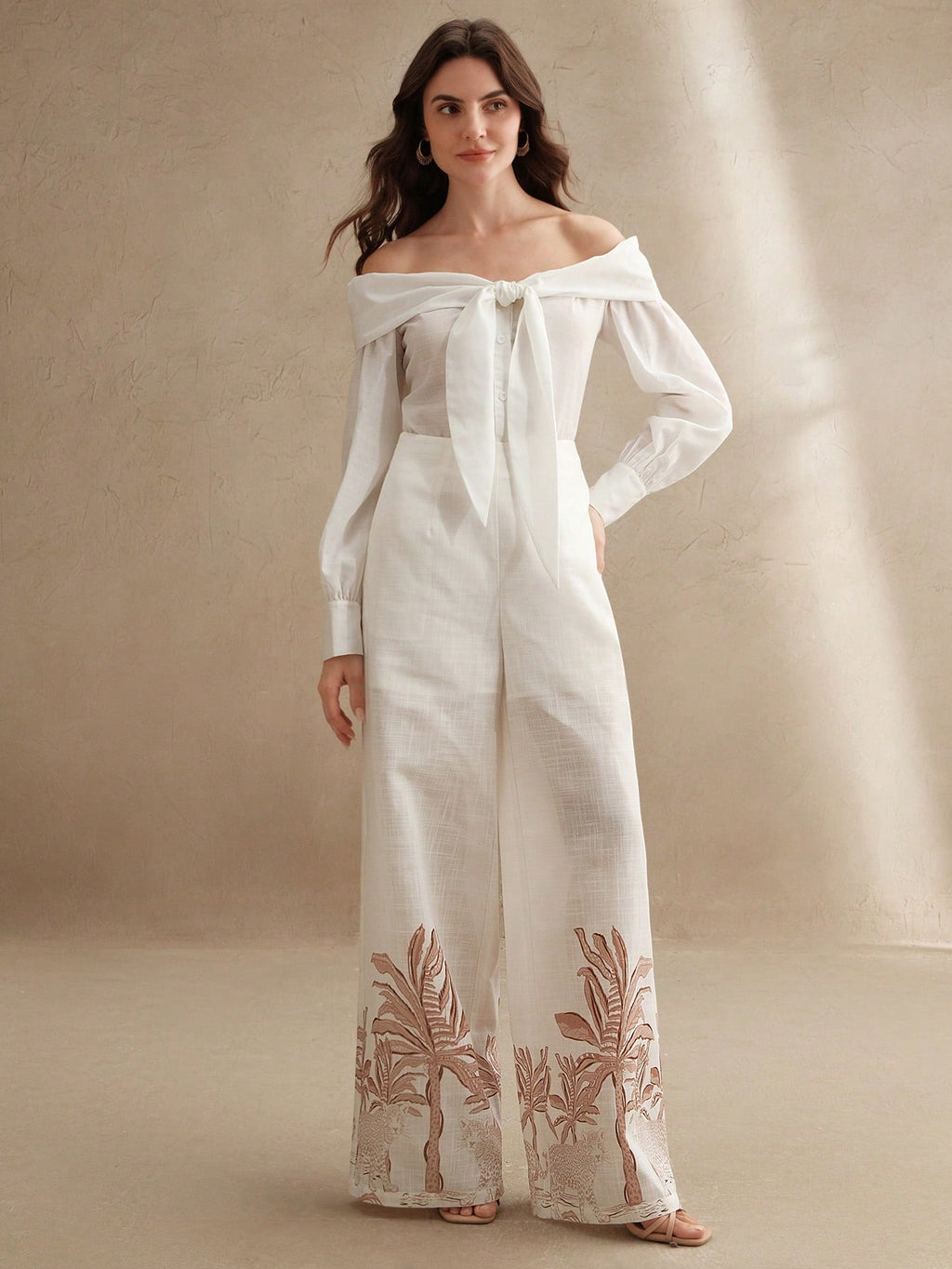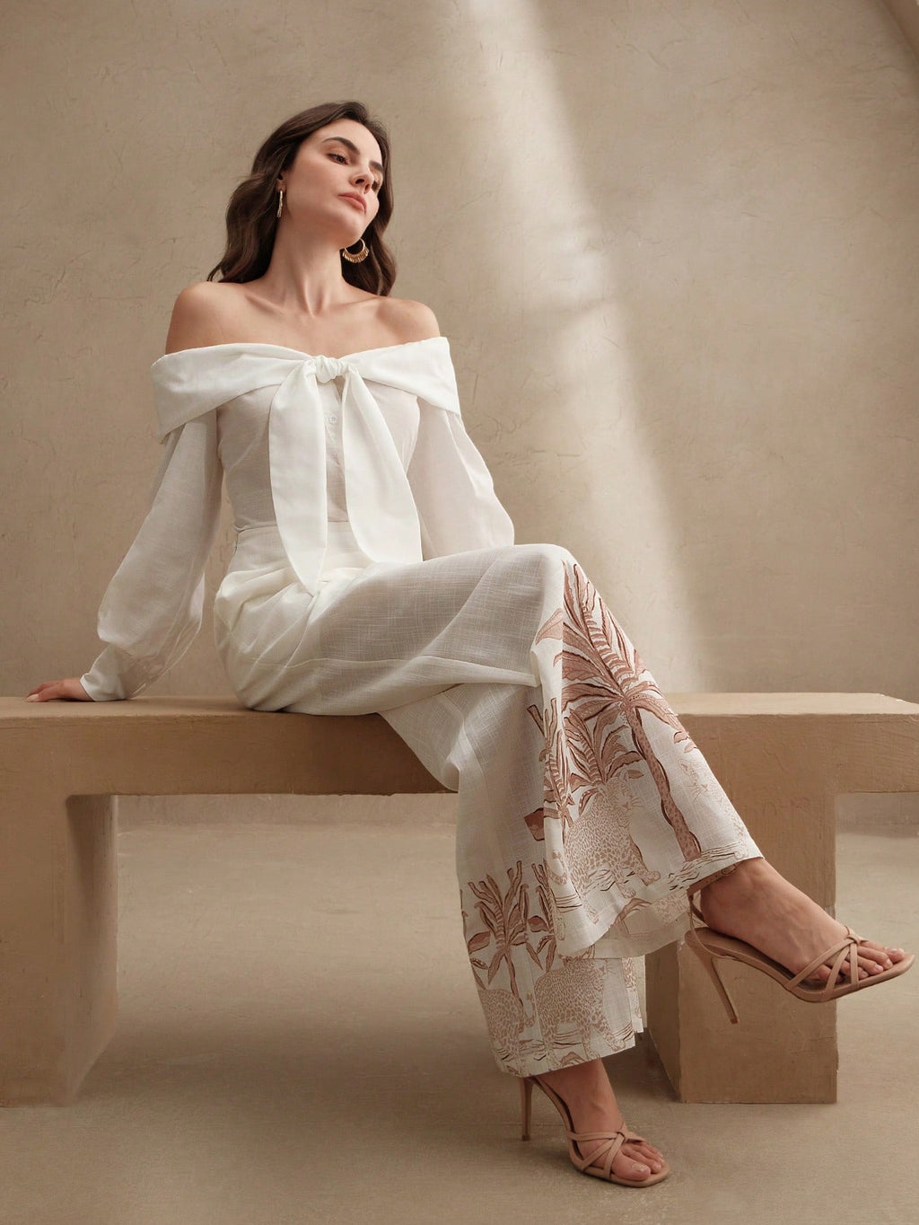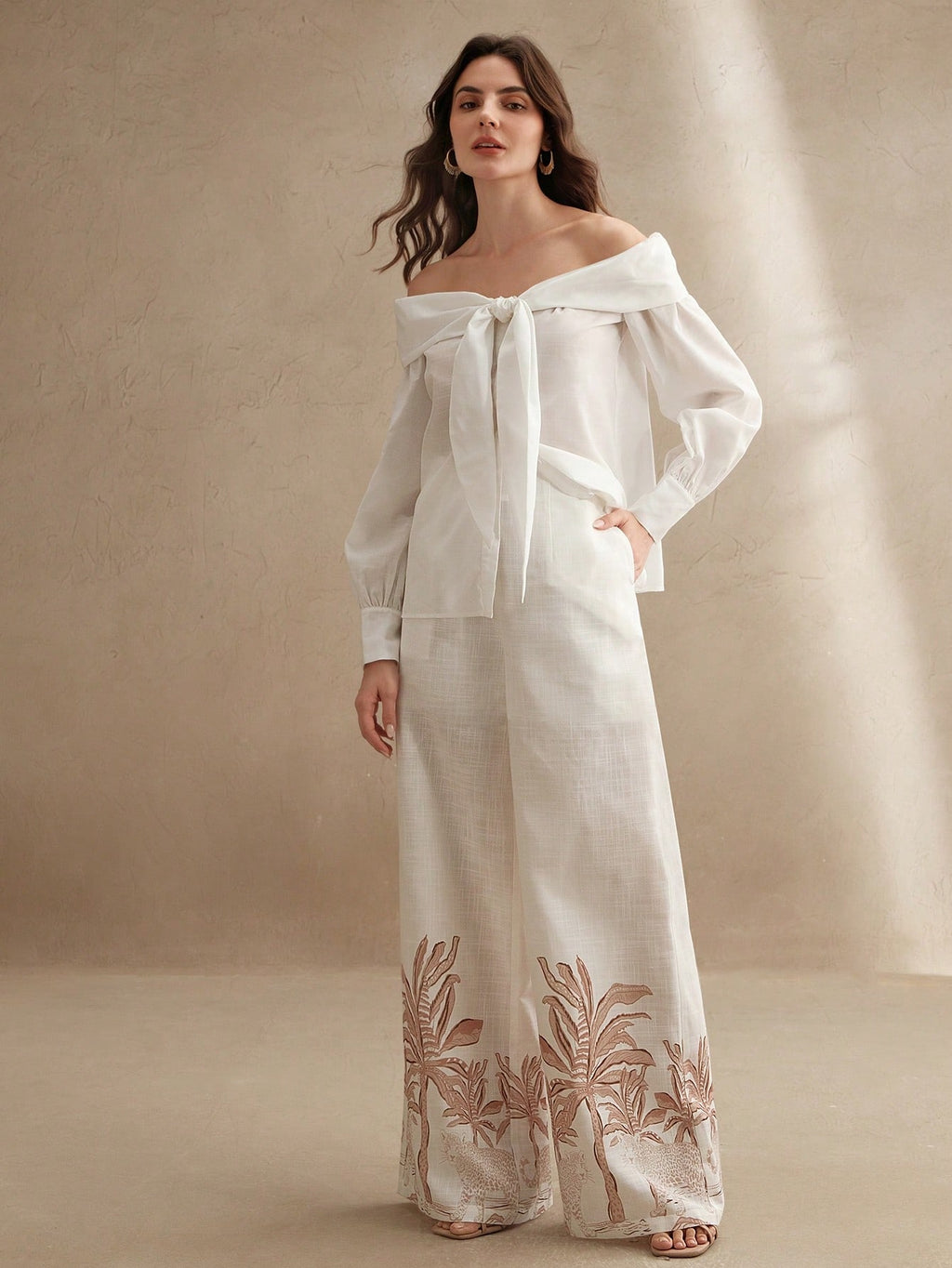MIU 1pc Off-Shoulder Long Sleeve Top And Plant Print Long Pants Set