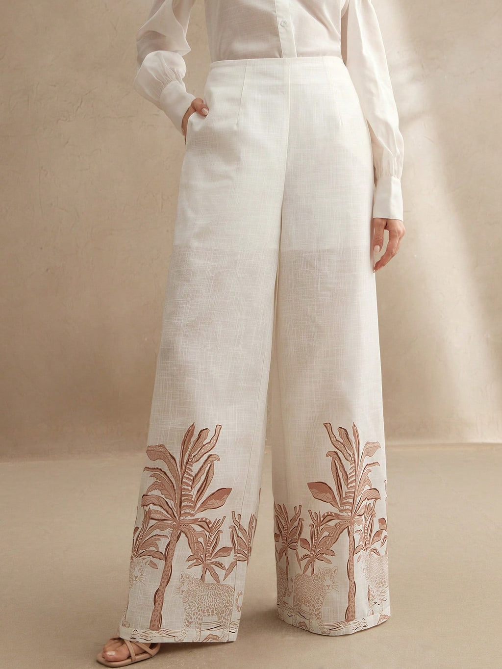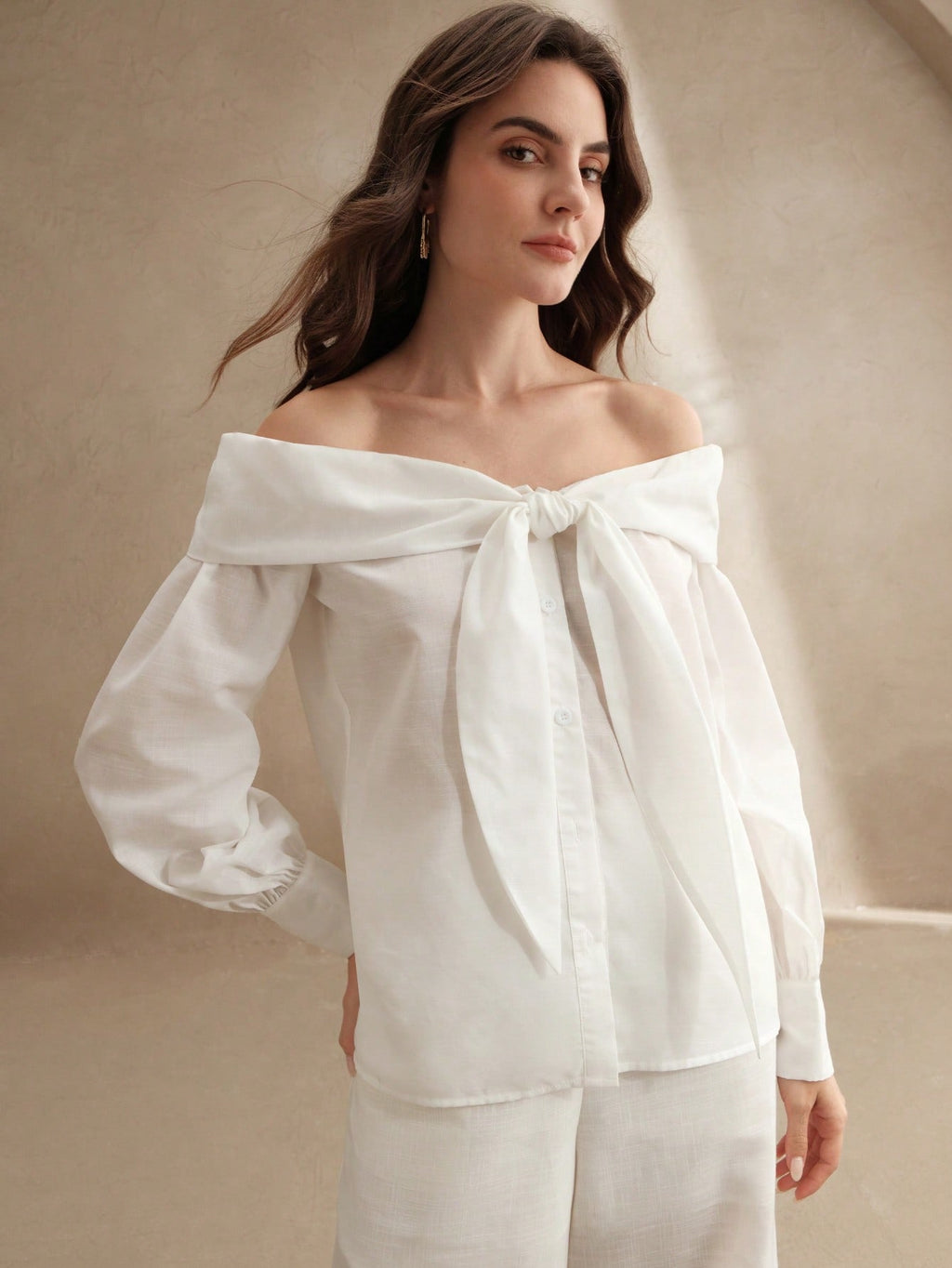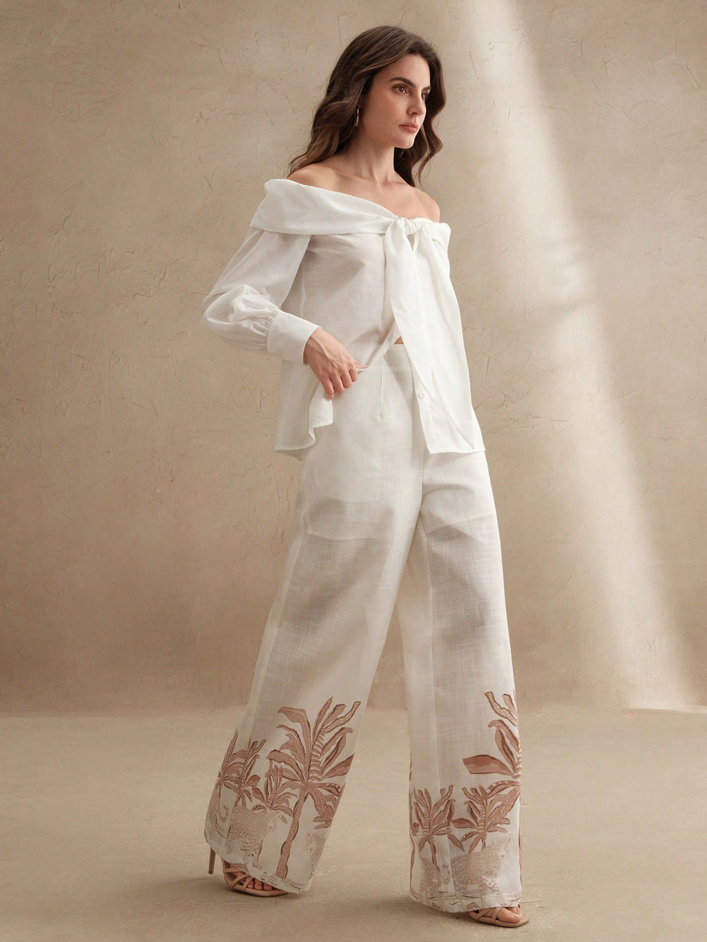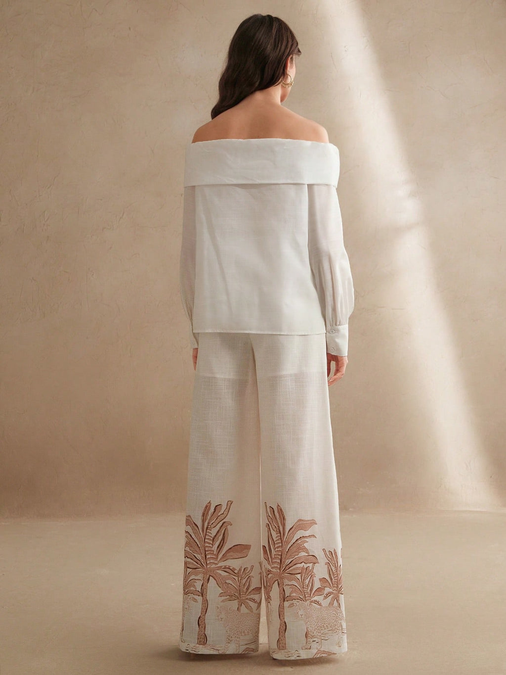 MIU 1pc Off-Shoulder Long Sleeve Top And Plant Print Long Pants Set