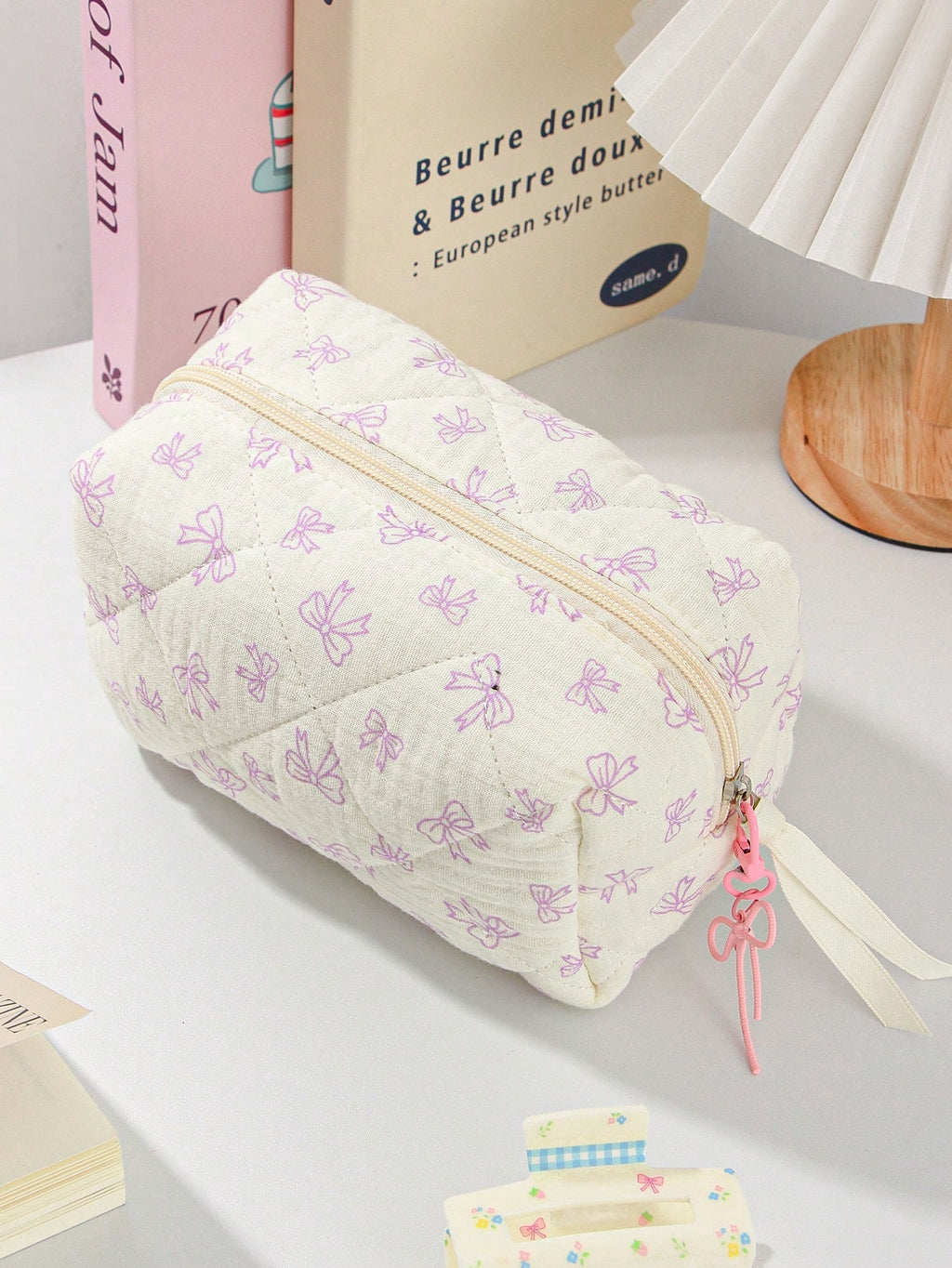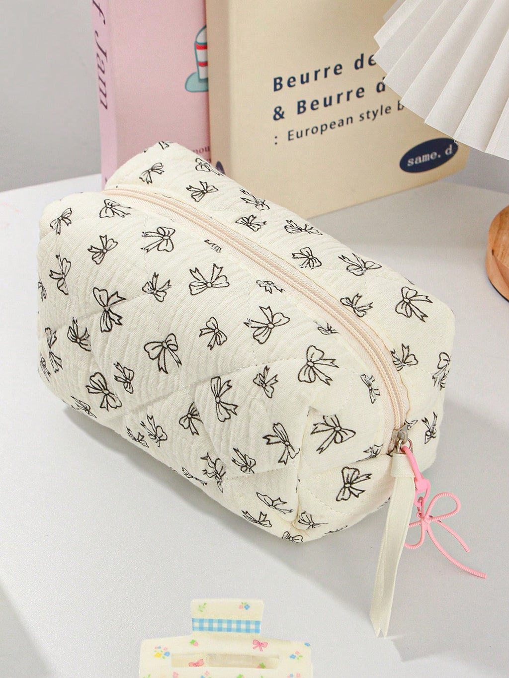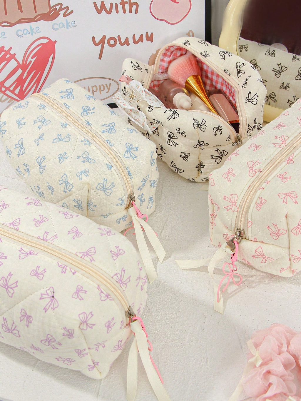 MIU 1Piece Quilted Handle Makeup Bag Small Quilted Cosmetic Bag Cute Bow Design Makeup Pouch Makeup Bag Aesthetic Travel Toiletry Bag Organizer Makeup Brushes Storage Bag For Women Bow Pencil Case For Makeup Pouch Skincare Bag