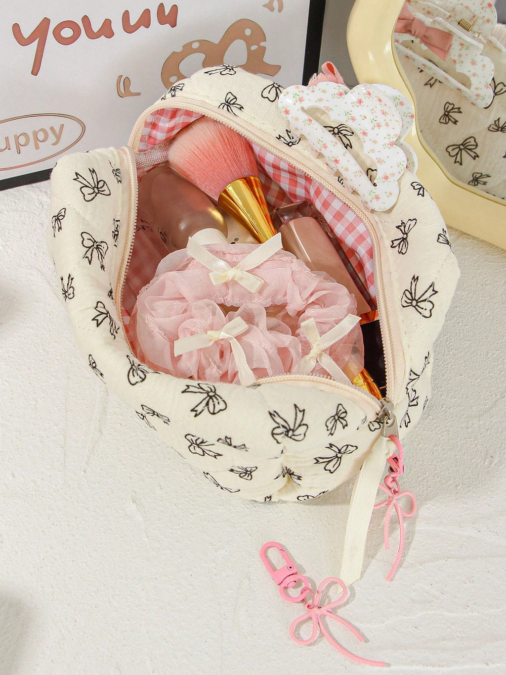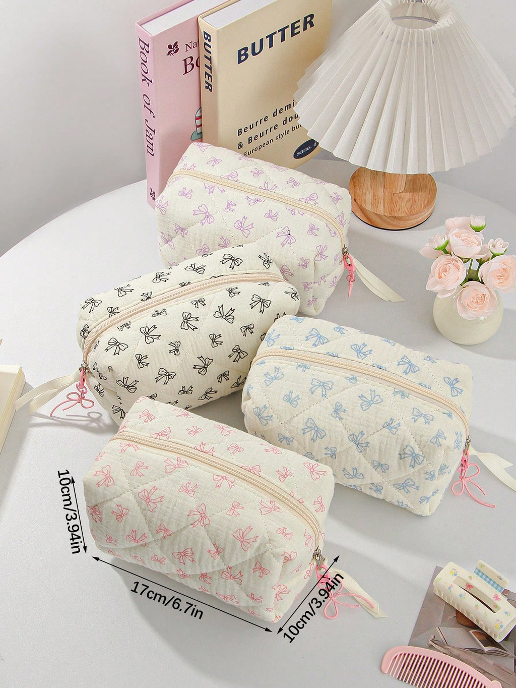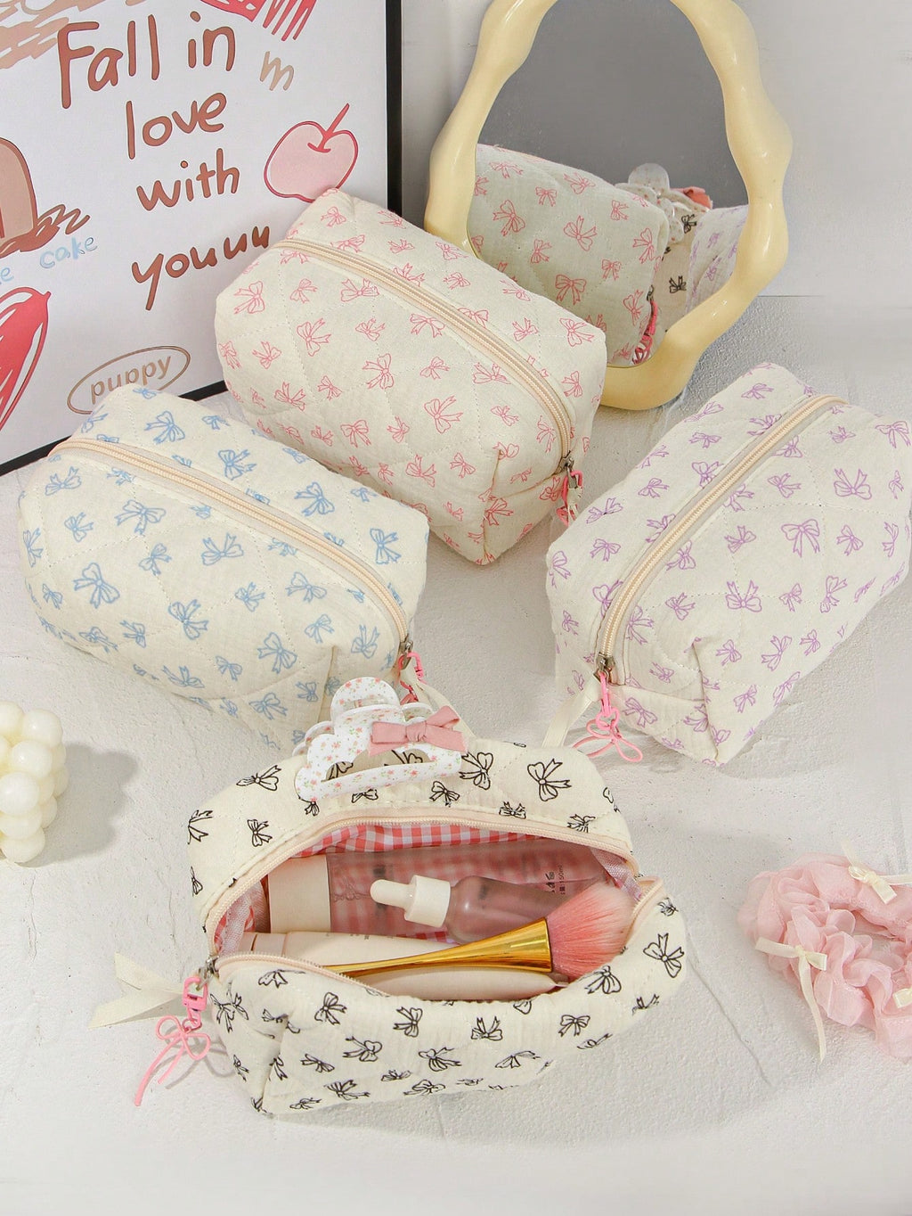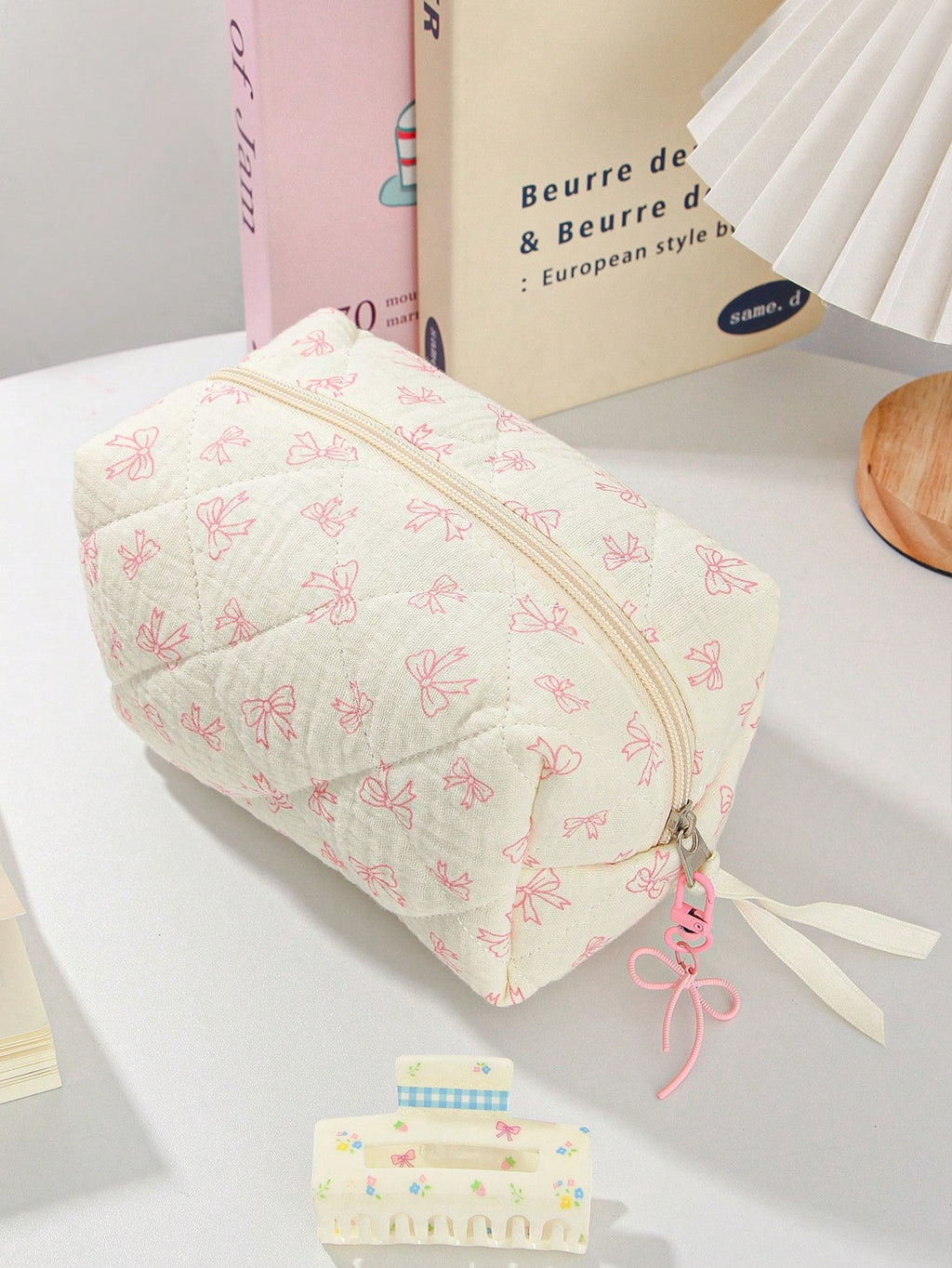 MIU 1Piece Quilted Handle Makeup Bag Small Quilted Cosmetic Bag Cute Bow Design Makeup Pouch Makeup Bag Aesthetic Travel Toiletry Bag Organizer Makeup Brushes Storage Bag For Women Bow Pencil Case For Makeup Pouch Skincare Bag