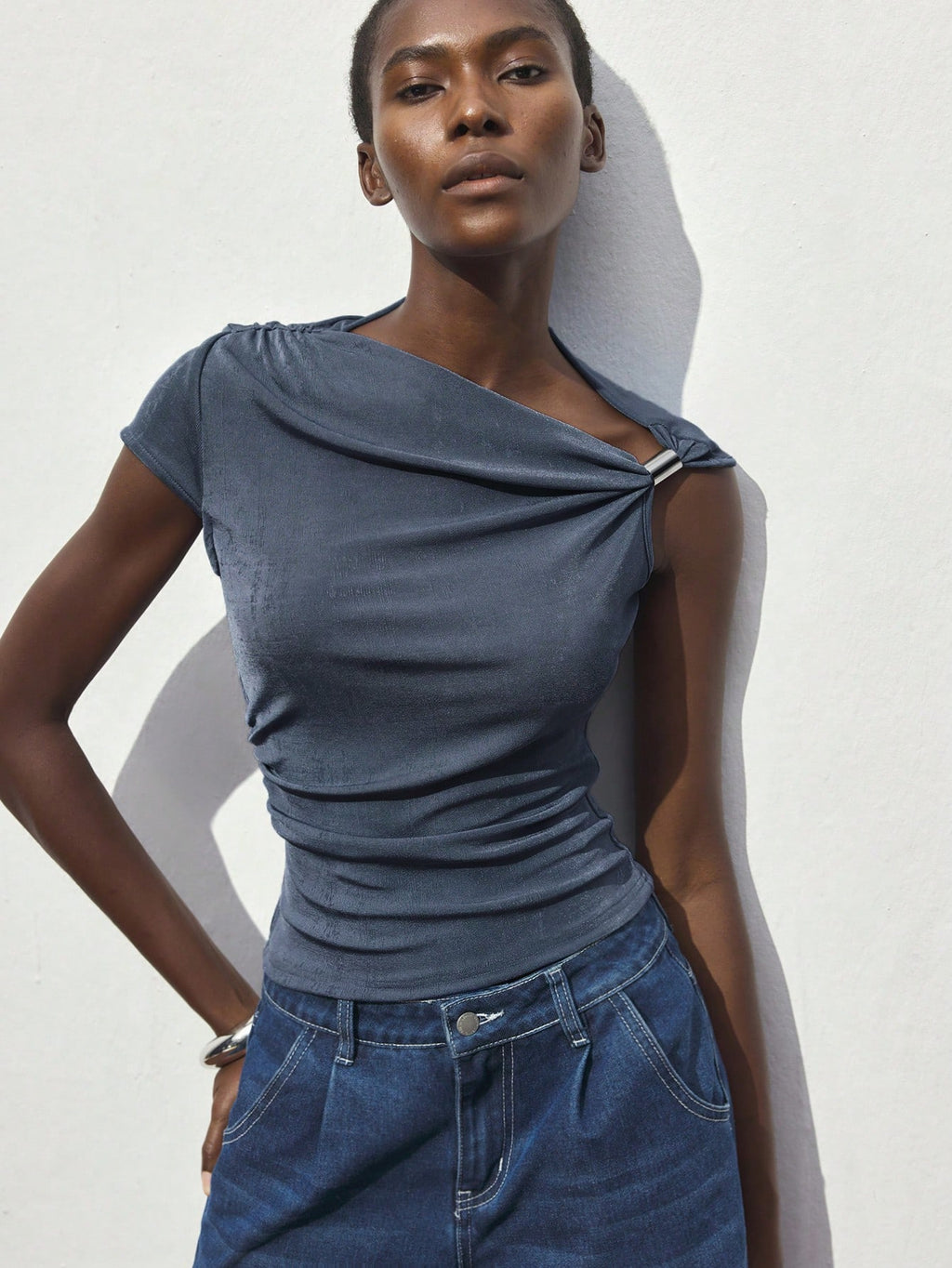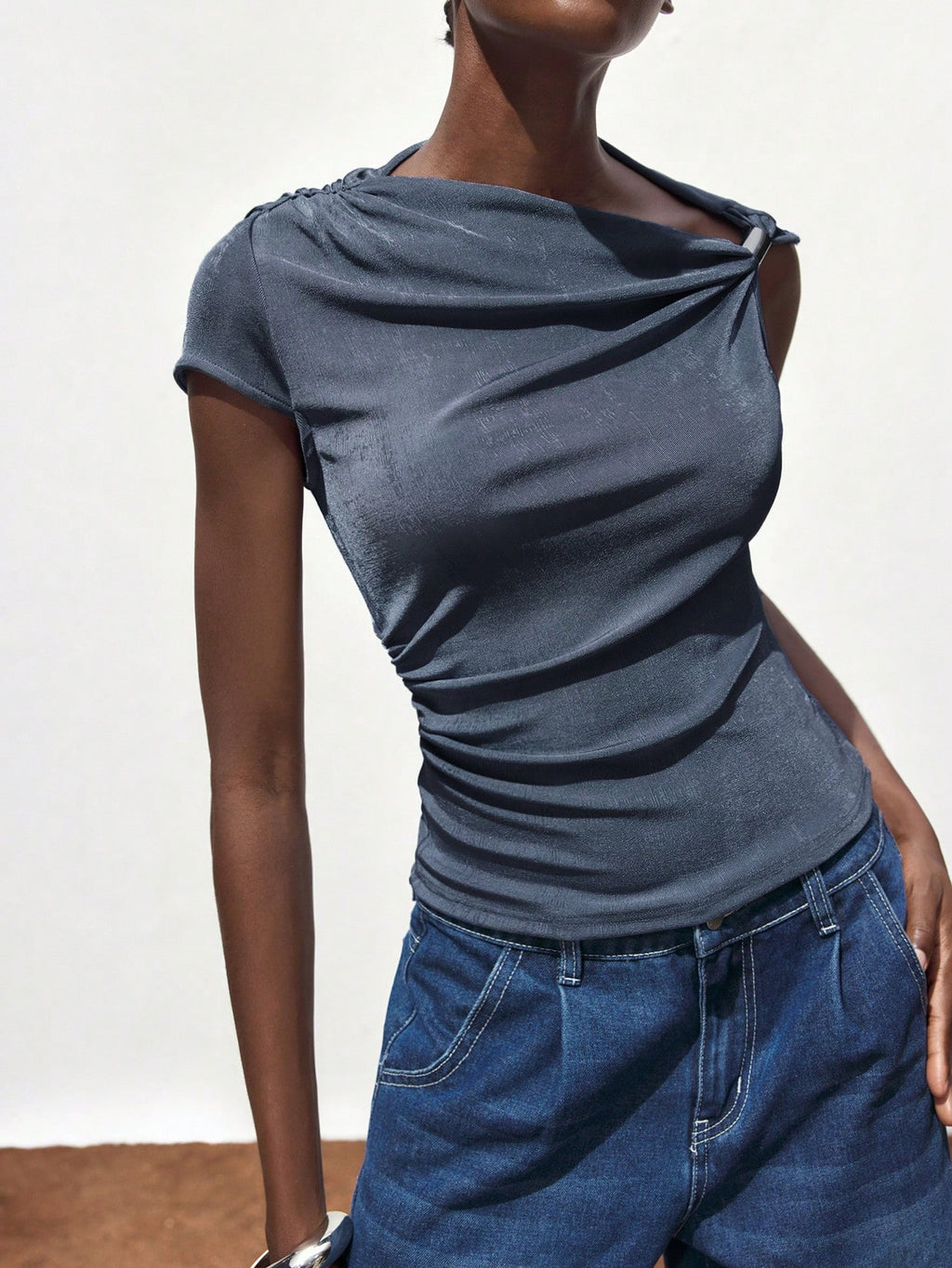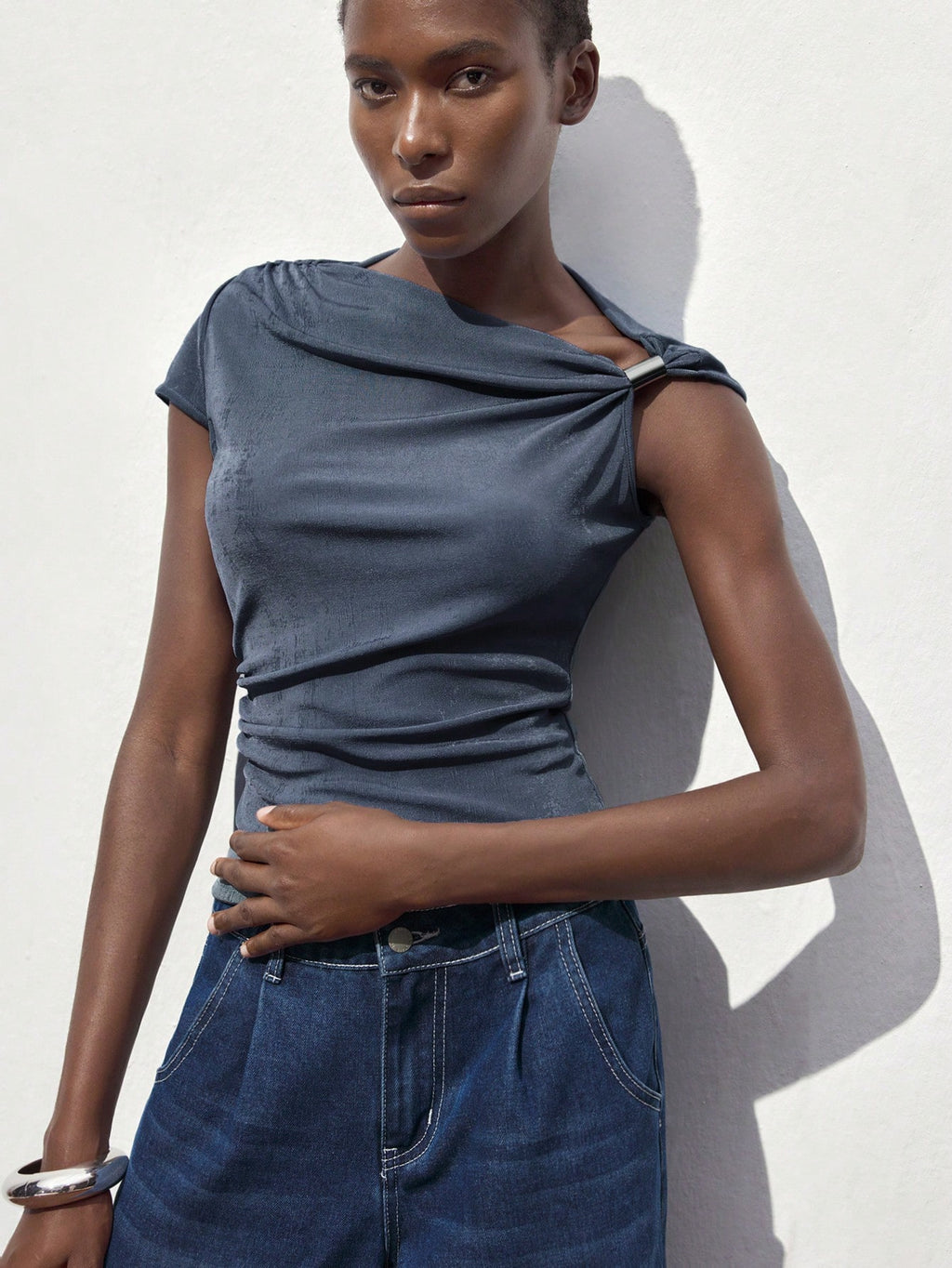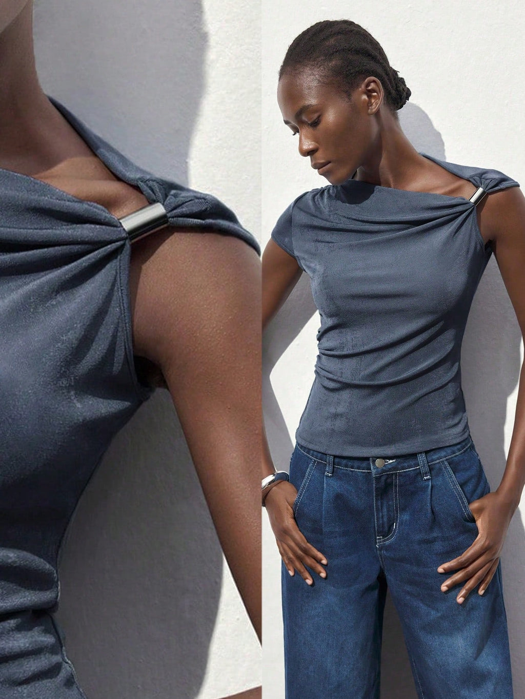 MIU 2025 Asymmetric Shoulder Metal Decor Modern City Fashionable Fitted Short Sleeve Blue T-Shirt For Women, Suitable For Spring/Summer Vacation, Music Festival, Easter Party, Retro Chic 4th Of July Women Graduation Cute Tops