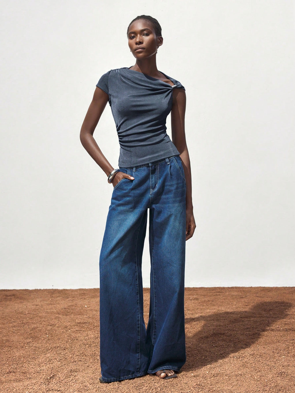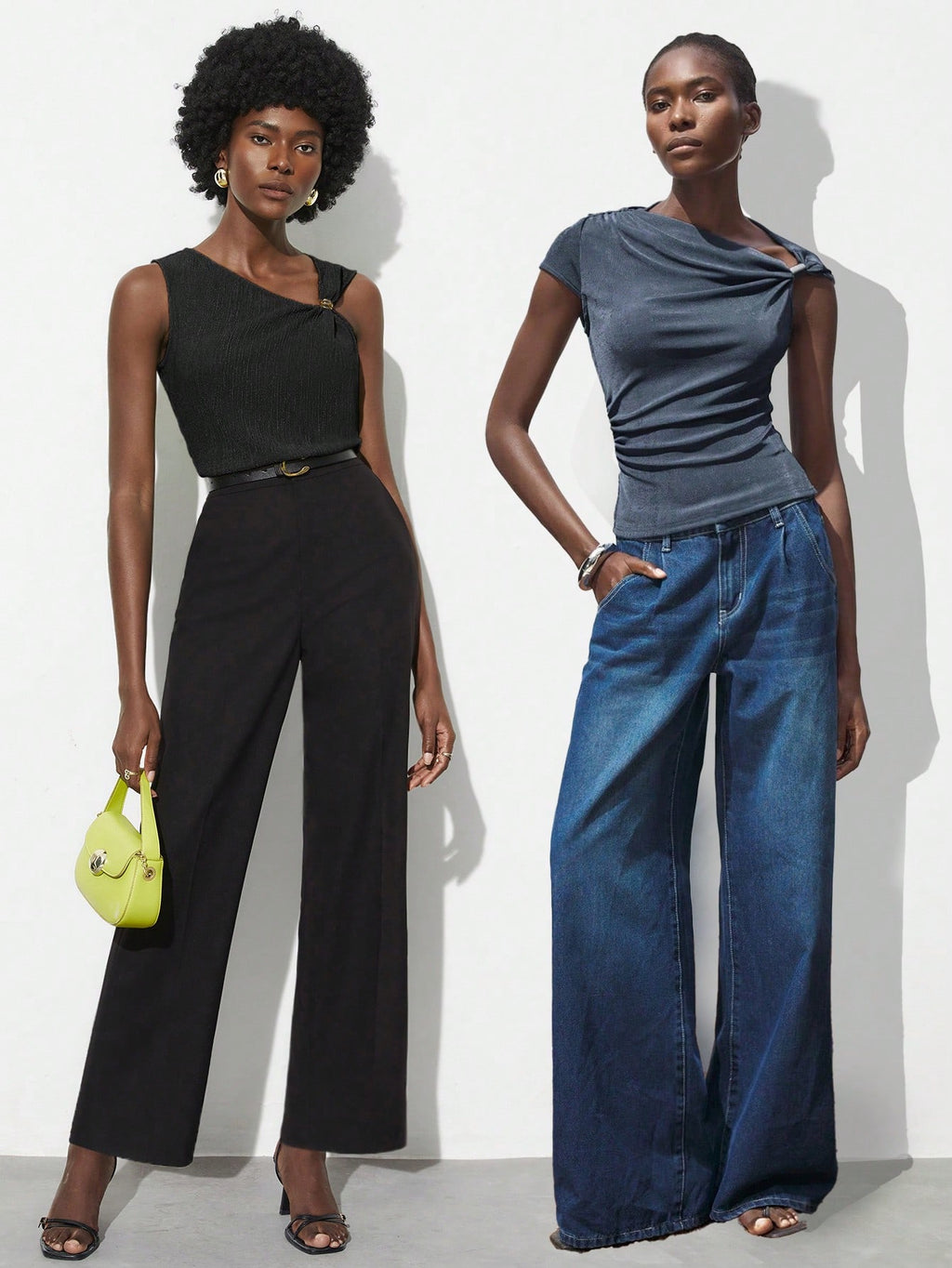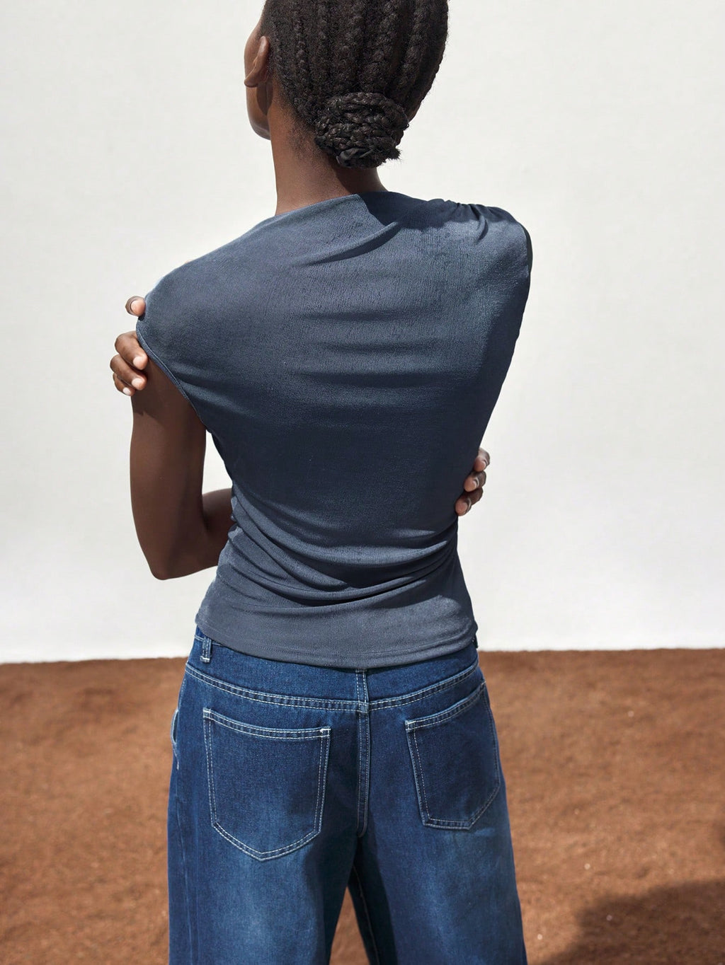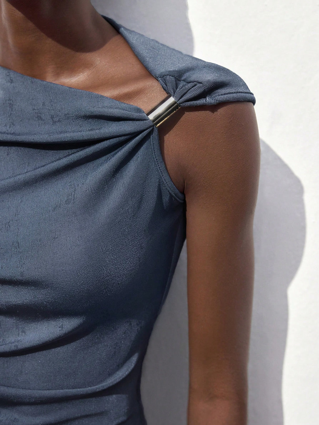 MIU 2025 Asymmetric Shoulder Metal Decor Modern City Fashionable Fitted Short Sleeve Blue T-Shirt For Women, Suitable For Spring/Summer Vacation, Music Festival, Easter Party, Retro Chic 4th Of July Women Graduation Cute Tops