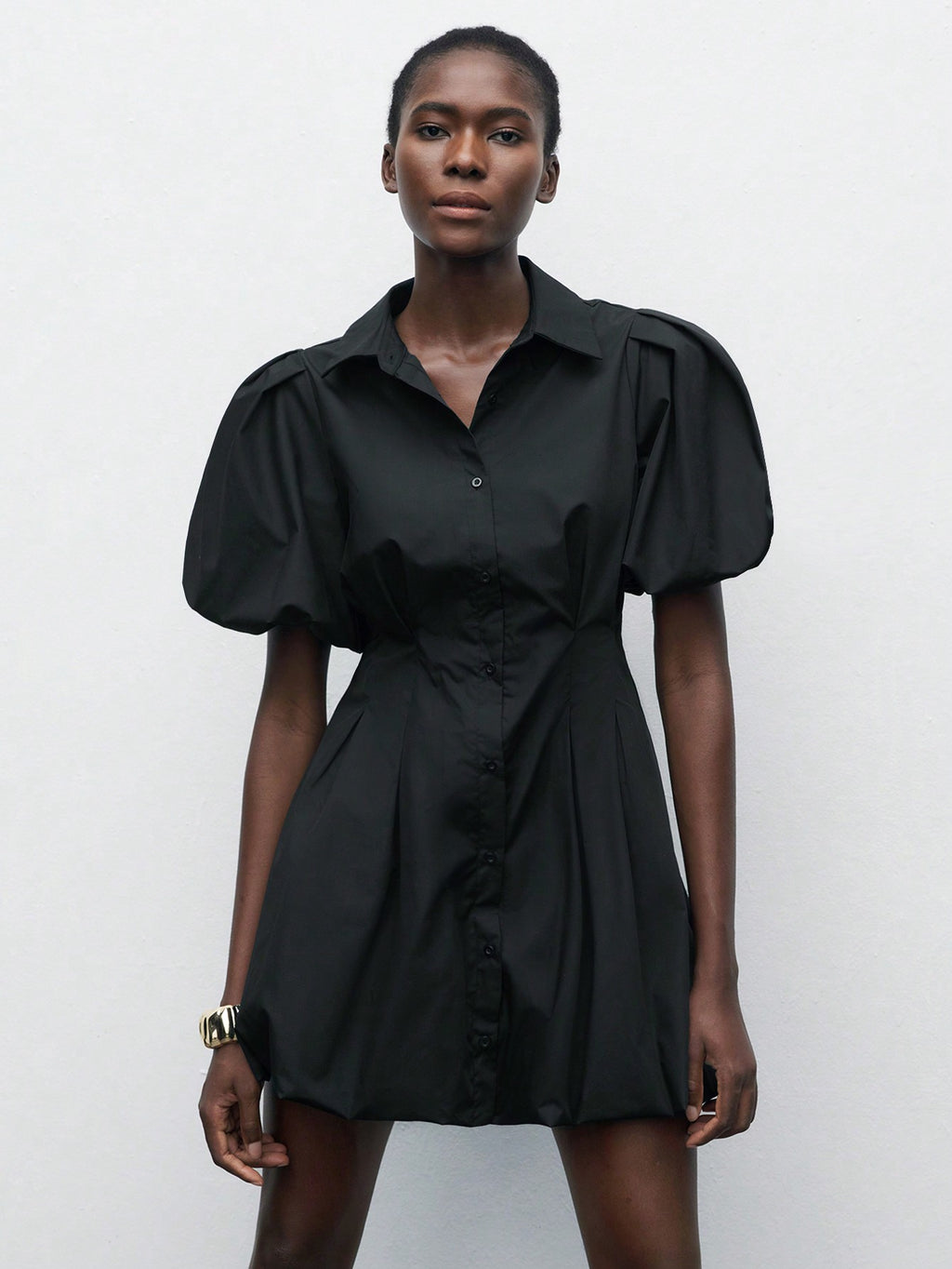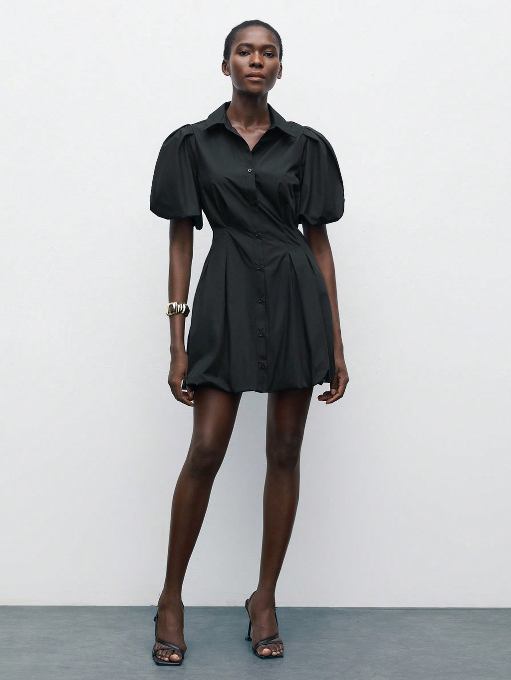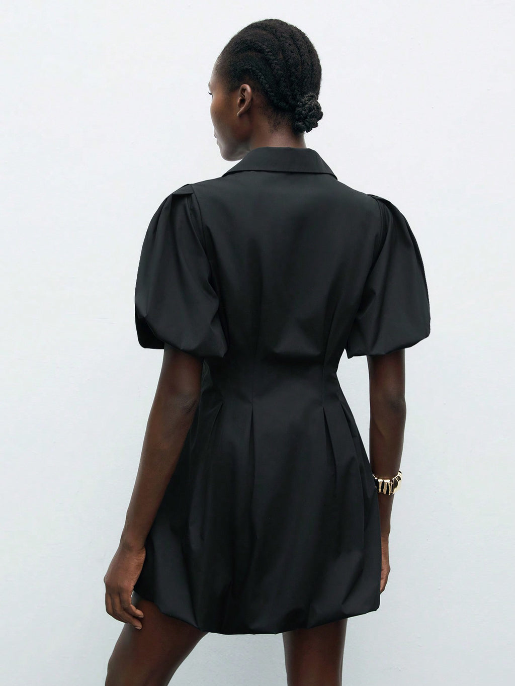 MIU 2025 Spring Summer Early Autumn Independence Day July Outfit Graduation Season Puff Sleeve Floral Bubble Dress With Fitted Waist, Single Row Button Front Shirt Collar, Short Black Dress For Women, Suitable For Resort, Beach, Casual And Cruise Travel