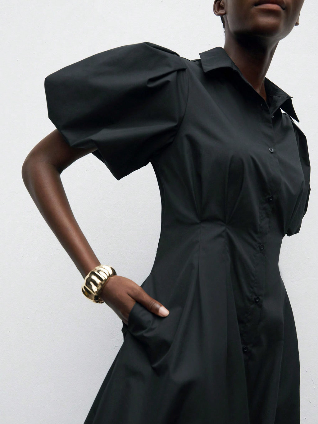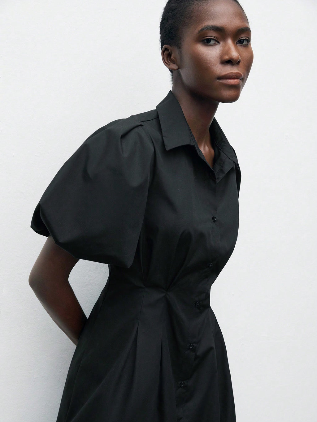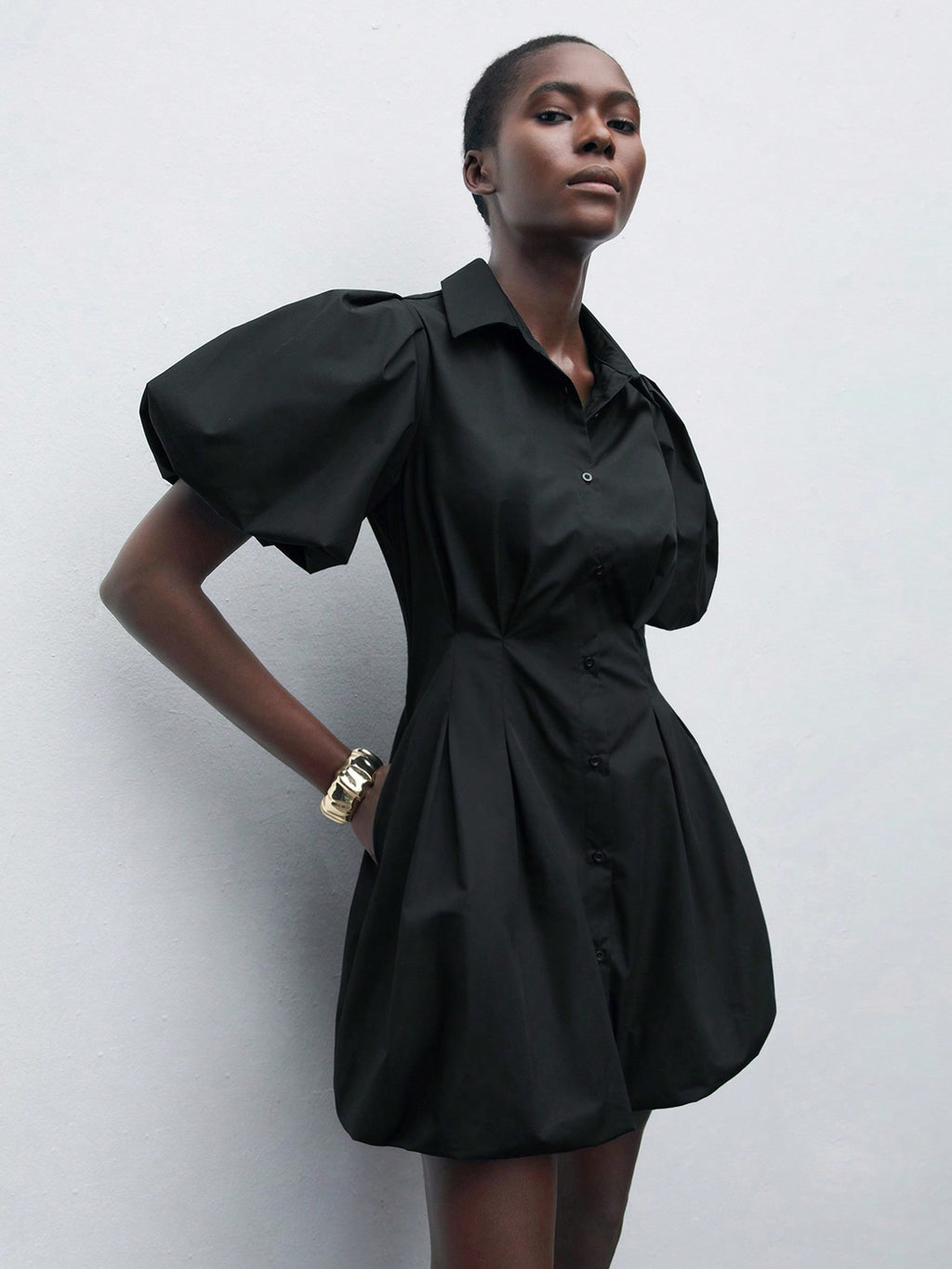 MIU 2025 Spring Summer Early Autumn Independence Day July Outfit Graduation Season Puff Sleeve Floral Bubble Dress With Fitted Waist, Single Row Button Front Shirt Collar, Short Black Dress For Women, Suitable For Resort, Beach, Casual And Cruise Travel