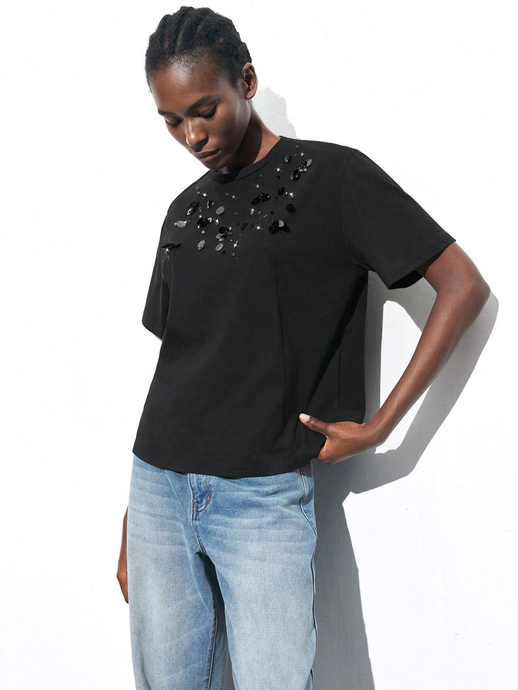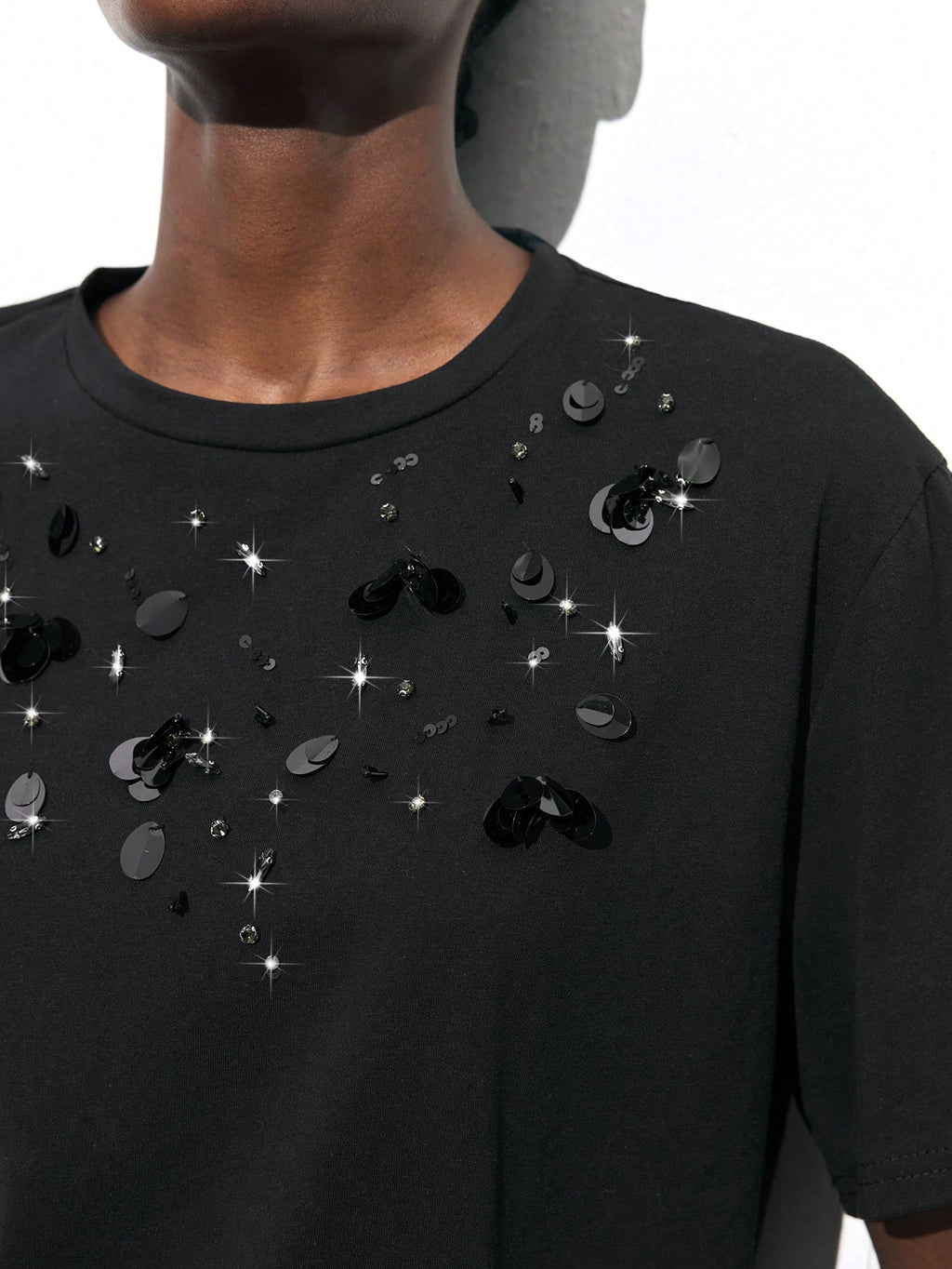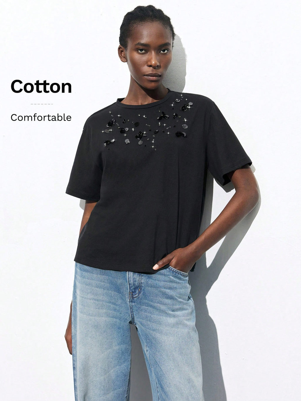 MIU 2025 Summer Women Black Crew Neck Short Sleeve Top, Slim Fit, Embroidered Beaded Design, Versatile Casual Commuting Chic Urban Daily Wear, Music Festival, Beach Holiday, Graduation, St. Patrick's Day, Spring Break, Easter