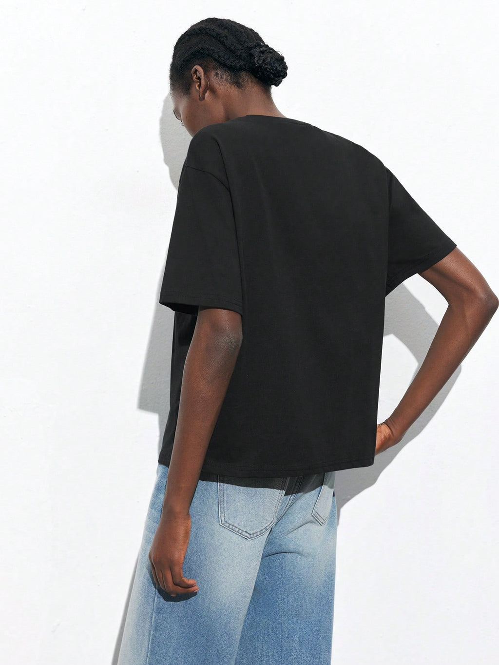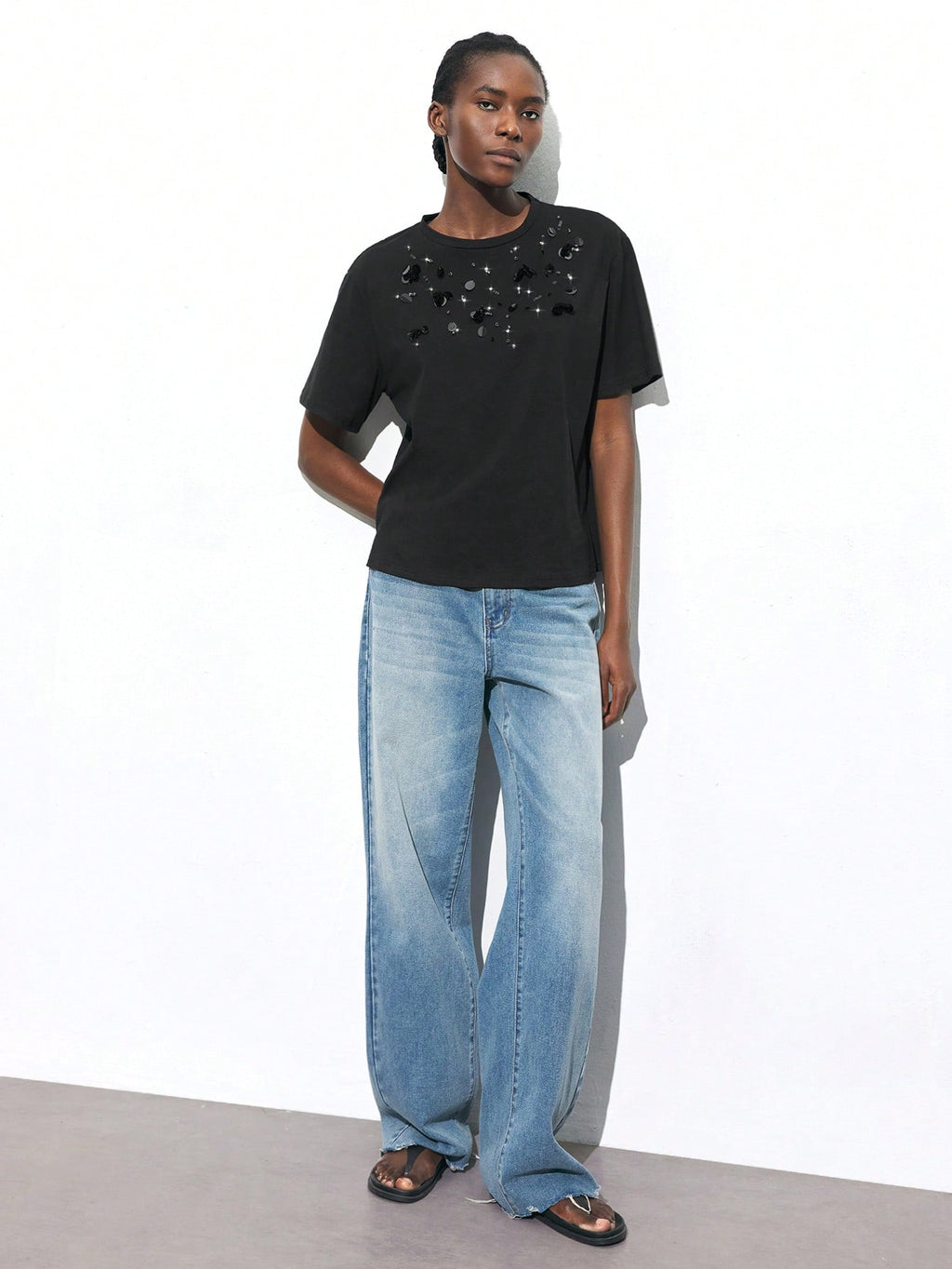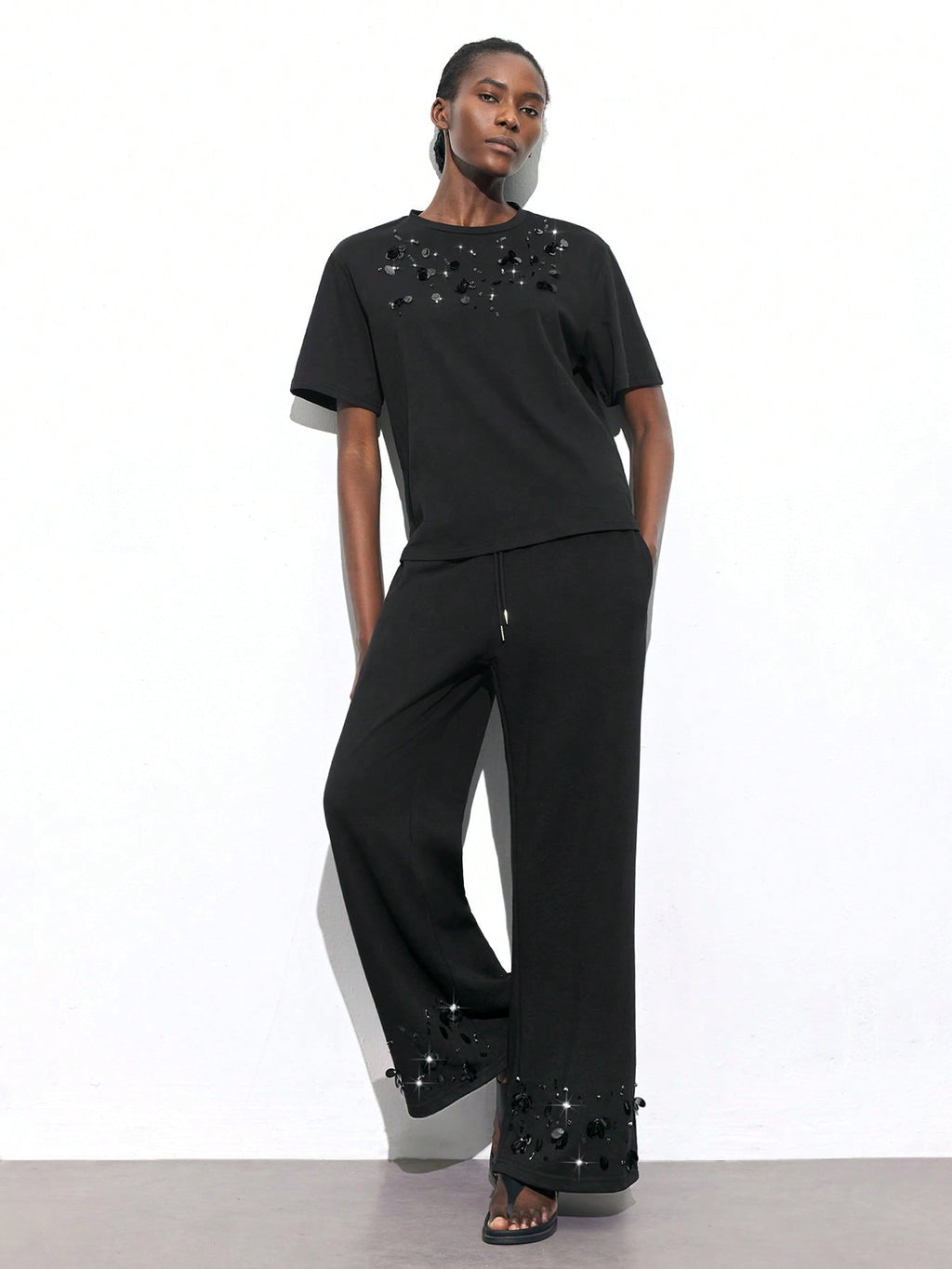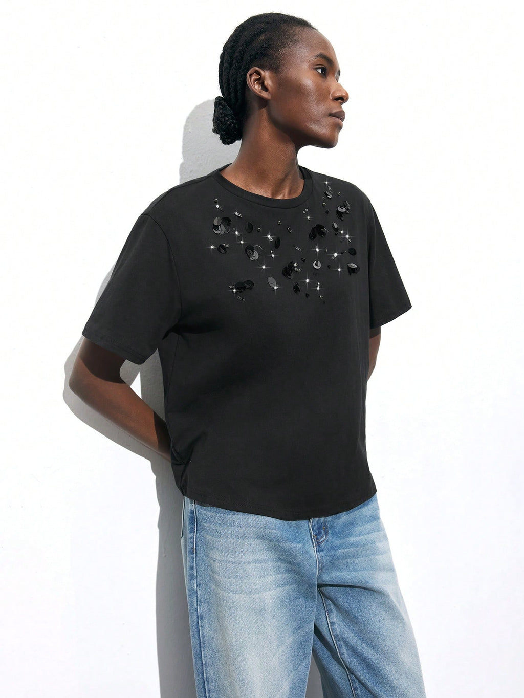 MIU 2025 Summer Women Black Crew Neck Short Sleeve Top, Slim Fit, Embroidered Beaded Design, Versatile Casual Commuting Chic Urban Daily Wear, Music Festival, Beach Holiday, Graduation, St. Patrick's Day, Spring Break, Easter