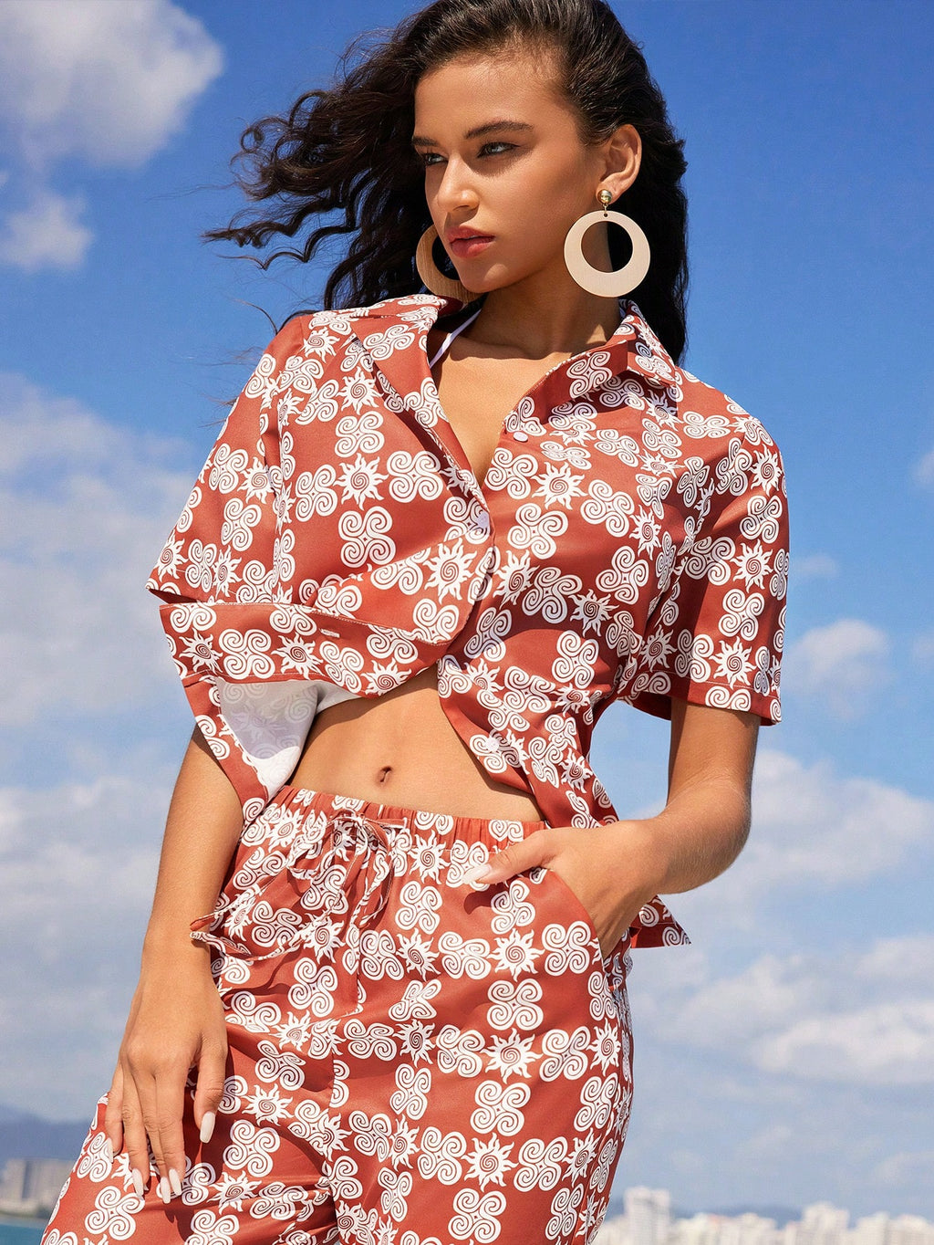 MIU 2pcs Anewsta Vacation Yacht Casual Nature Printed Sexy Knotted Blouse And Lounge Pants Set For Women