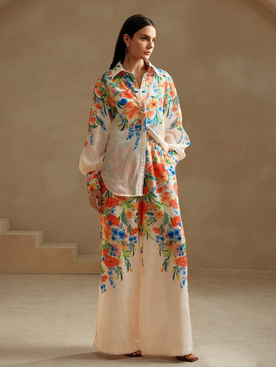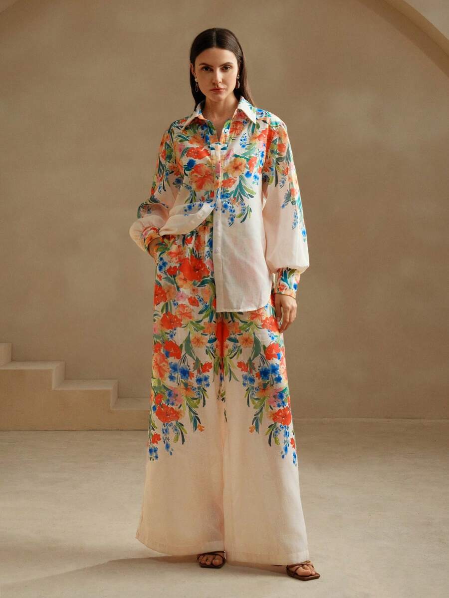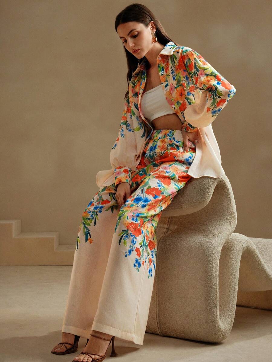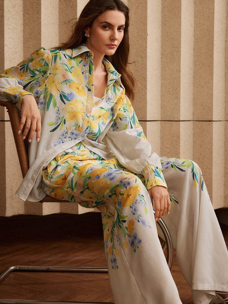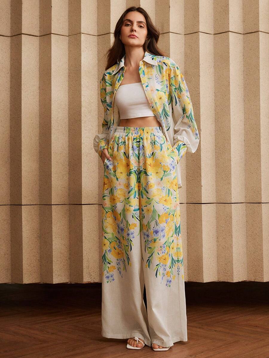 MIU 2pcs Floral Printed Ladies' Shirt And Pants Set, Holiday