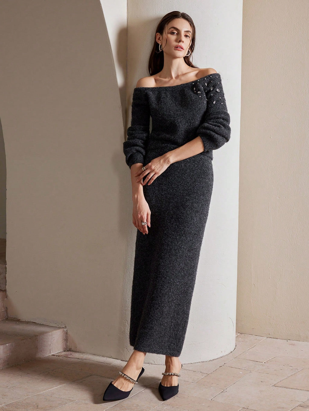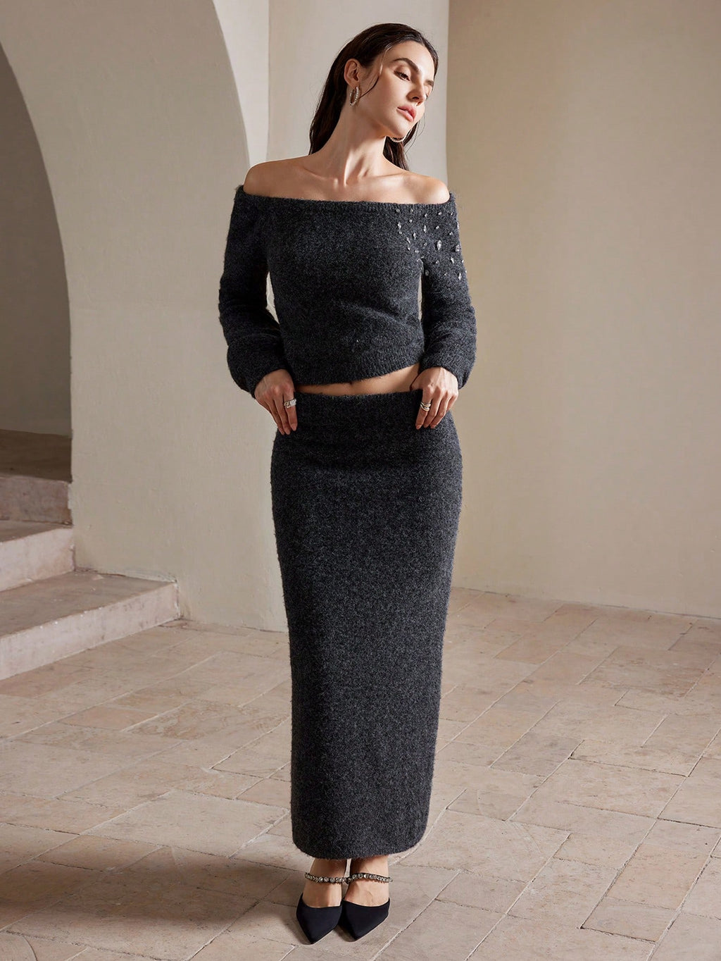 MIU 2pcs Set Elegant French Style Loose Fit Gray Rhinestone Decor Women Sweater