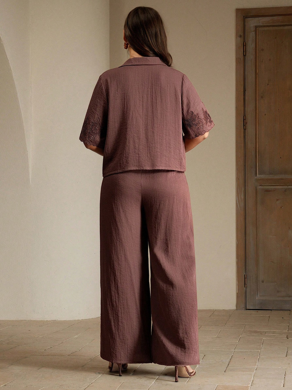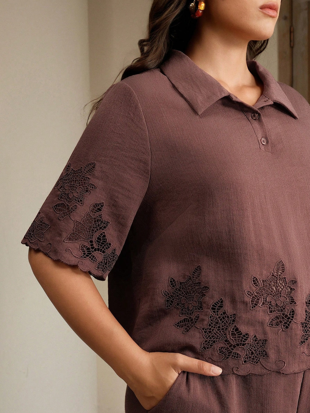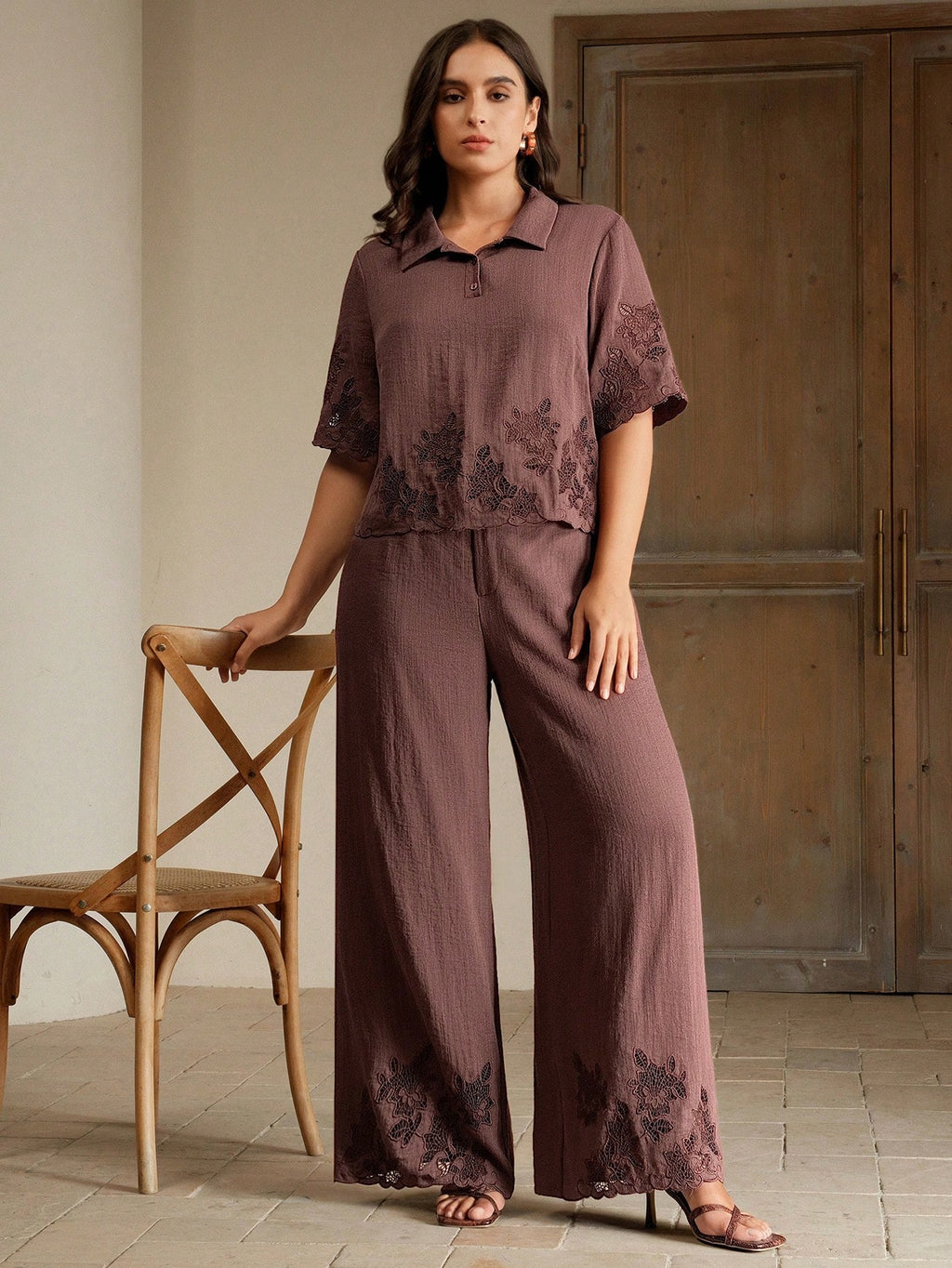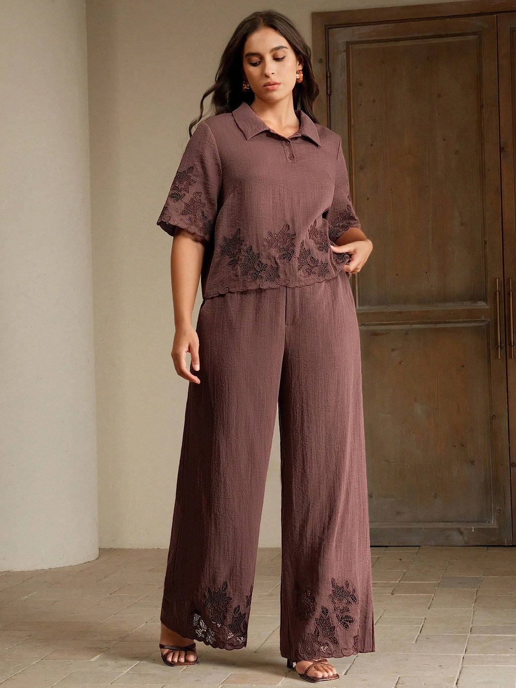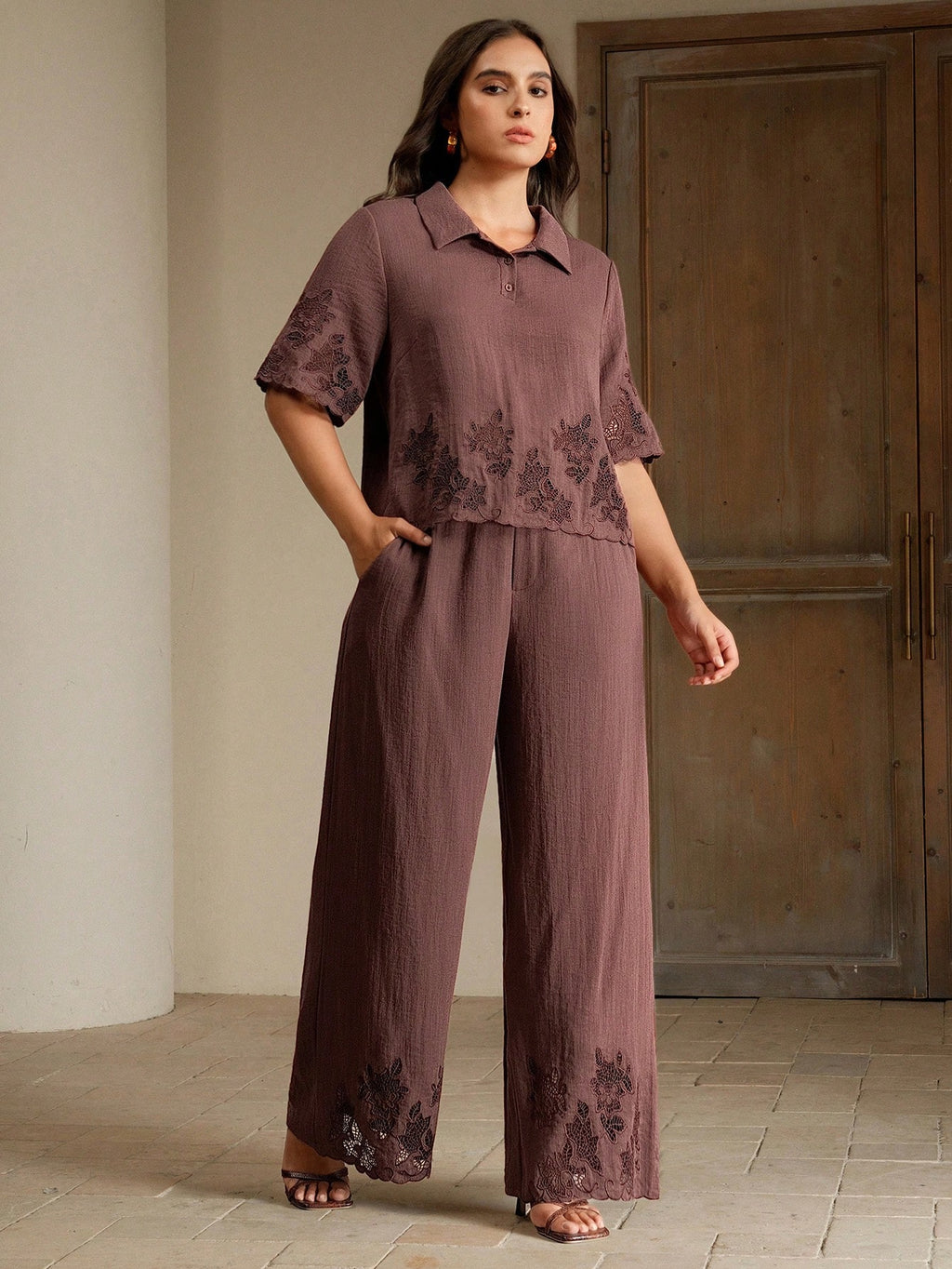 MIU 2pcs Set Summer New Polo Collar Design Heavy Embroidery Short Sleeve Top And Pants Plus Size