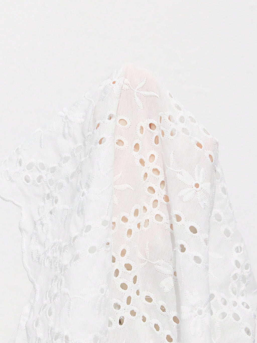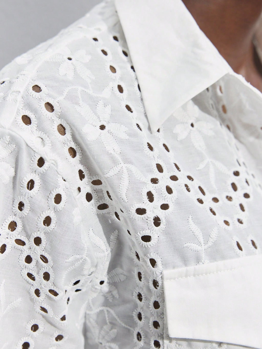MIU 2pcs/Set Women Casual Elegant White Embroidered Openwork Design Modern Vacation Fashion Solid Color Openwork Shirt
