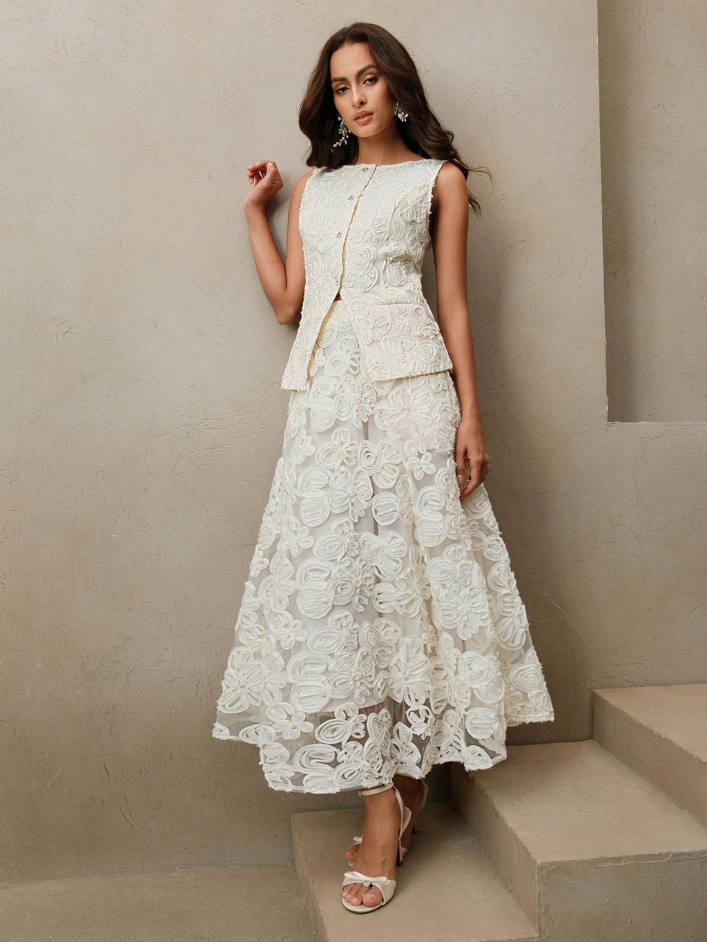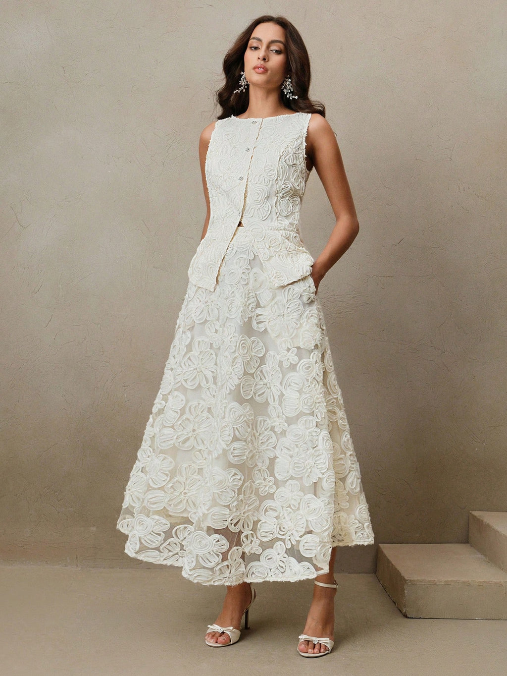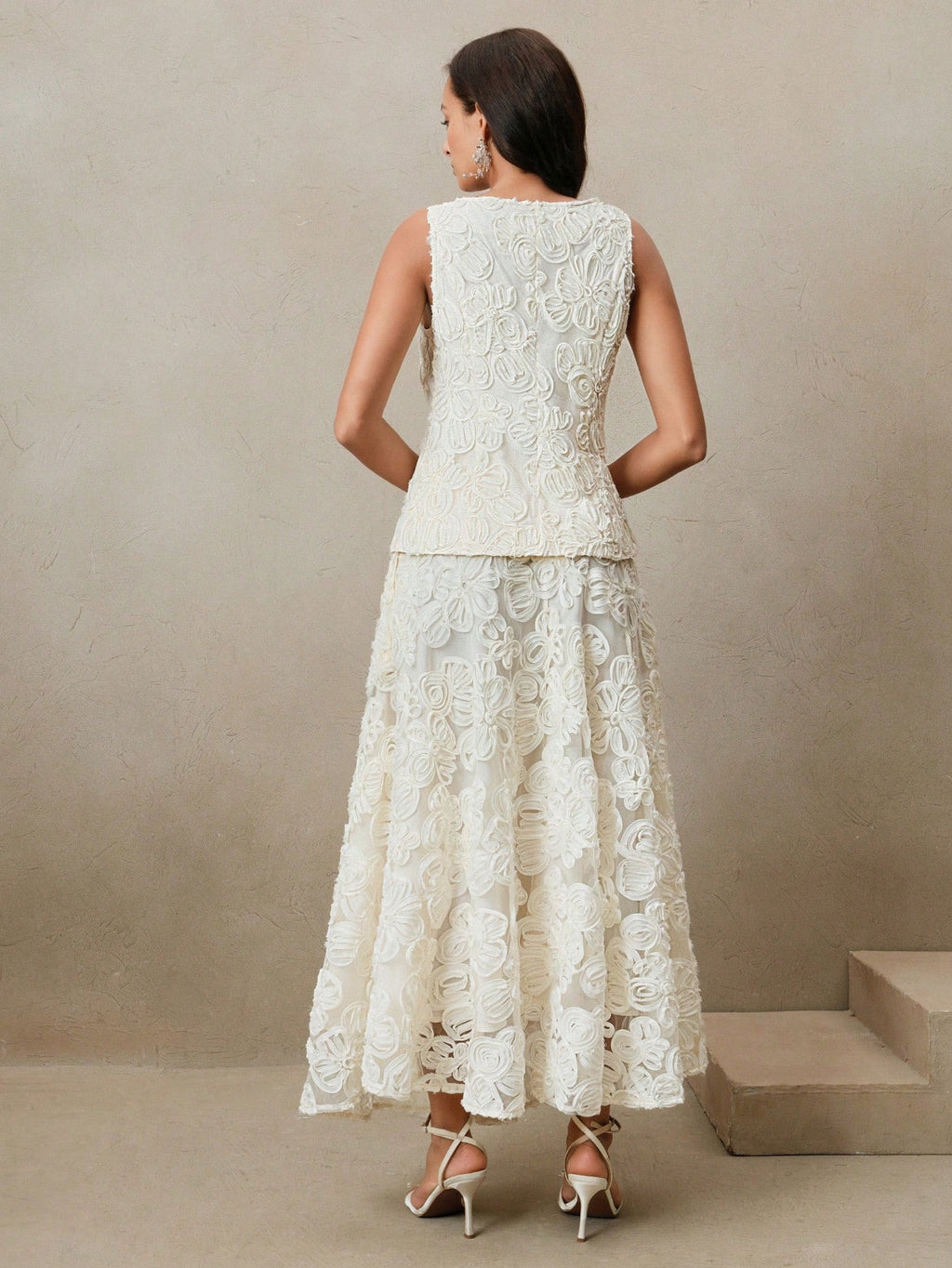 MIU 2pcs/Set Women Solid Color Floral 3D Textured Sleeveless Top And Mini Skirt, For Spring/Summer Festival And Graduation