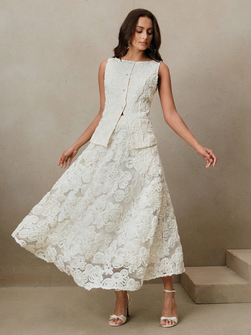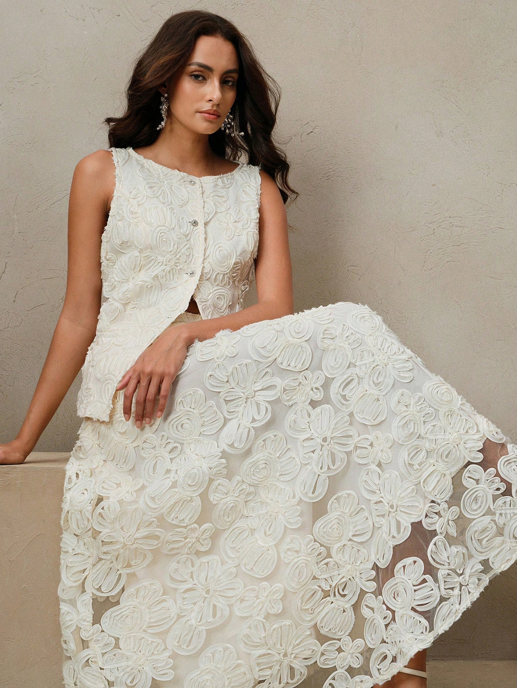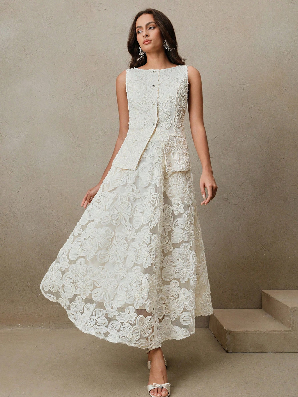 MIU 2pcs/Set Women Solid Color Floral 3D Textured Sleeveless Top And Mini Skirt, For Spring/Summer Festival And Graduation
