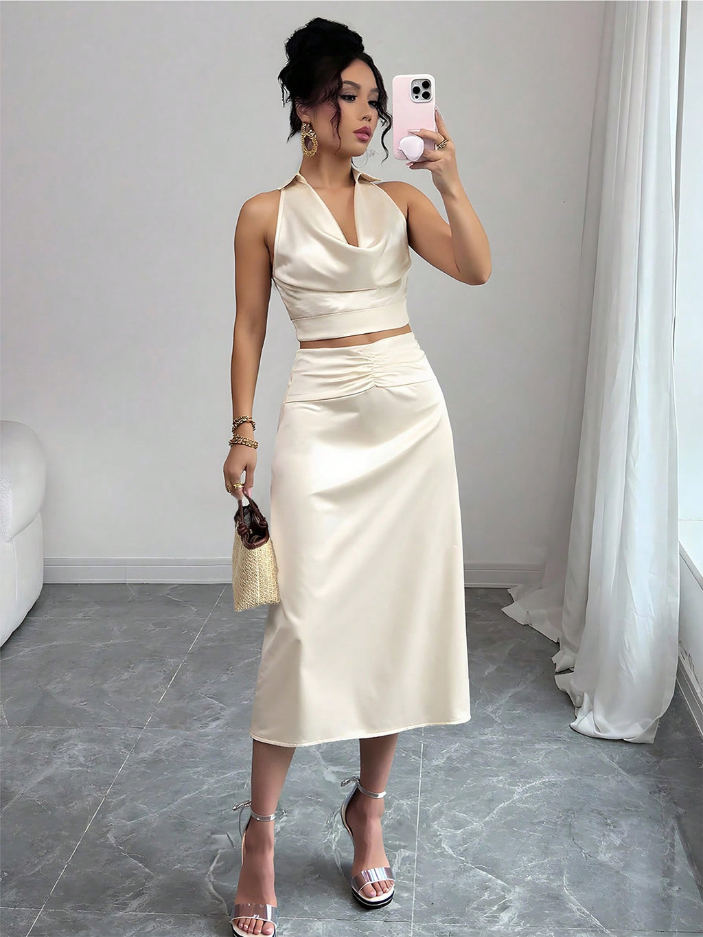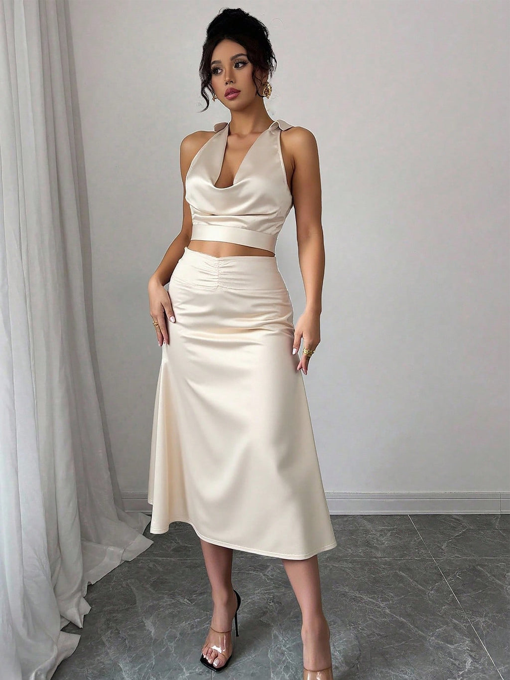 MIU 2pcs/Set Women Summer Solid Color Draped Neck Sleeveless Top And Mini Skirt Elegant Set