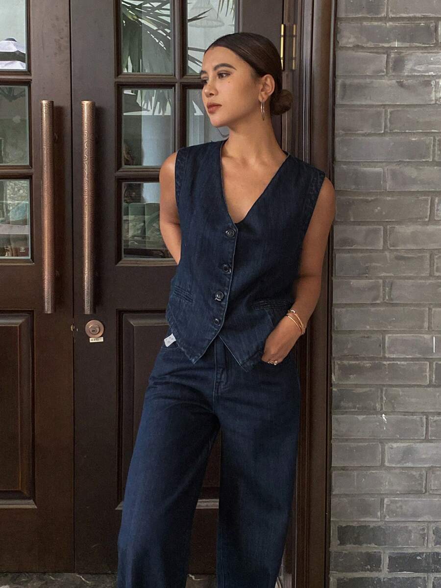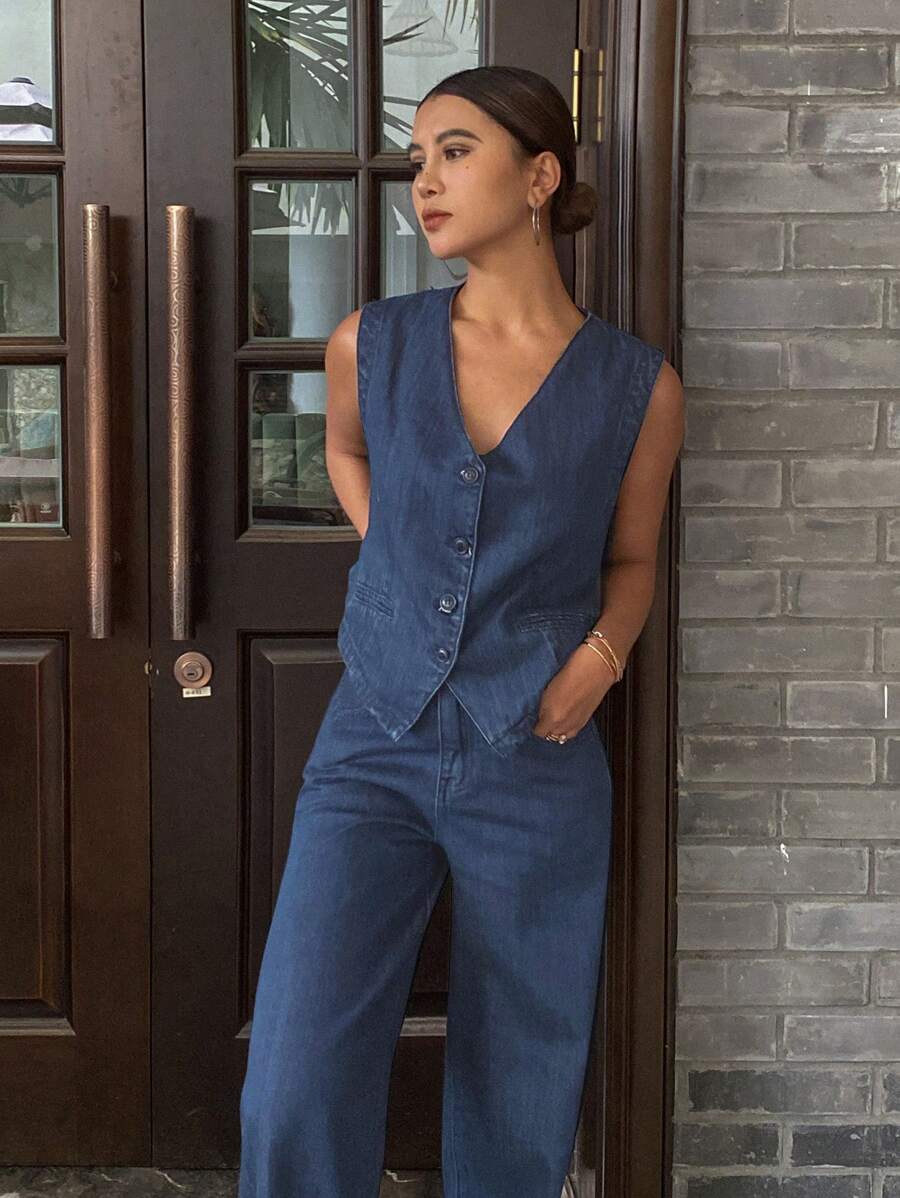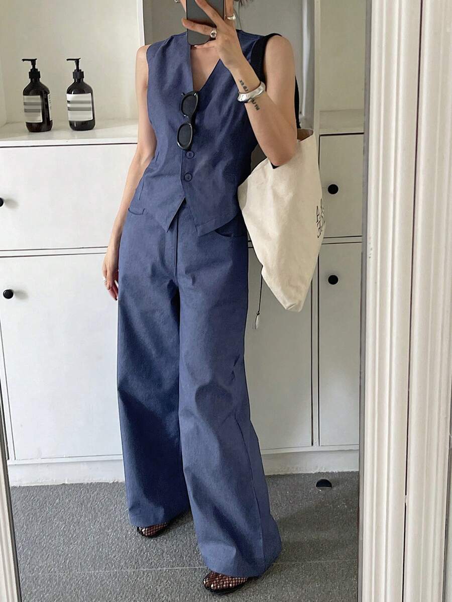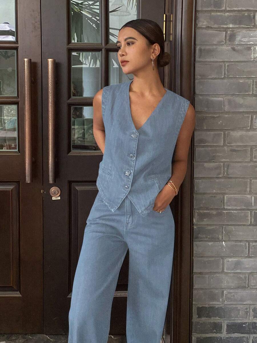 MIU 2pcs Women Denim Vest And Wide Leg Jeans Pants Set