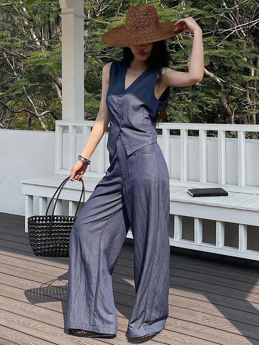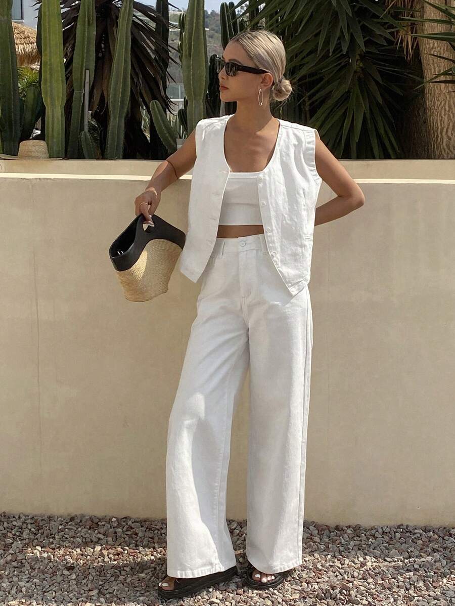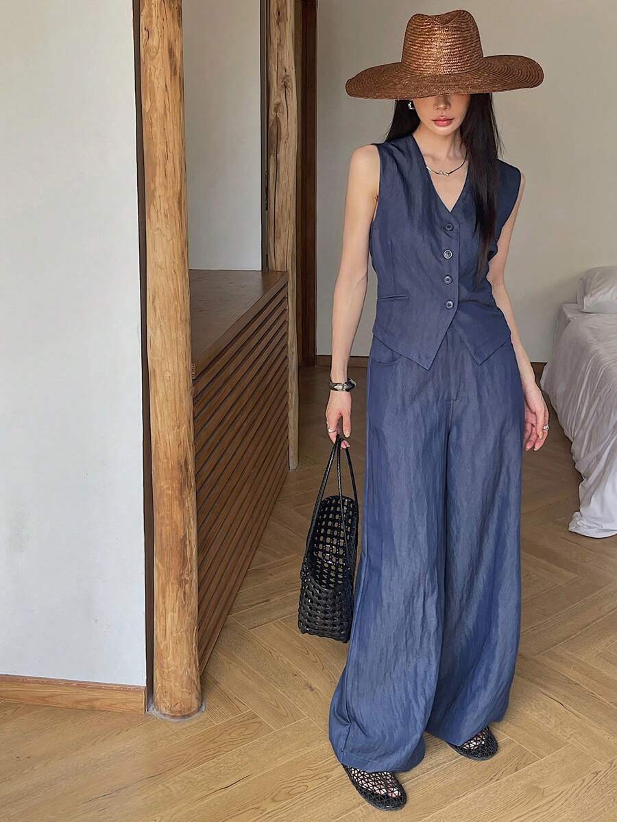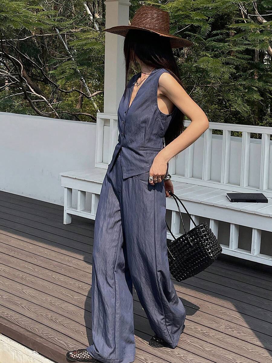 MIU 2pcs Women Denim Vest And Wide Leg Jeans Pants Set