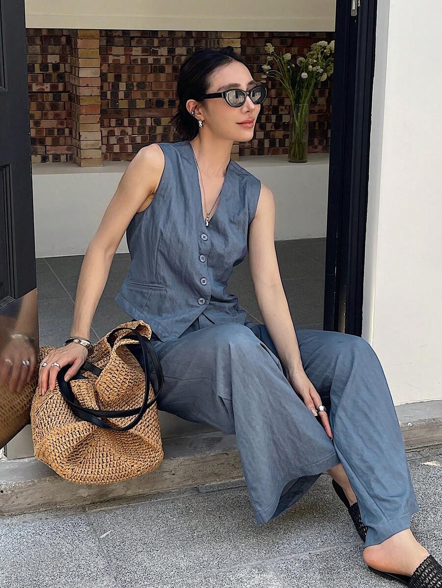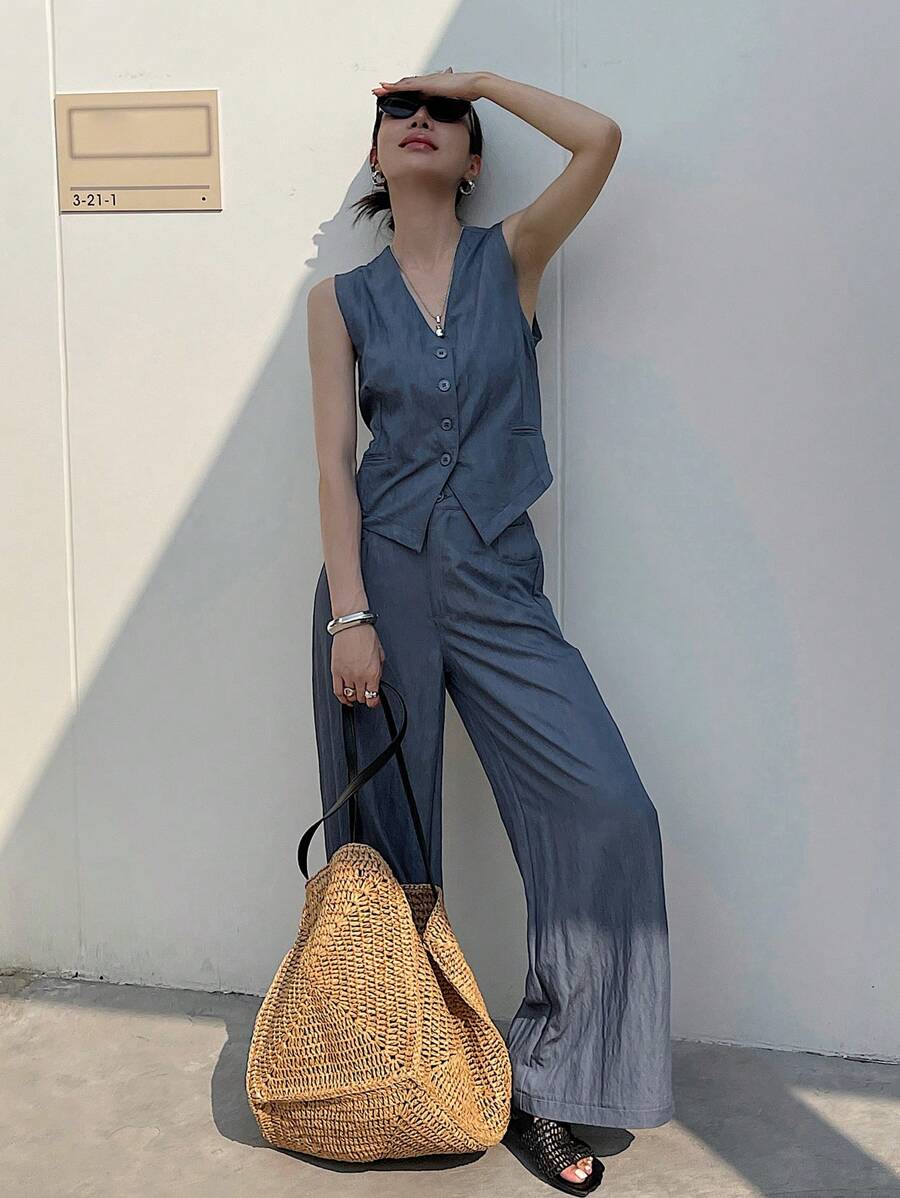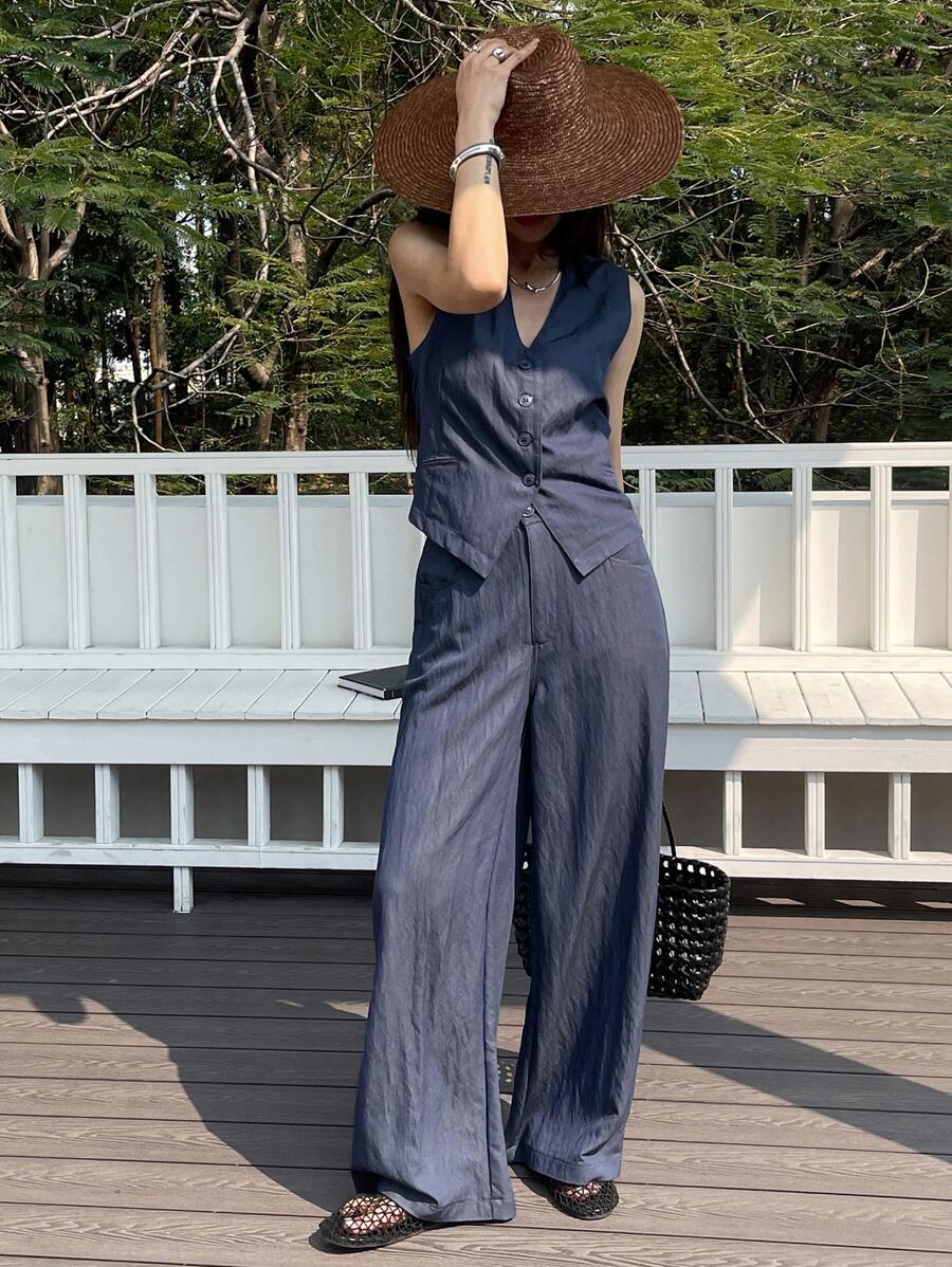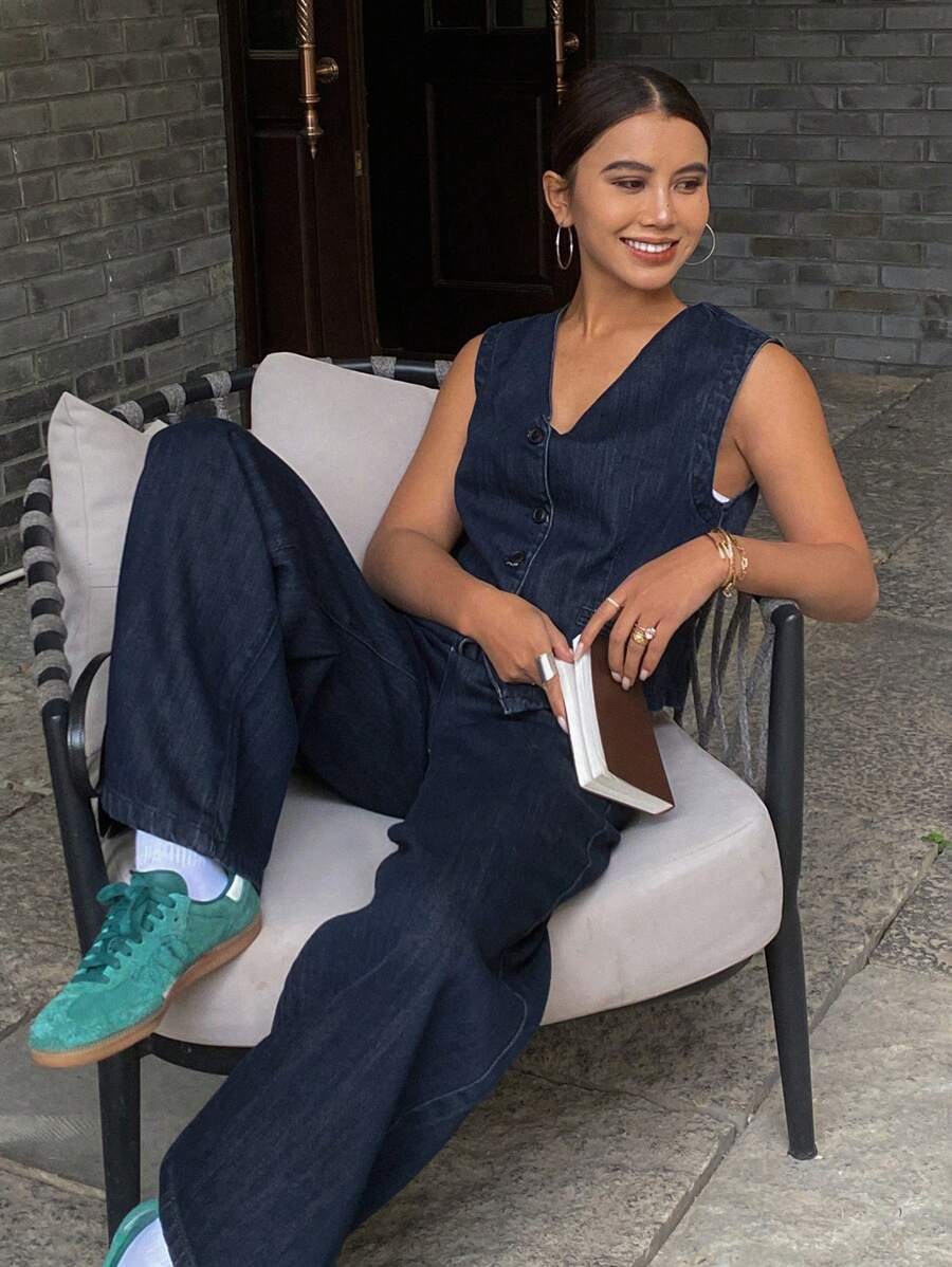 MIU 2pcs Women Denim Vest And Wide Leg Jeans Pants Set