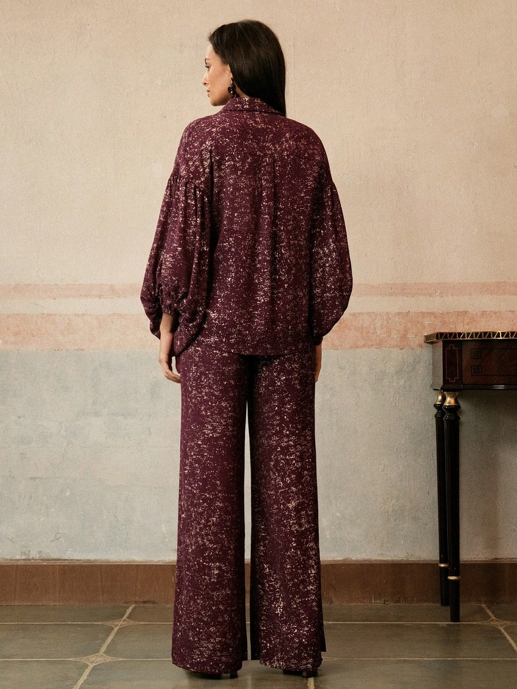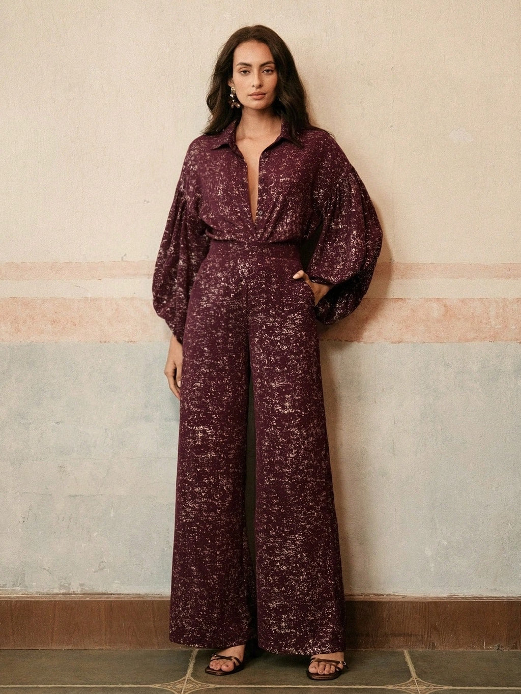 MIU 2pcs Women Elegant Modern Lantern Sleeve Gold Foil Shirt And Pants Set, Casual Spring/Summer Outfits For Vacation, Festival, Holiday