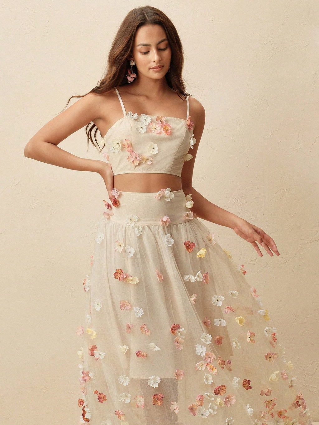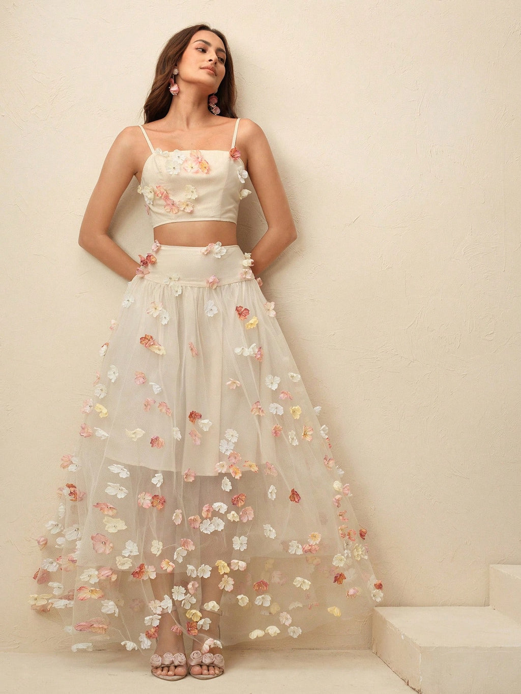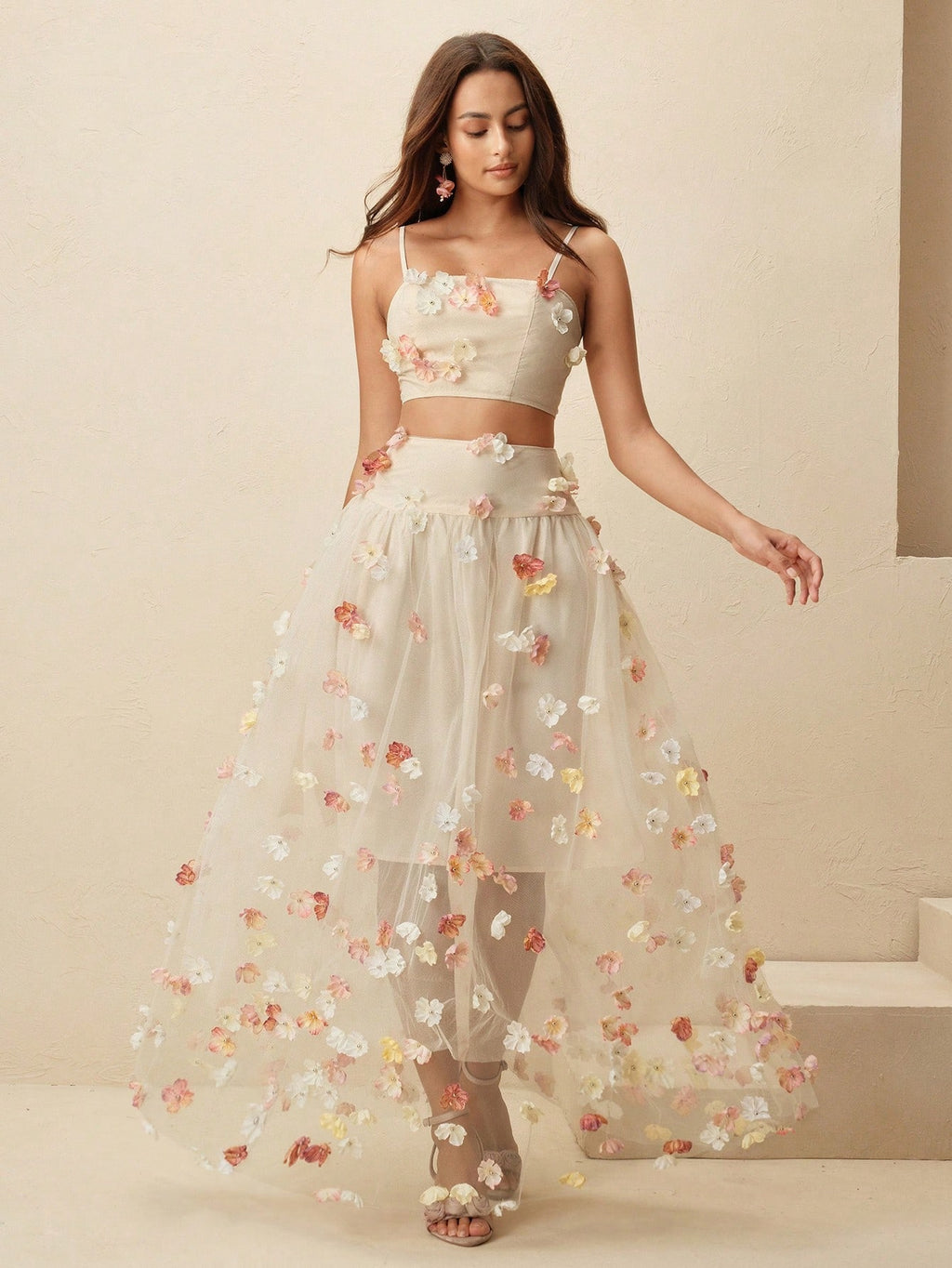 MIU 2pcs Women Mesh Floral Camisole Top And High Waist Long Skirt Set, Slimming
