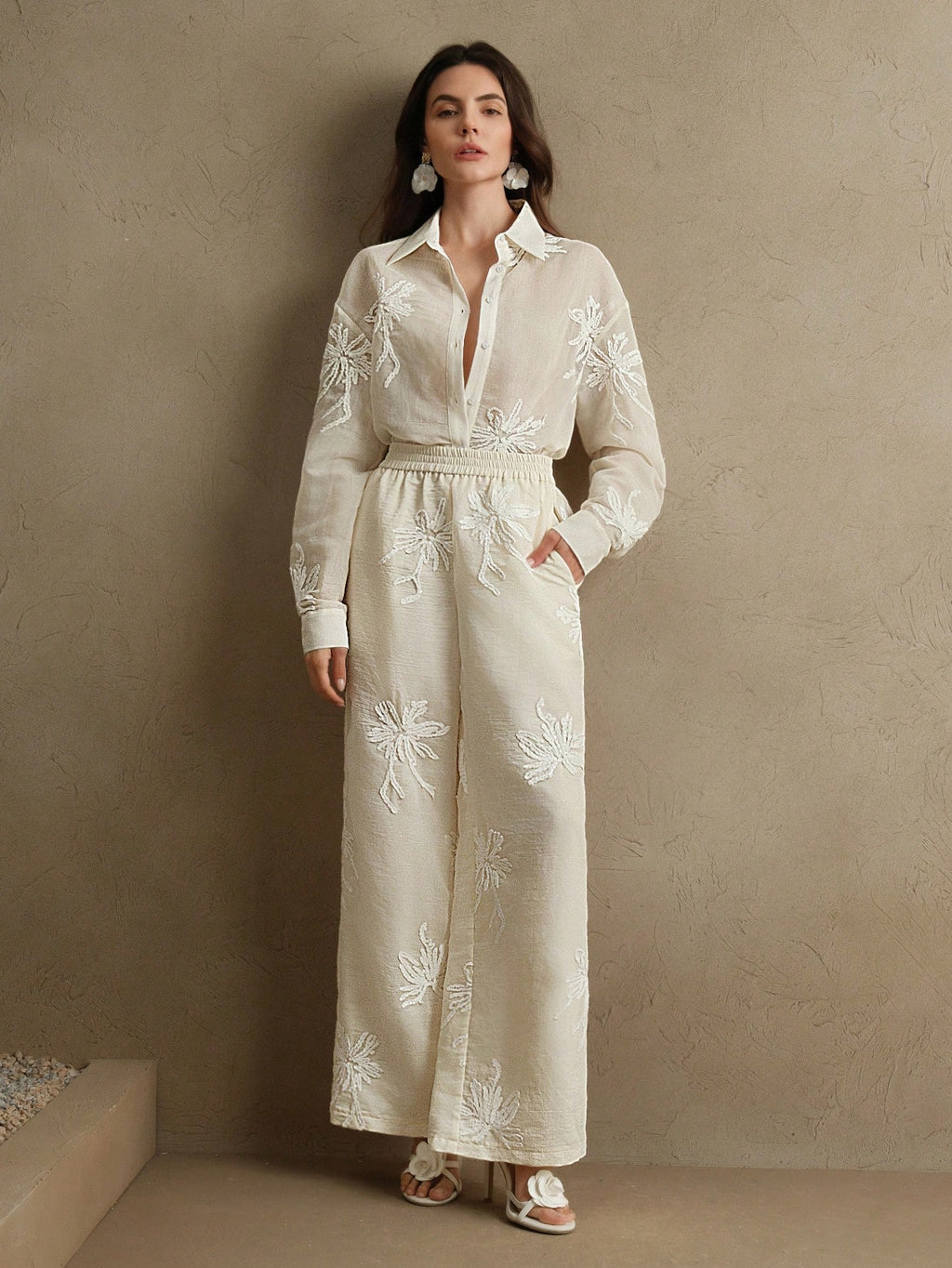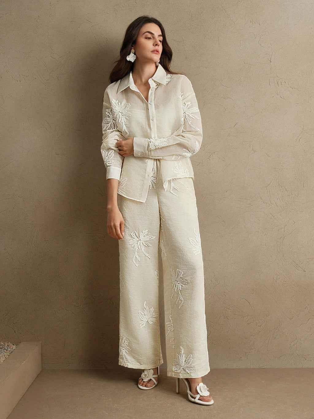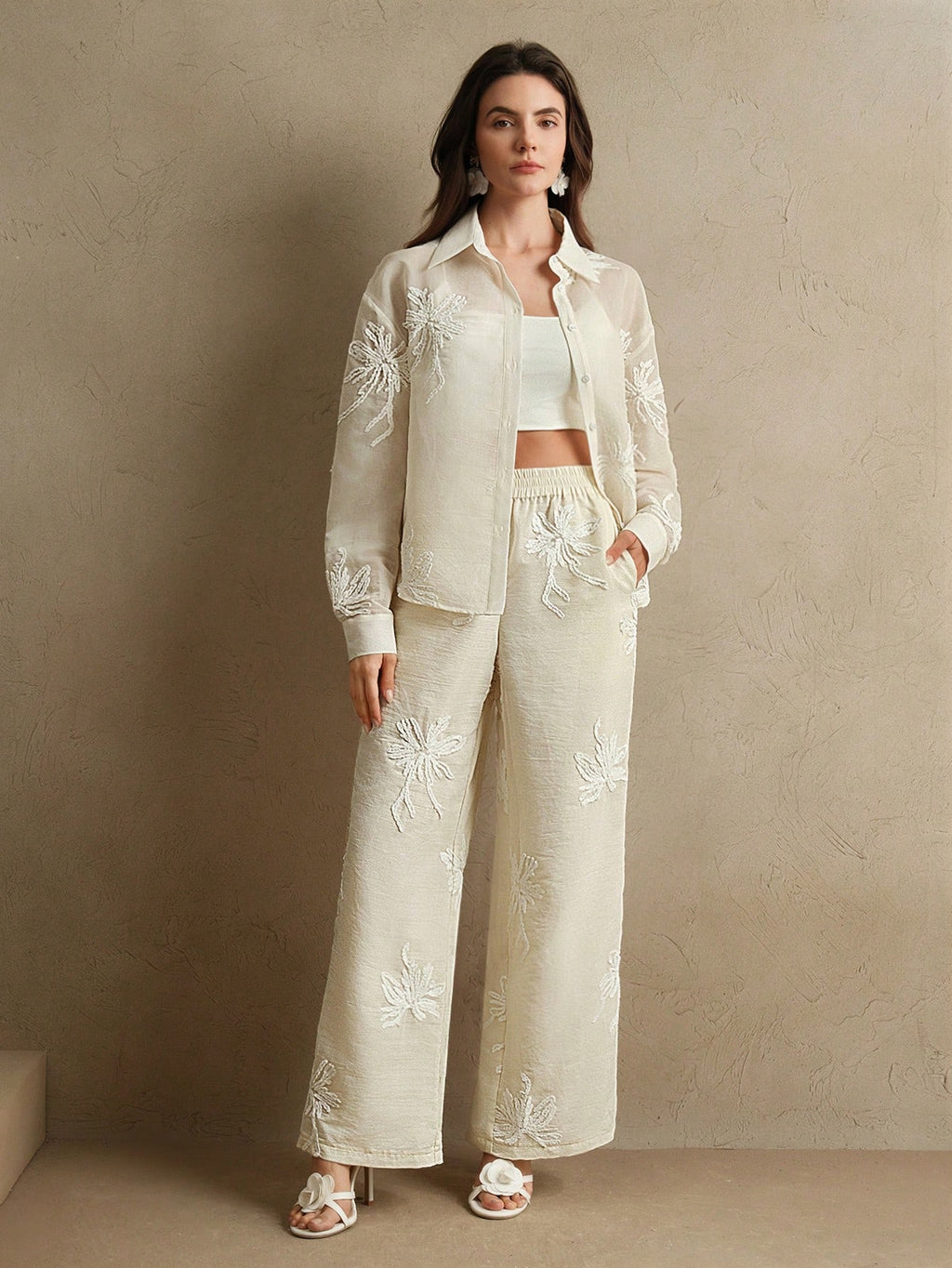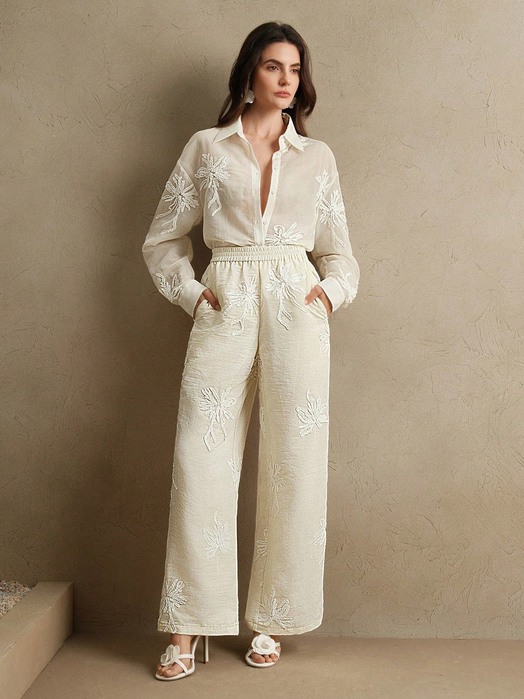 MIU 2pcs Women Set: Jacquard Sequins Embroidered Collar Blouse Elastic Waist Pants, Elegant Spring Outfits For Women
