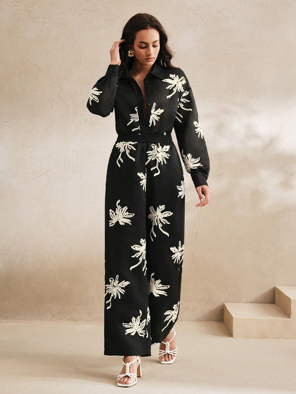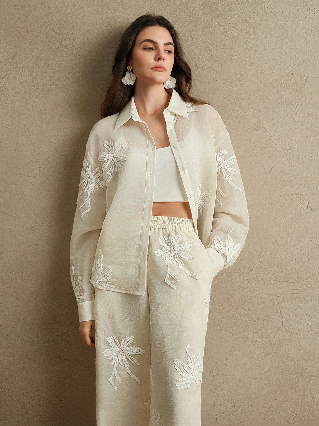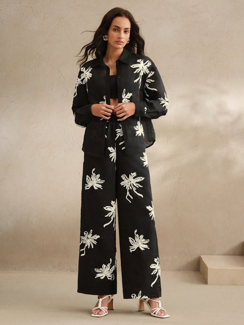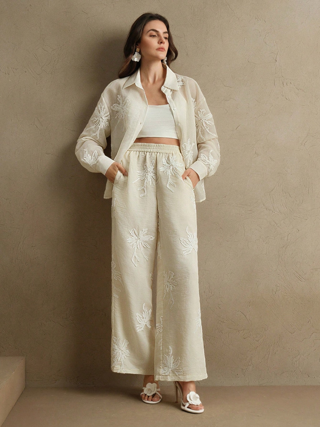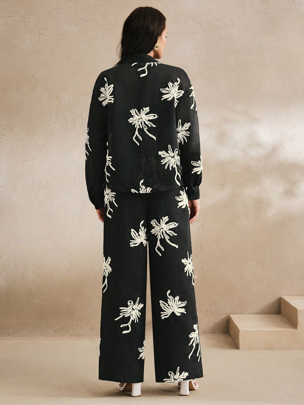 MIU 2pcs Women Set: Jacquard Sequins Embroidered Collar Blouse Elastic Waist Pants, Elegant Spring Outfits For Women