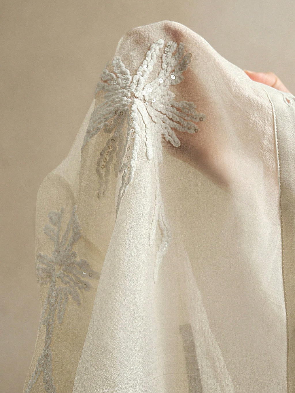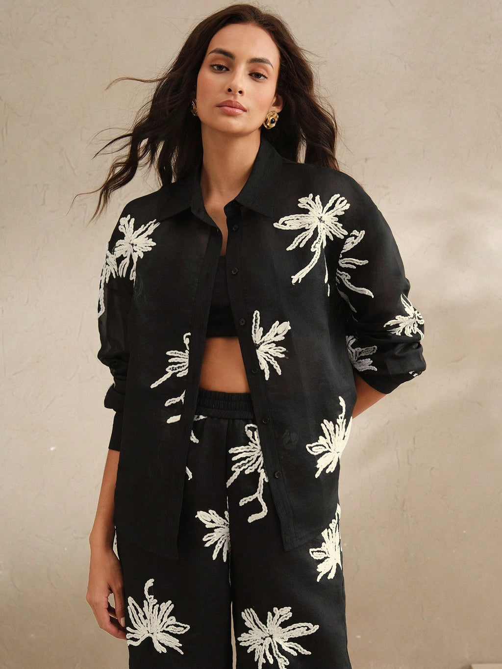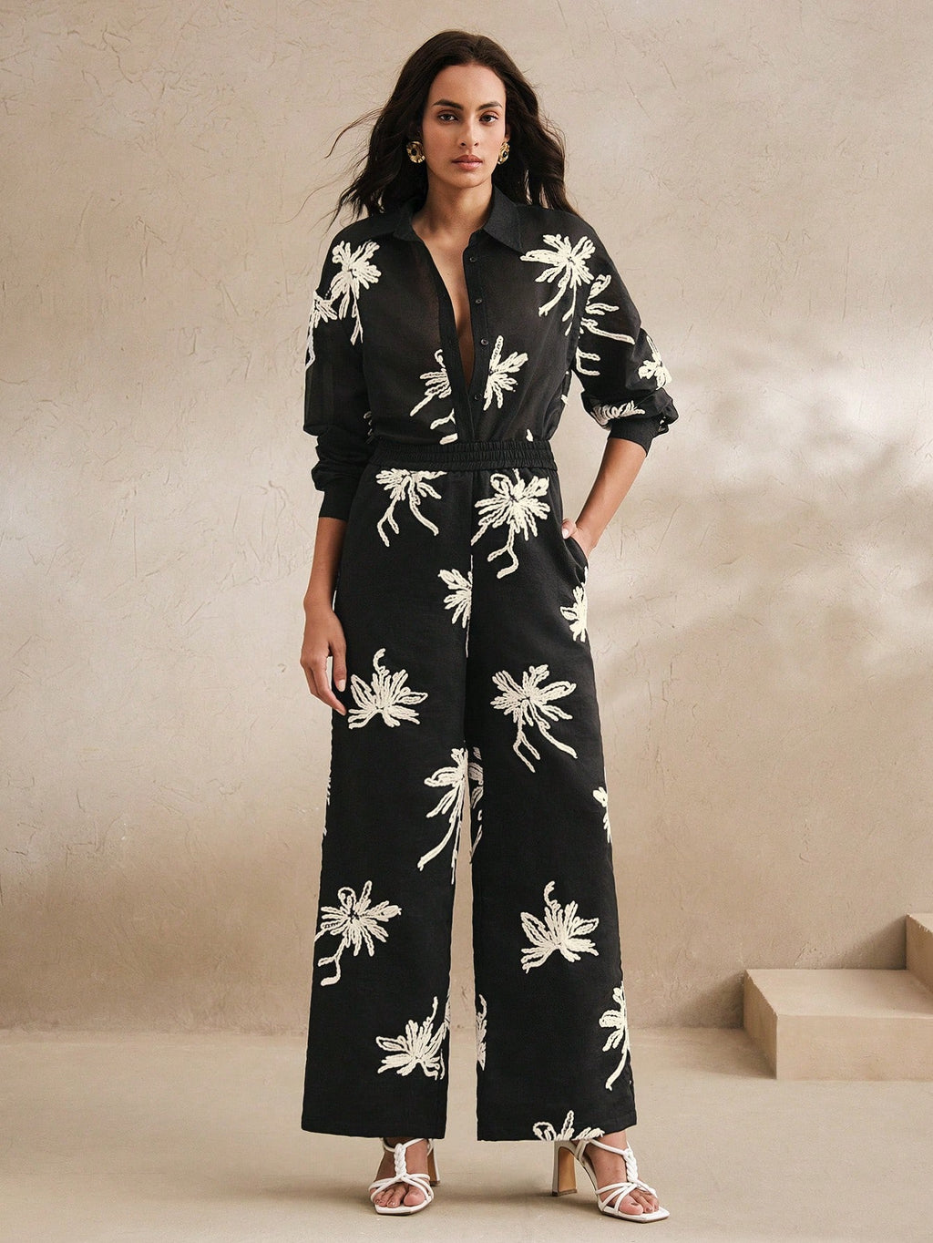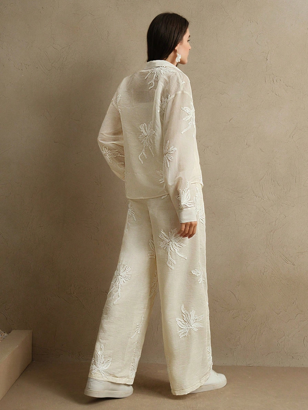 MIU 2pcs Women Set: Jacquard Sequins Embroidered Collar Blouse Elastic Waist Pants, Elegant Spring Outfits For Women