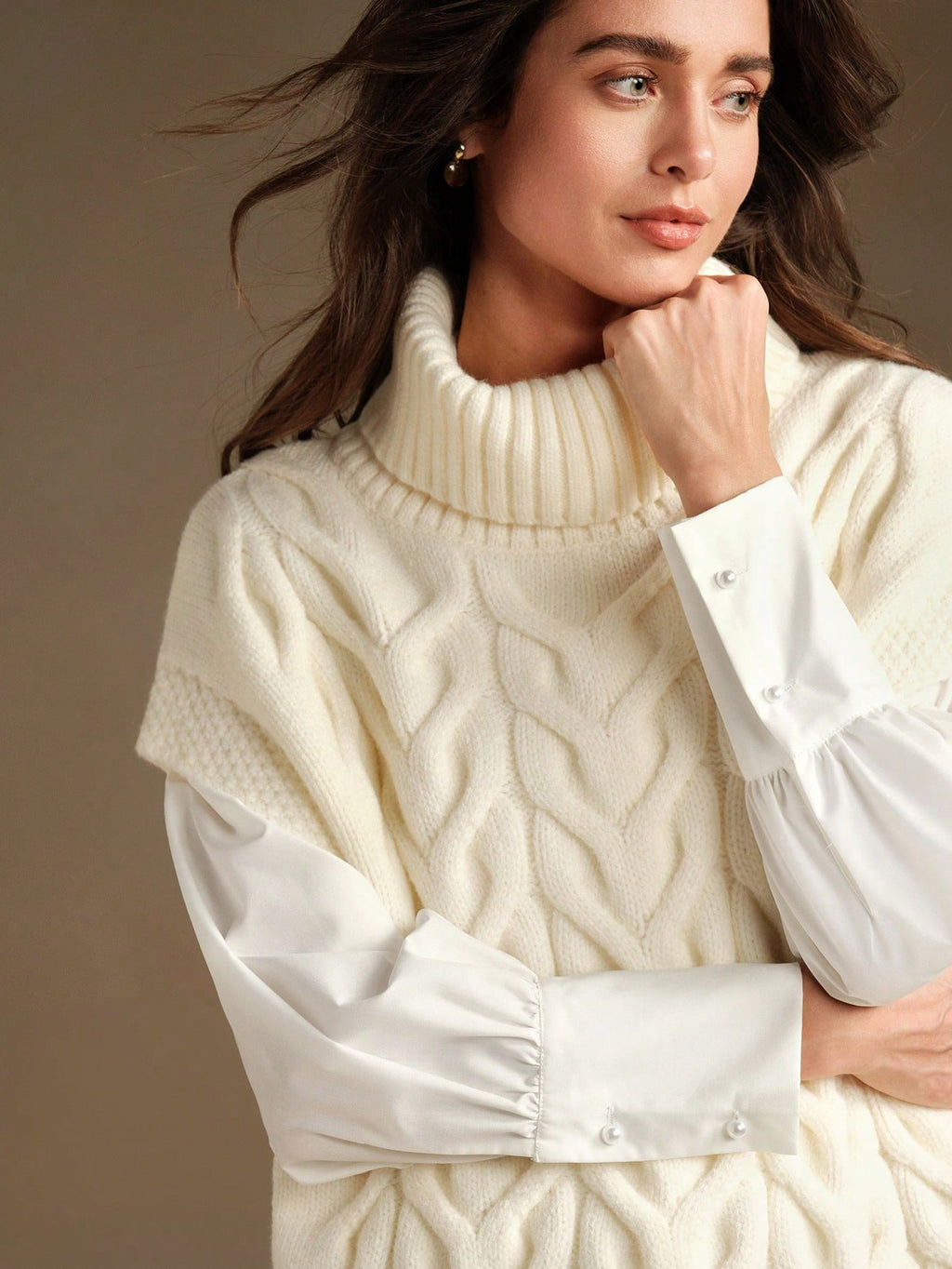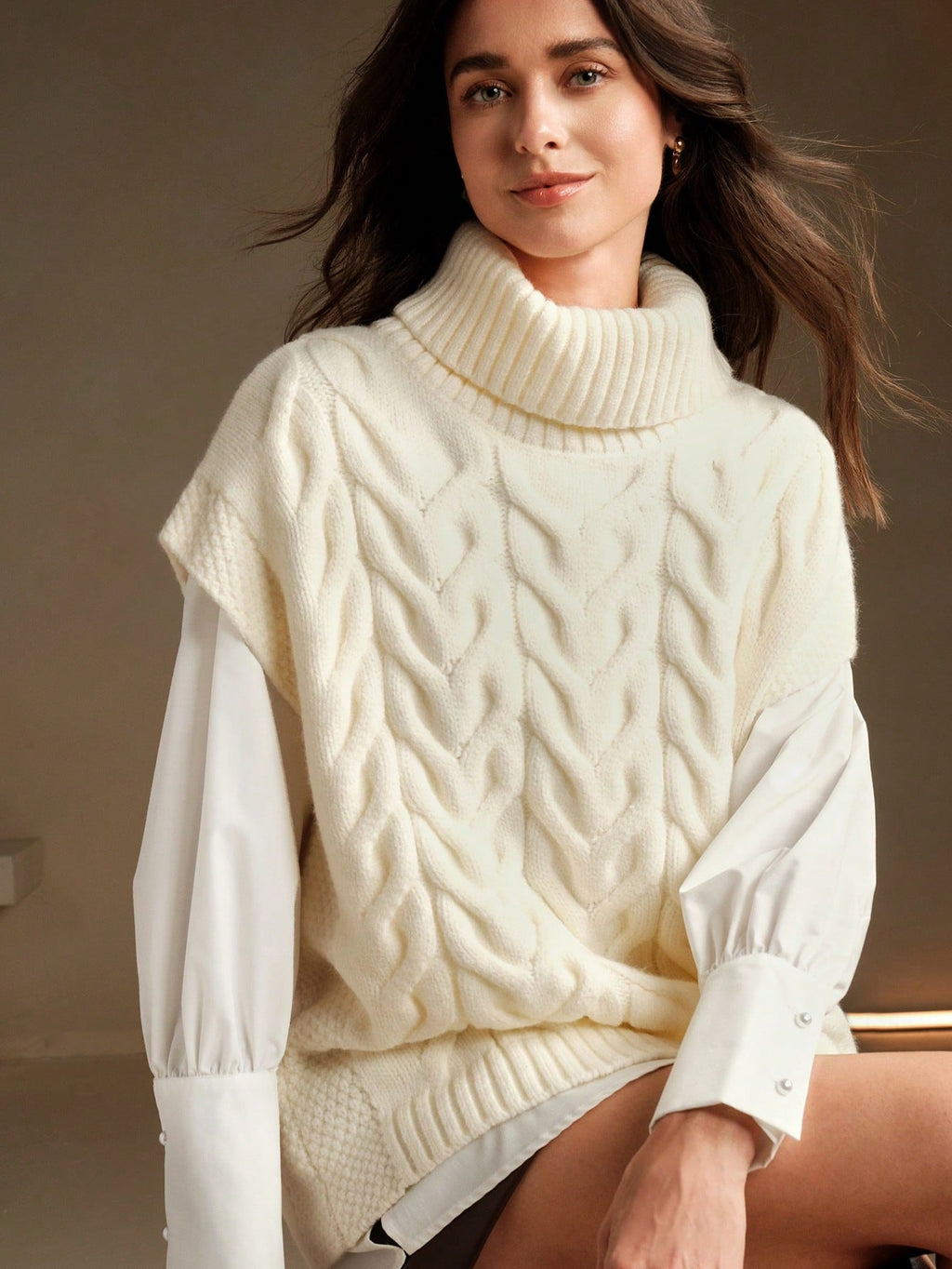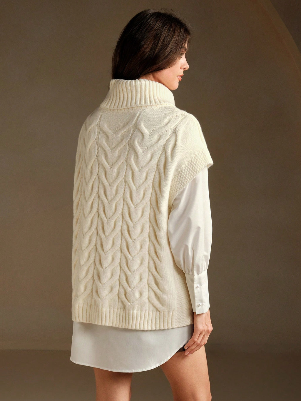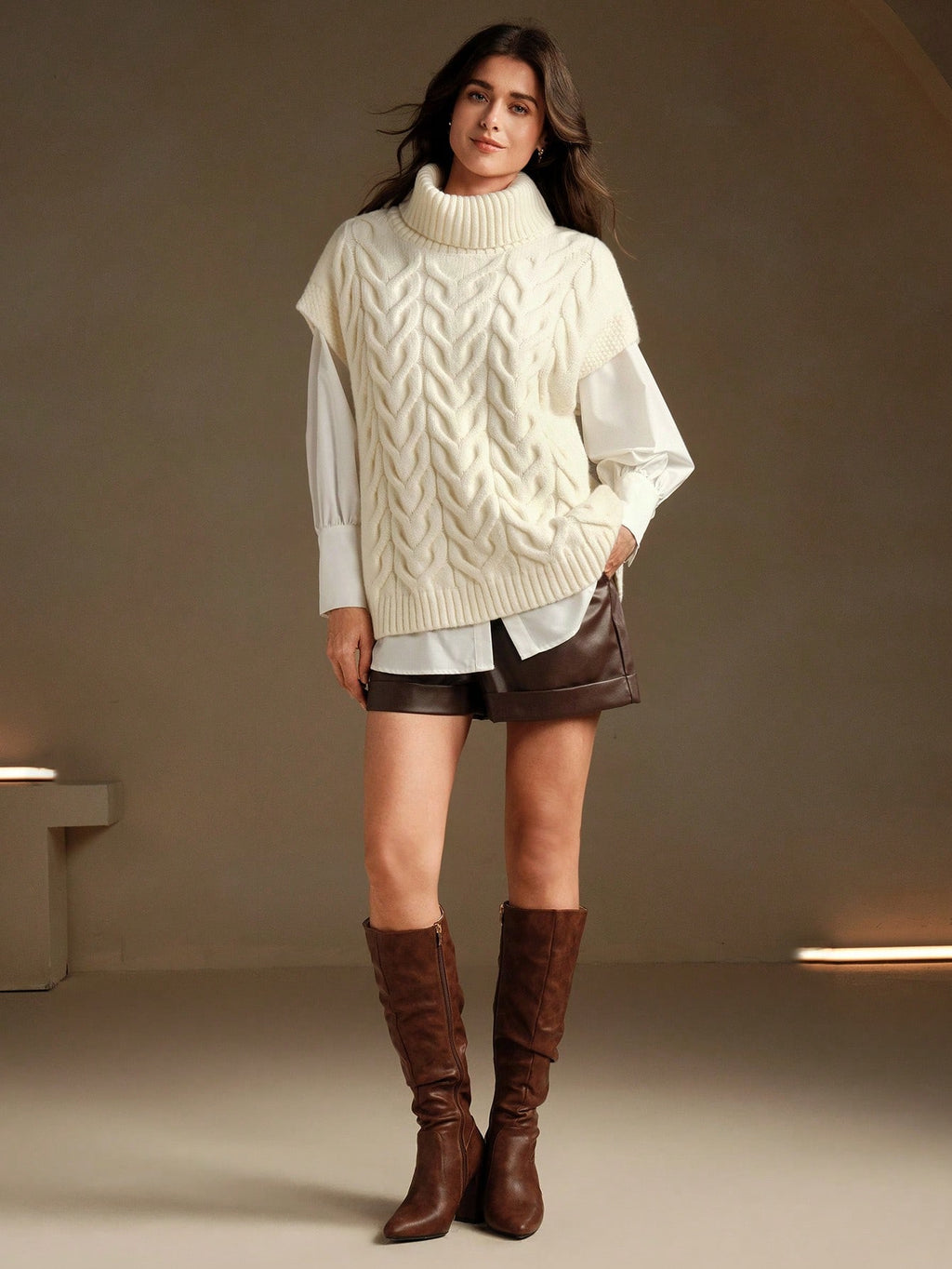 MIU 2pcs Women's Casual Loose Cable Knit High Neck Poncho And Sleeveless Top Set