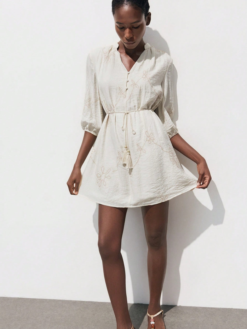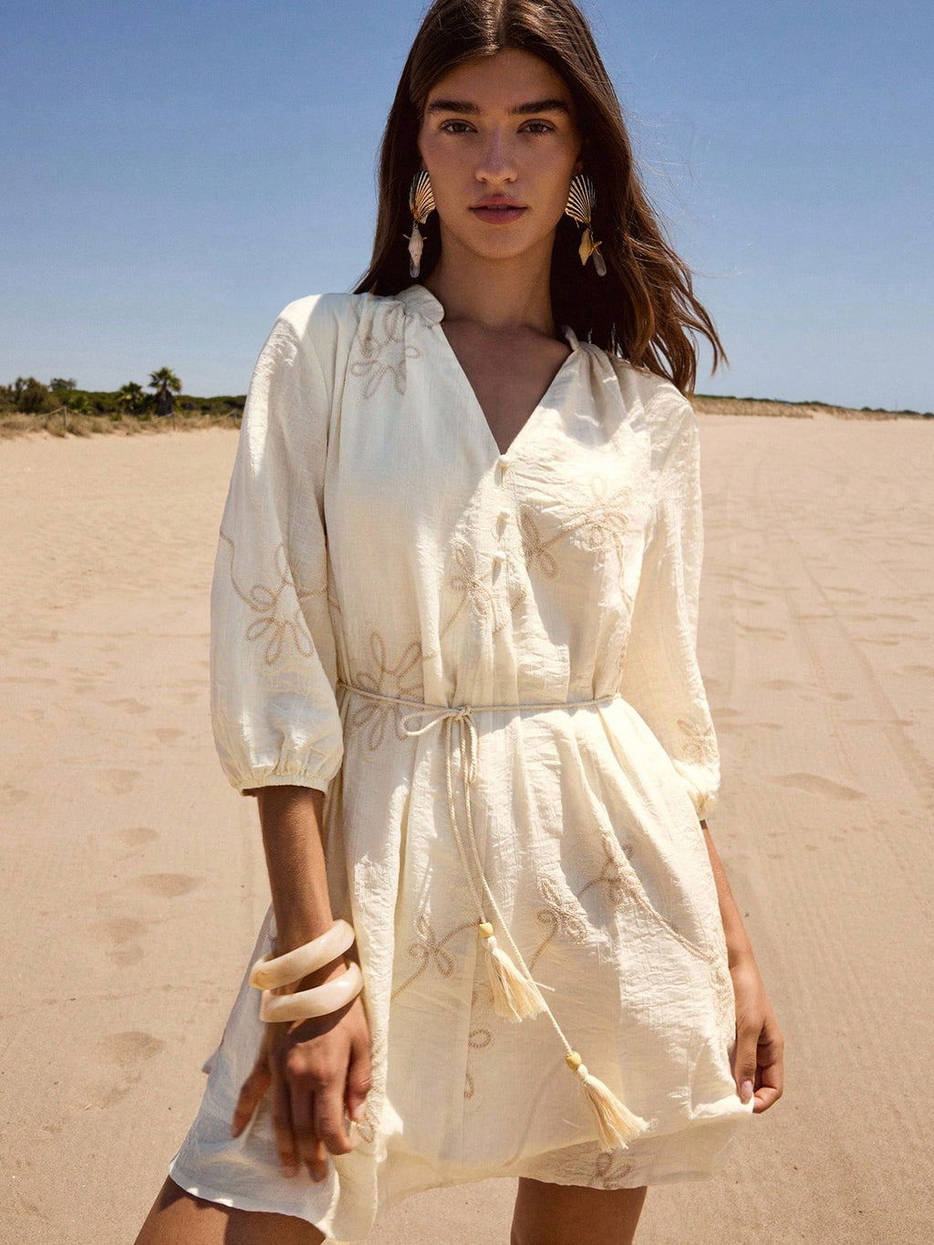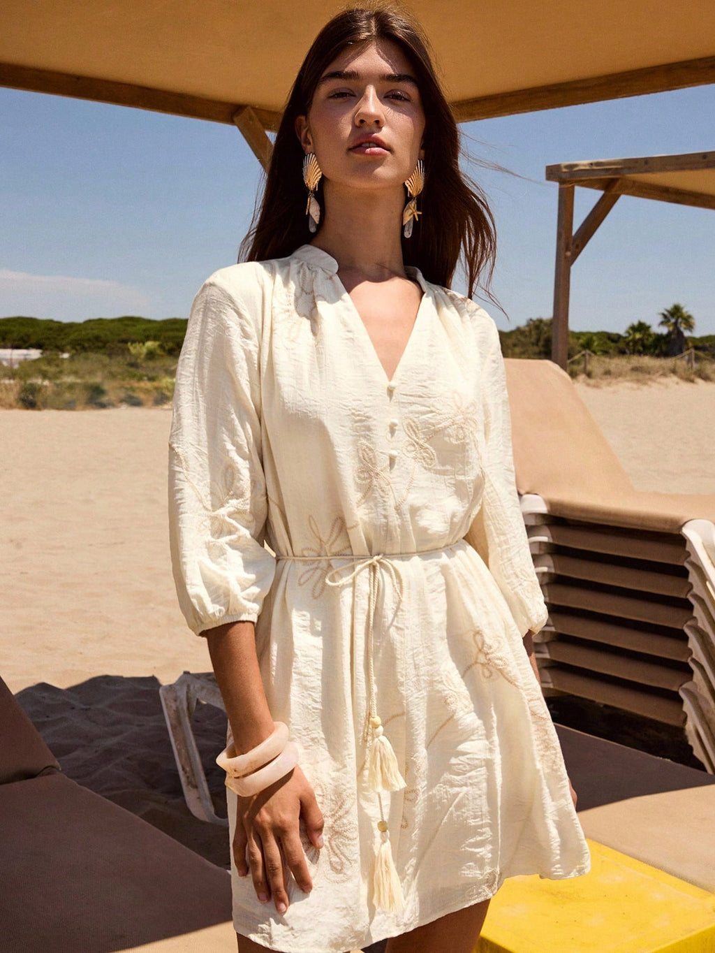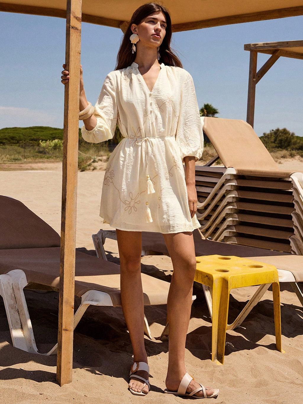 MIU Apricot Embroidery Texture V-Neck Long Sleeve Tassel Belt Casual Loose Summer Mini Dress, Comfortable Bohemian Holiday Beach Style