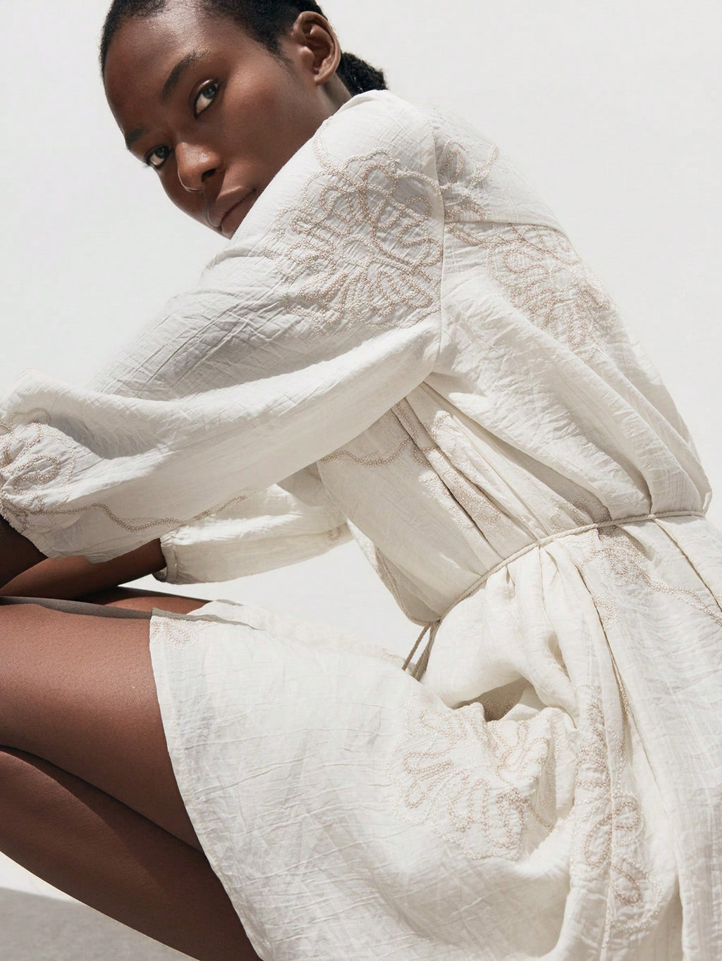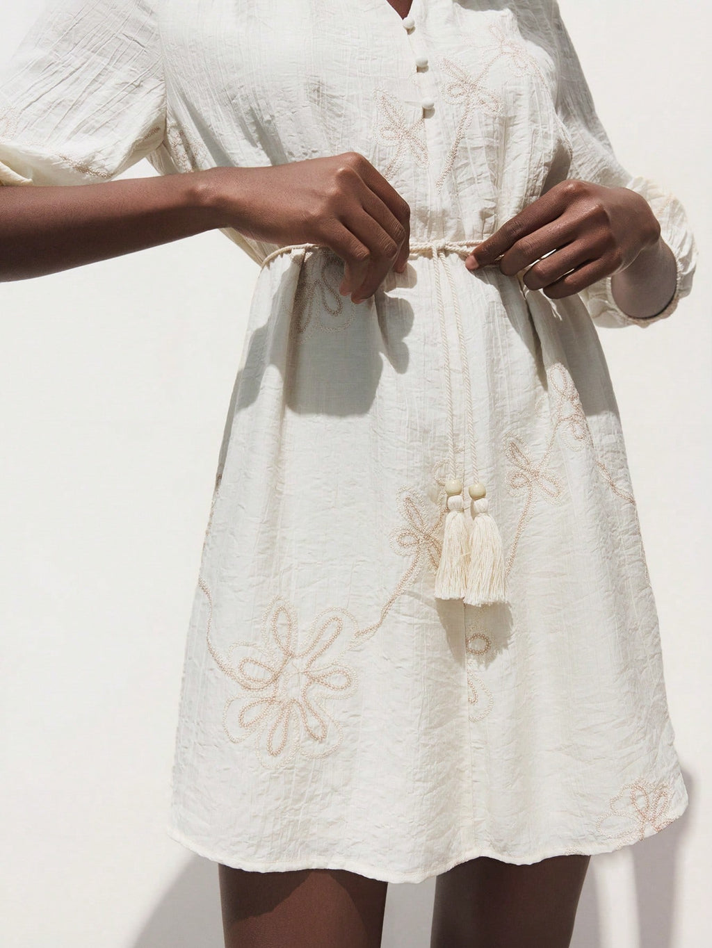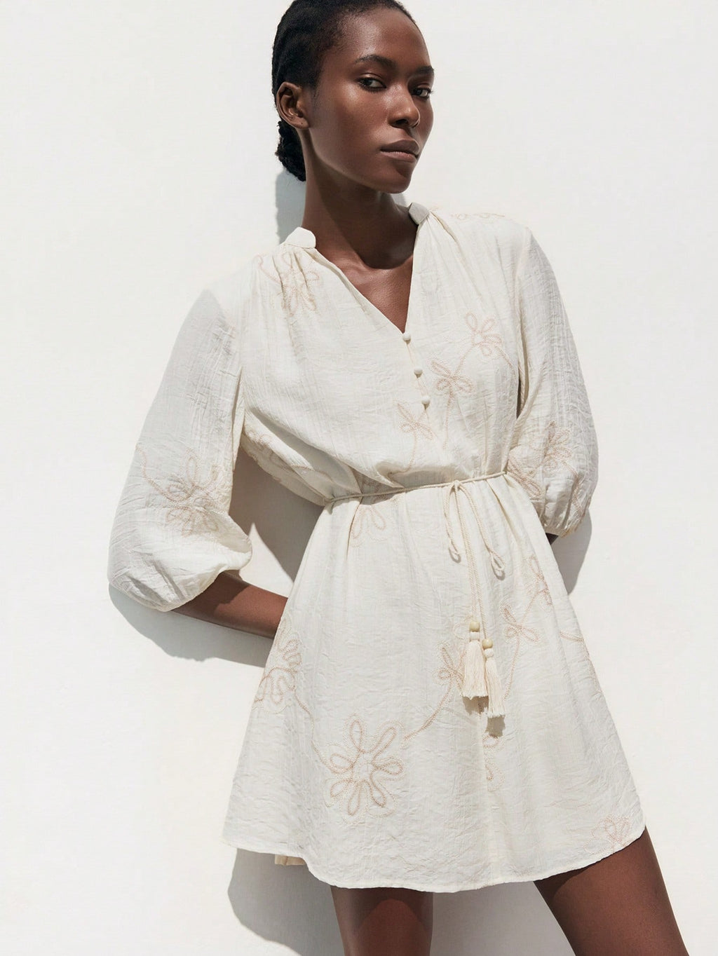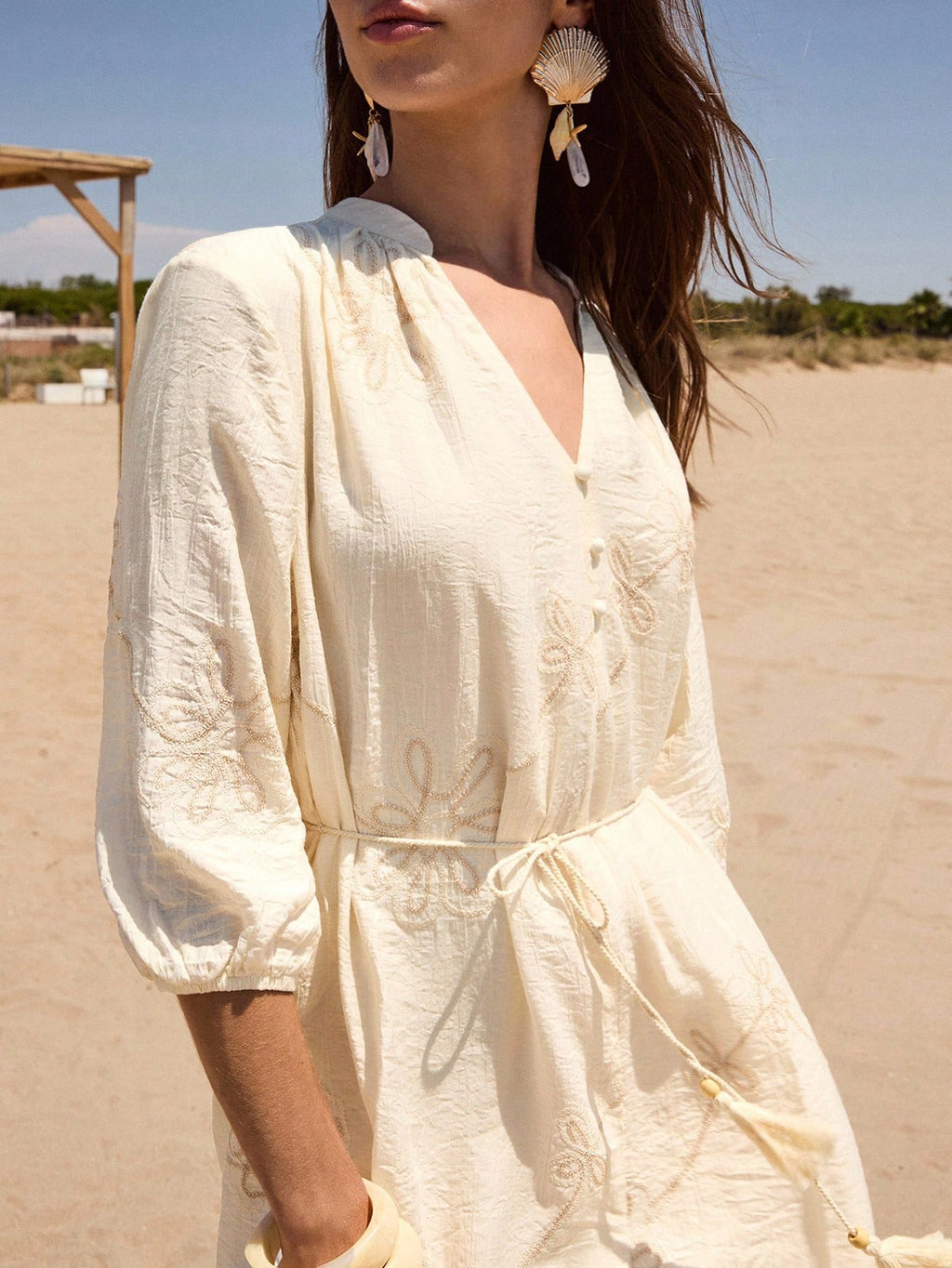 MIU Apricot Embroidery Texture V-Neck Long Sleeve Tassel Belt Casual Loose Summer Mini Dress, Comfortable Bohemian Holiday Beach Style