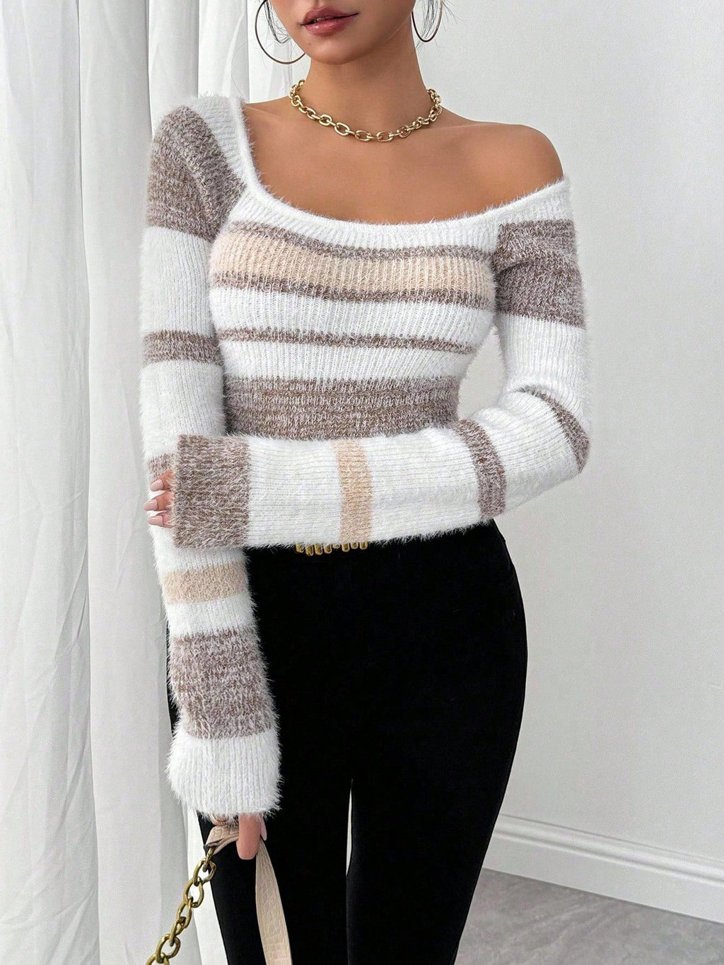 MIU AZRA Dugi Ženski Jesen/Zima Novi Dolazak Jednodijelni Kvadratni Izrez Otkrit Ključnu Kosti Prilagođeni Seksi Mršavi Elegantni Visoko-Kvalitetni Klasični Prugasti Dizajn Redovni Pleteni Pulover Dugi Rukav Lažni Kašmir Mekana Udobna Majica