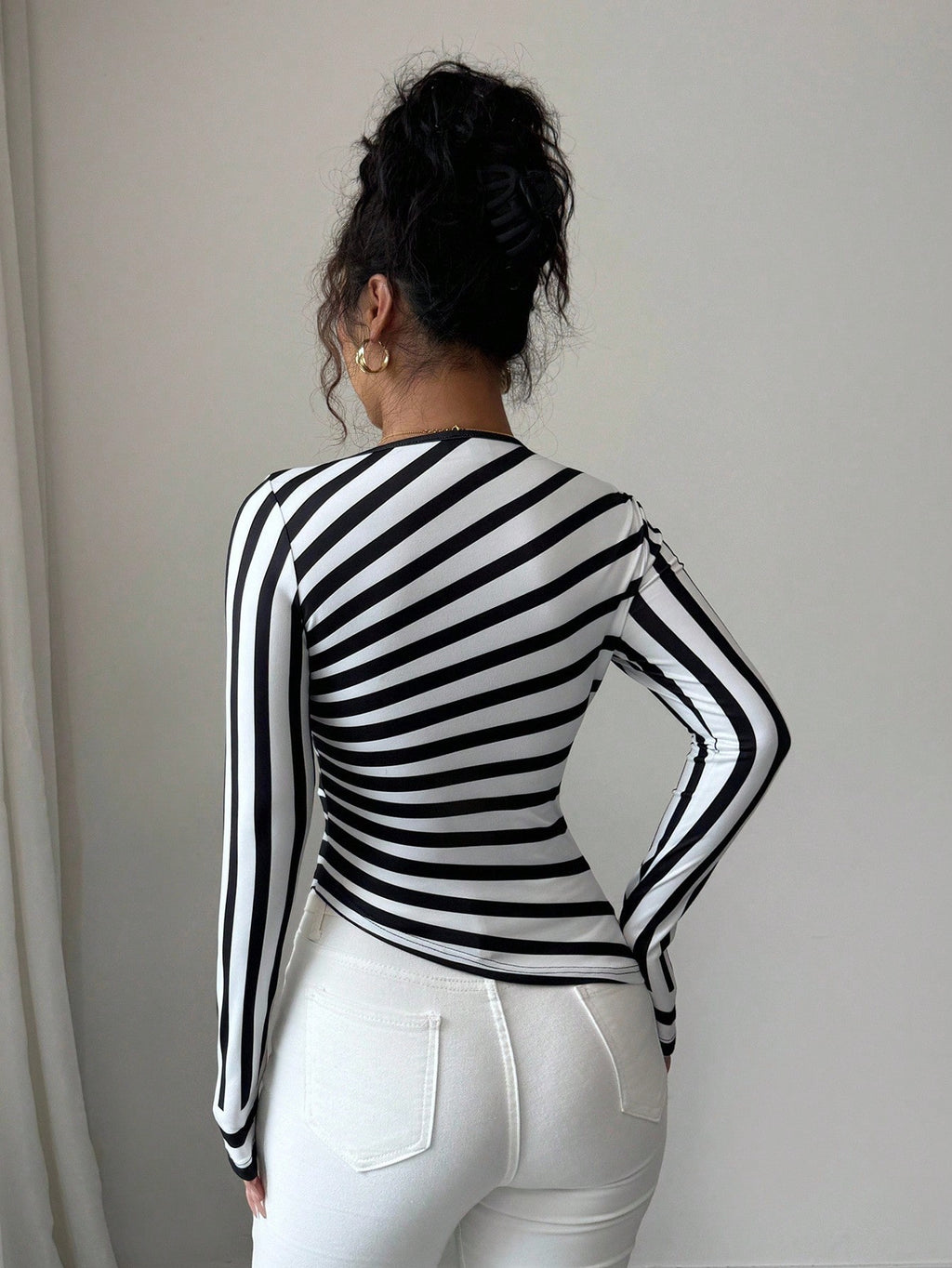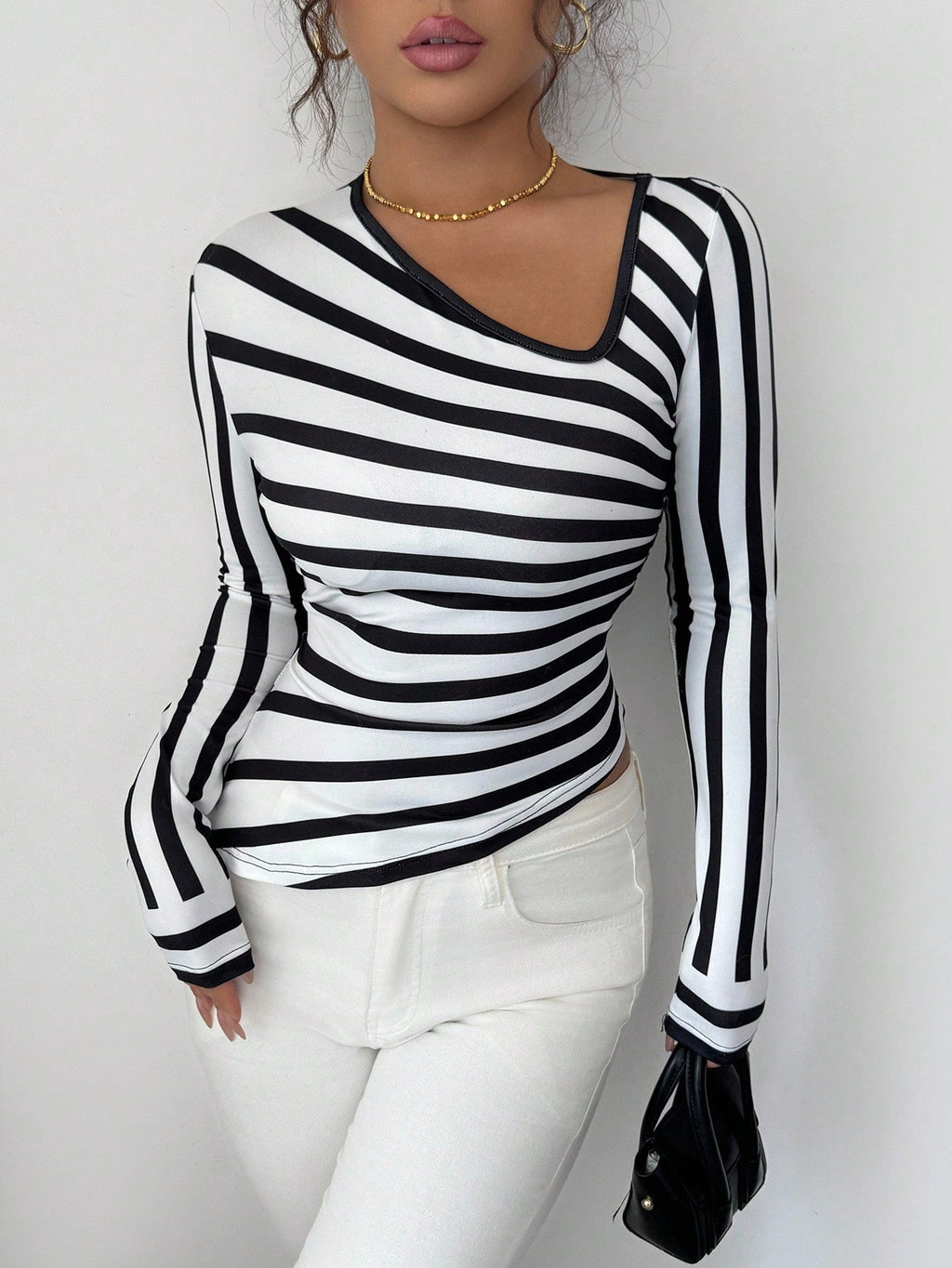 MIU AZRA Elenzya Asimetrična Prugasta Majica sa Dugim Rukavima za Žene, Elegantna Romantična, Casual i Komutna Odjeća, Haljina za Noć Veštica, Crna