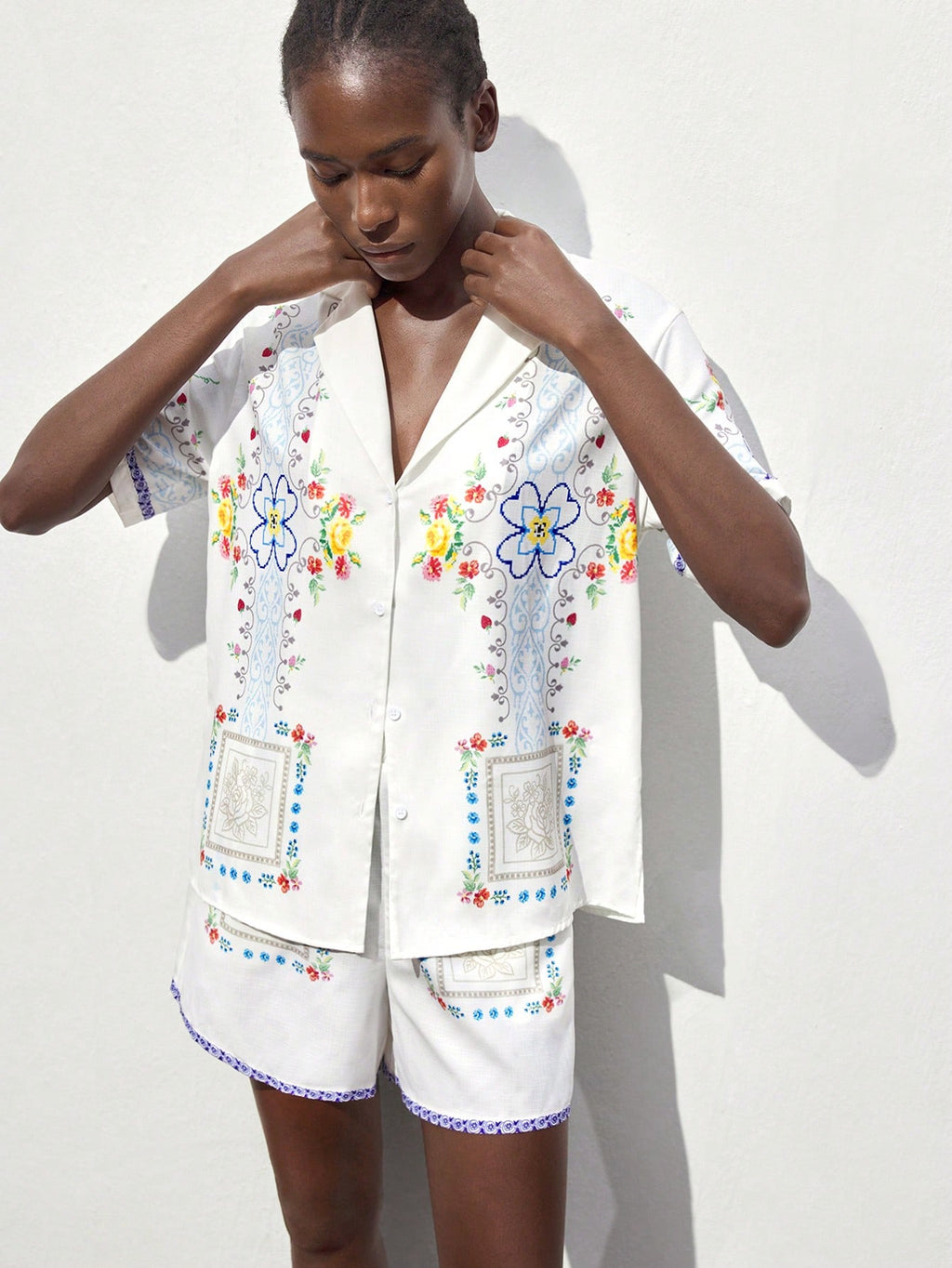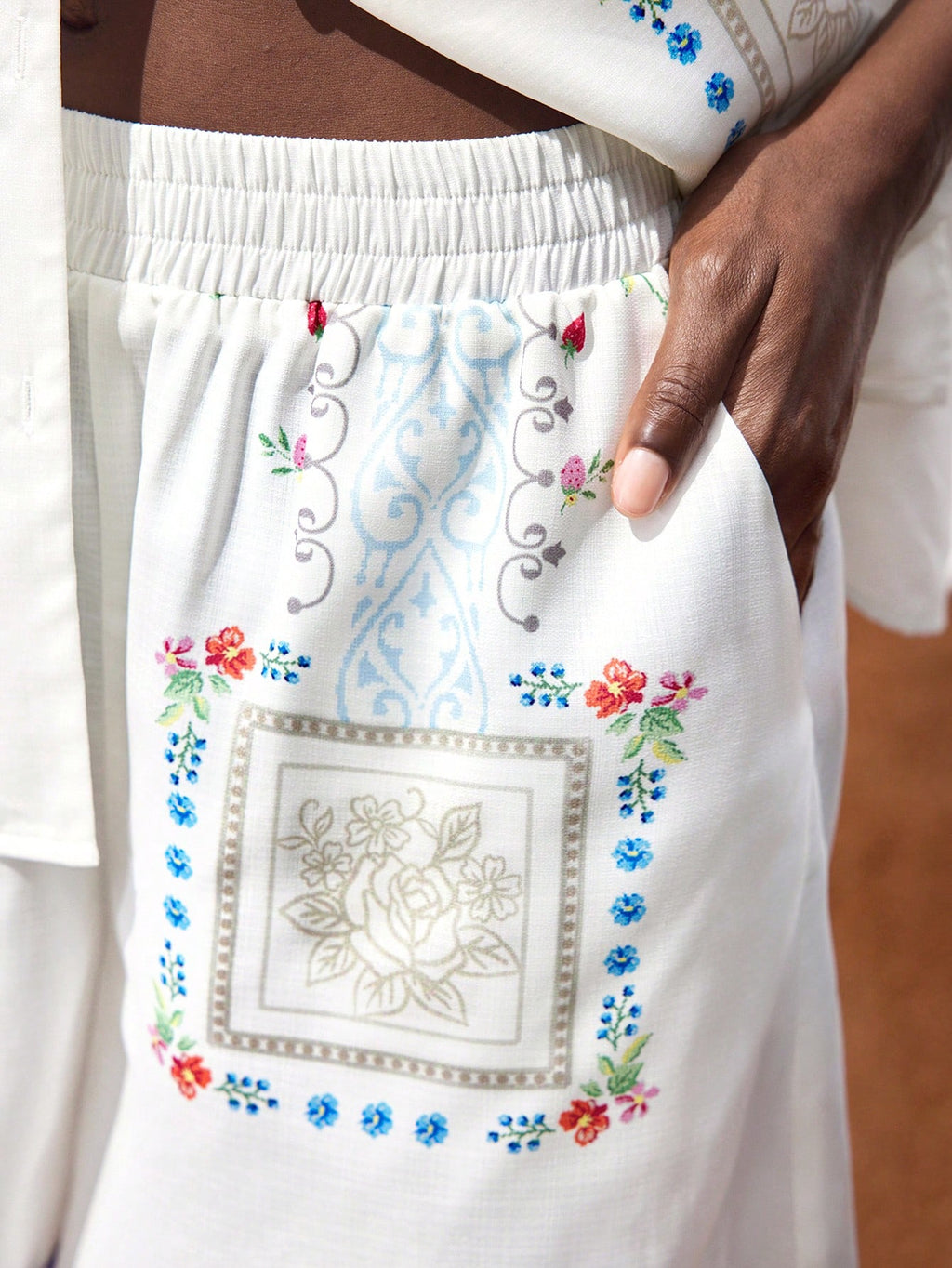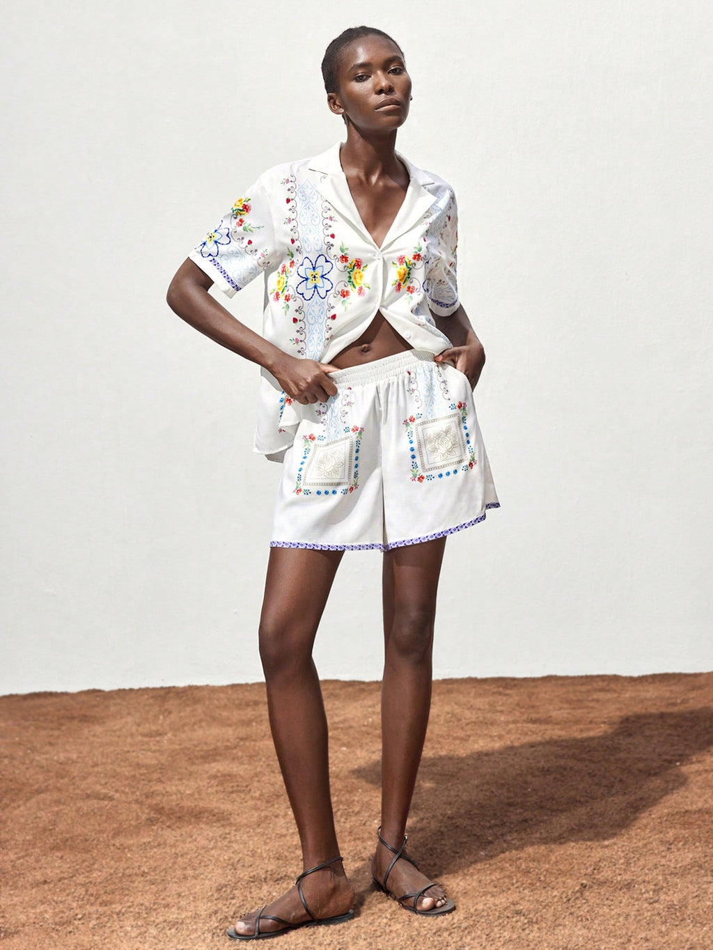 MIU Beige Embroidery Pattern Holiday Style High Waist Bohemian Comfortable Loose Casual Shorts For Women, Versatile For Spring