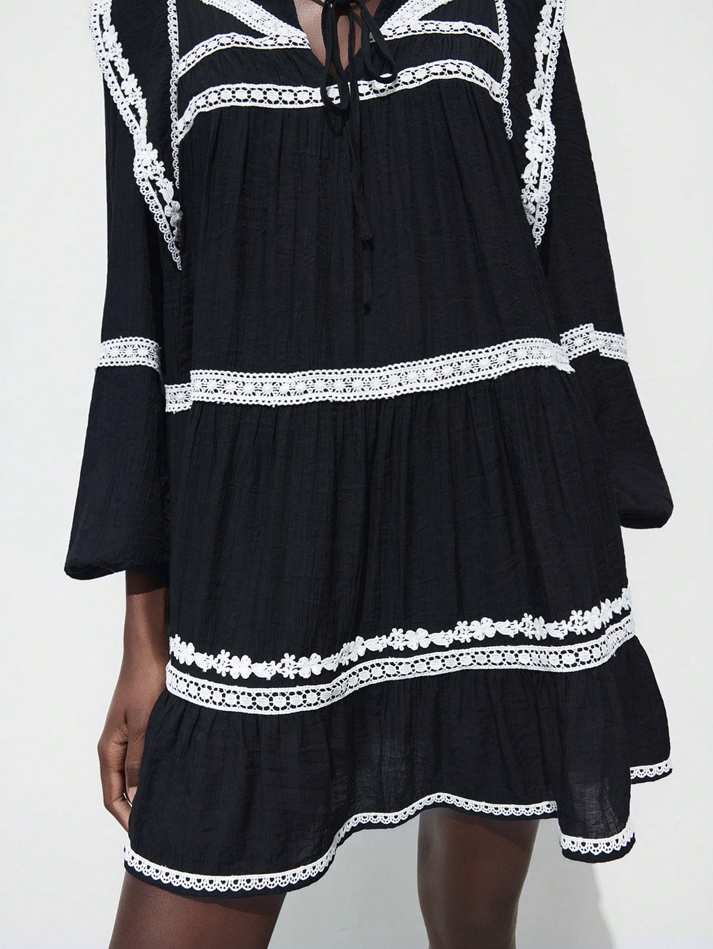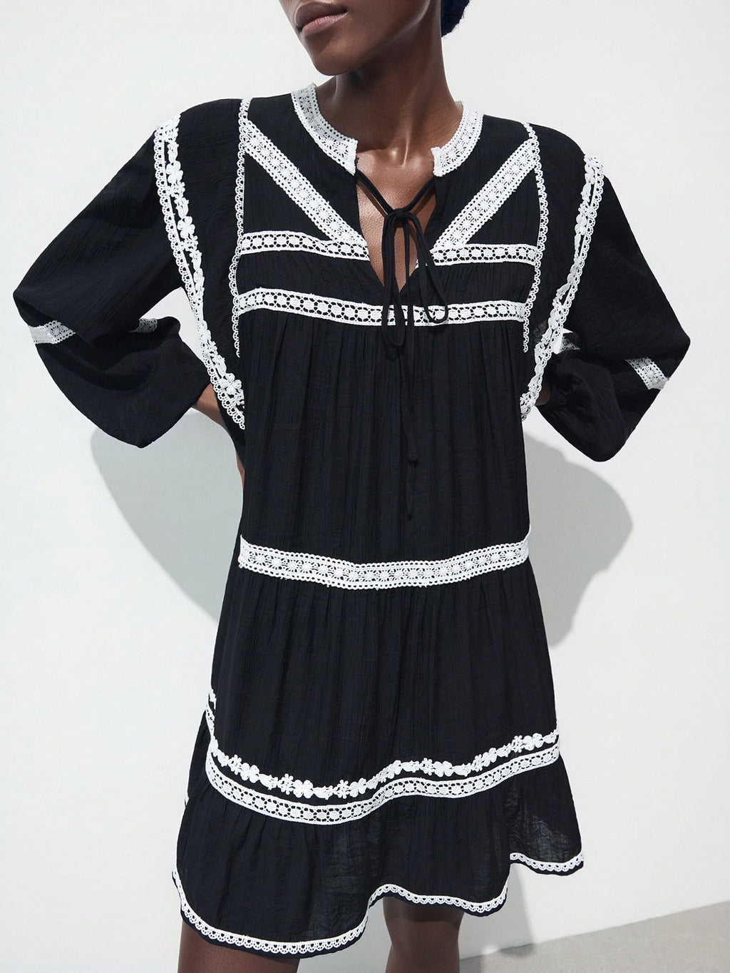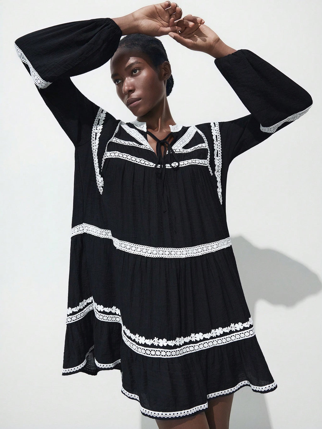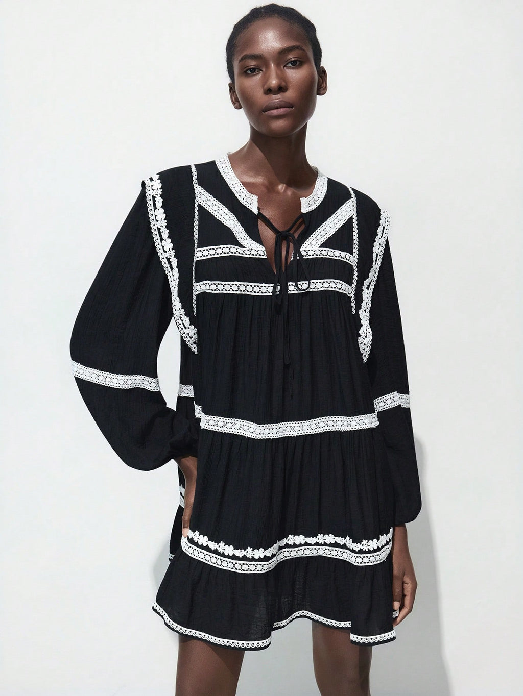 MIU Black Embroidered Patchwork Long Sleeve Women's Short Dress, Loose Boho Beach Casual Vacation Style French Dresses For Women Black Dress With White Lace Black And White Dress Lace Dress