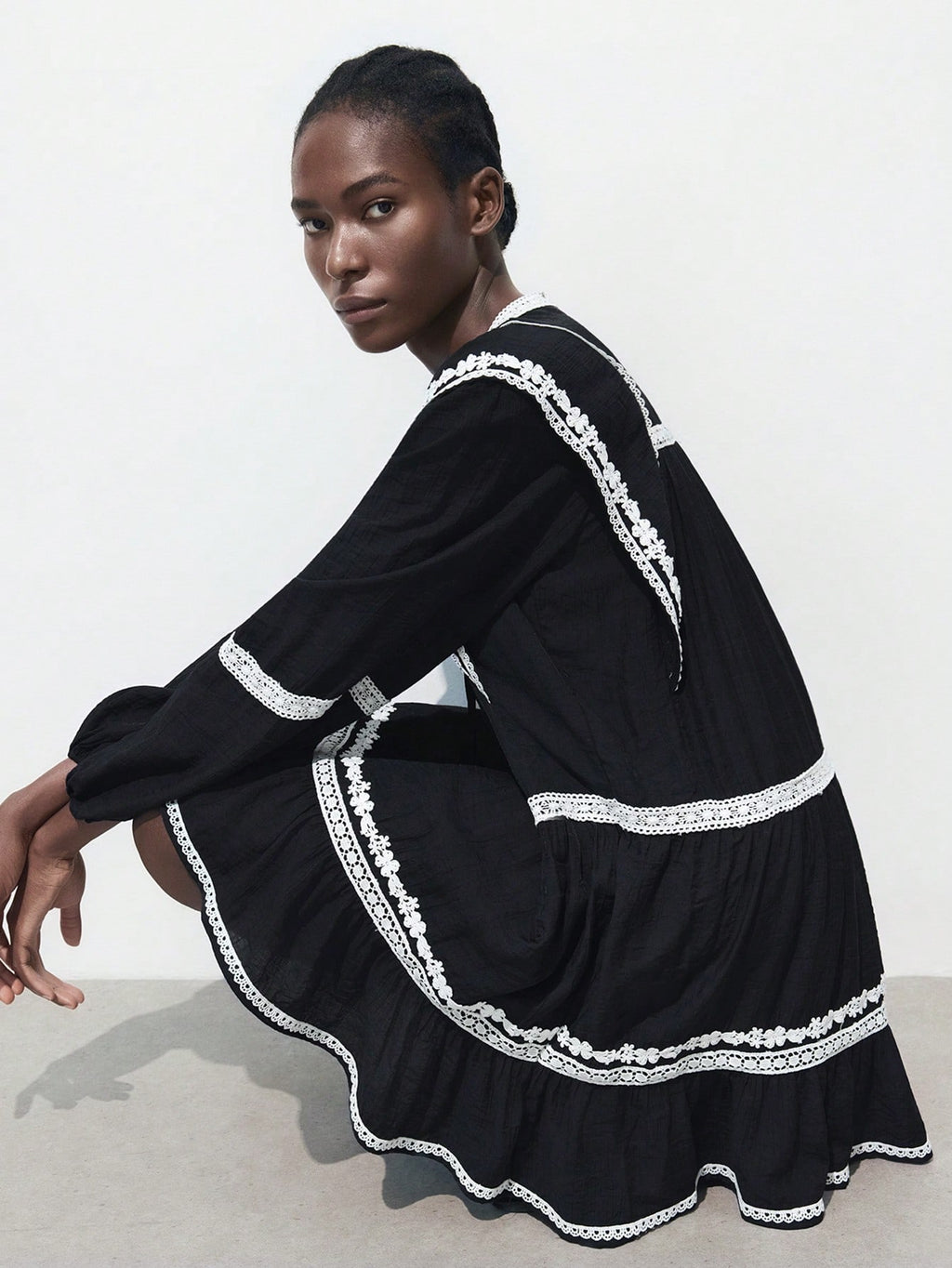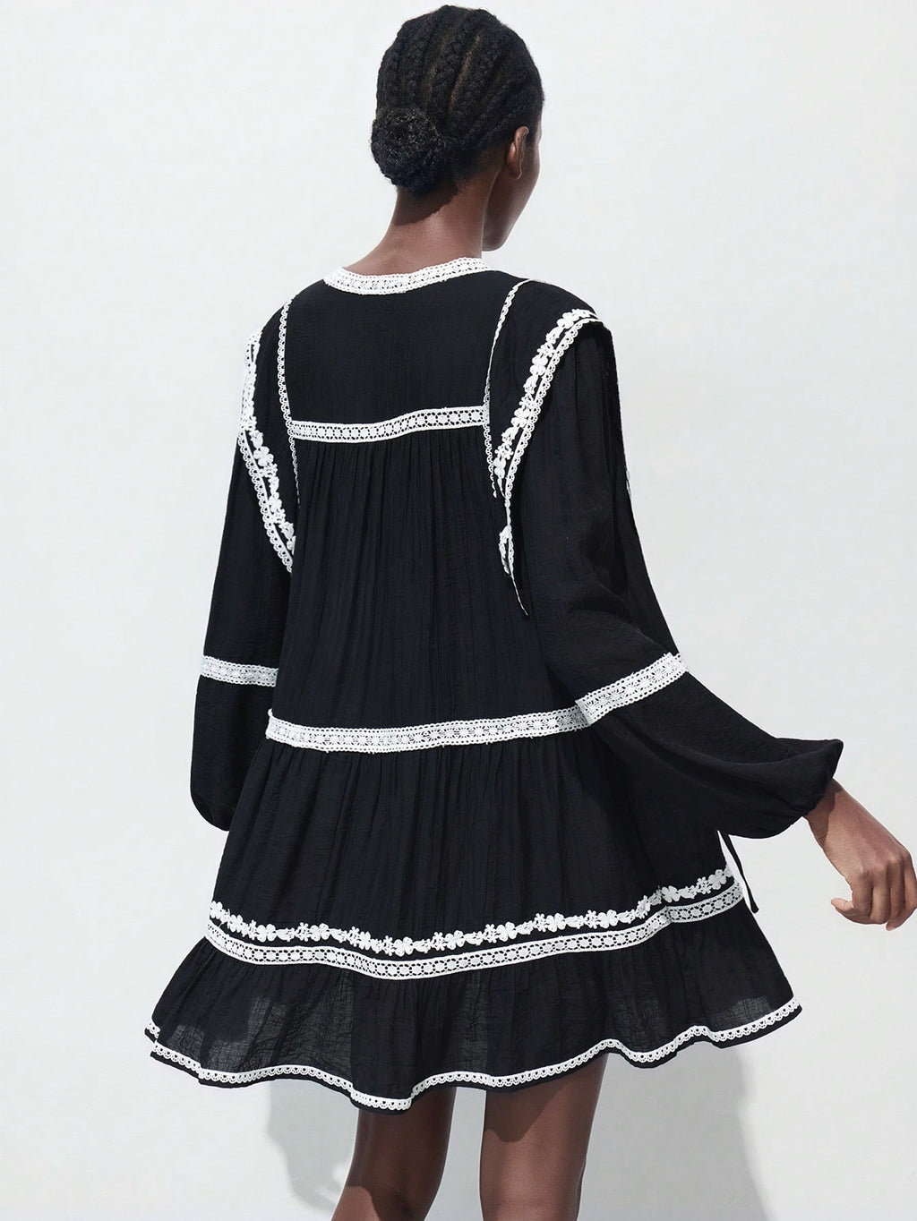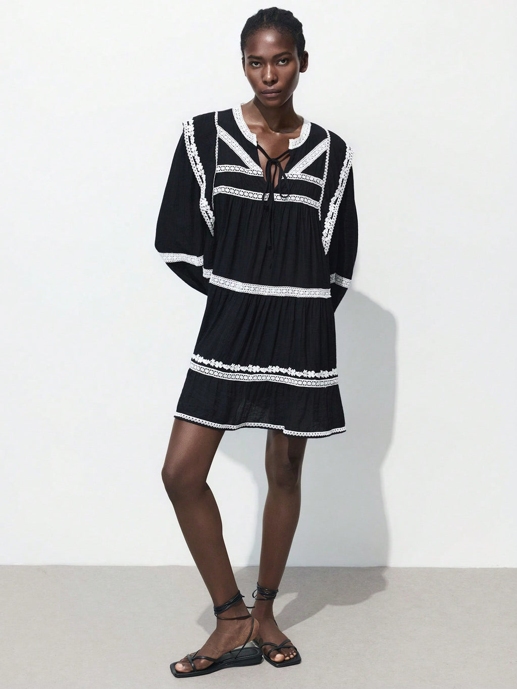 MIU Black Embroidered Patchwork Long Sleeve Women's Short Dress, Loose Boho Beach Casual Vacation Style French Dresses For Women Black Dress With White Lace Black And White Dress Lace Dress
