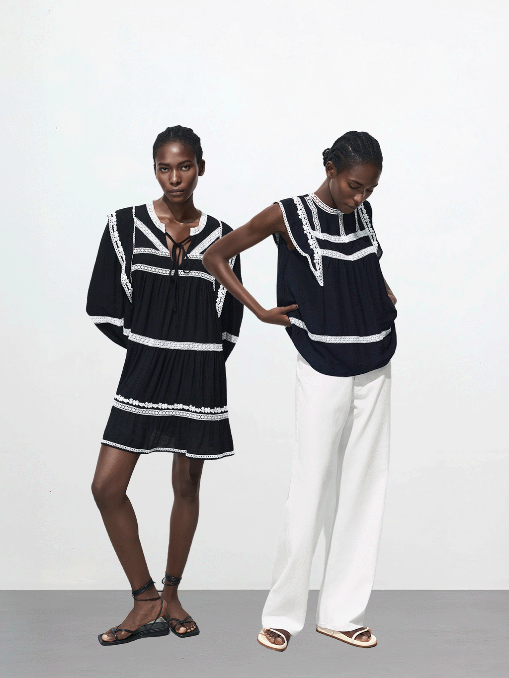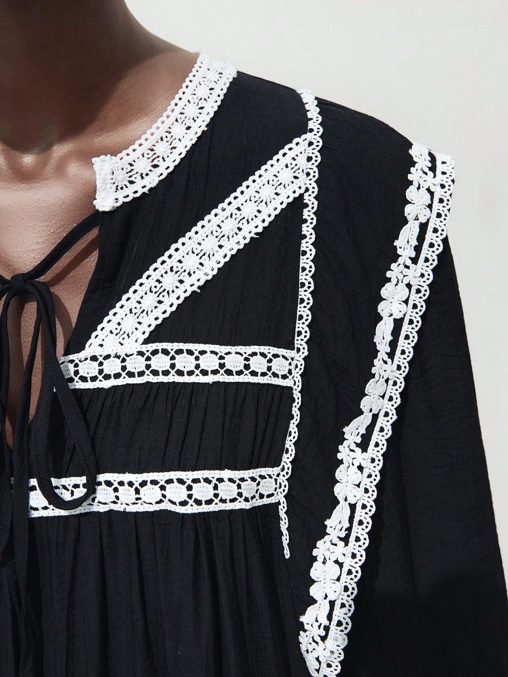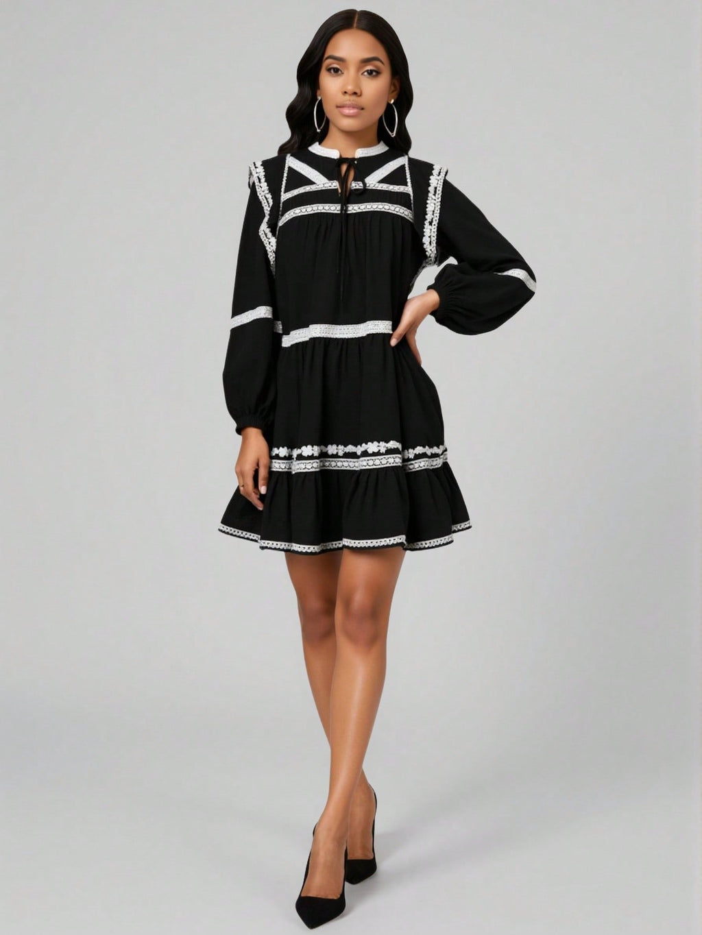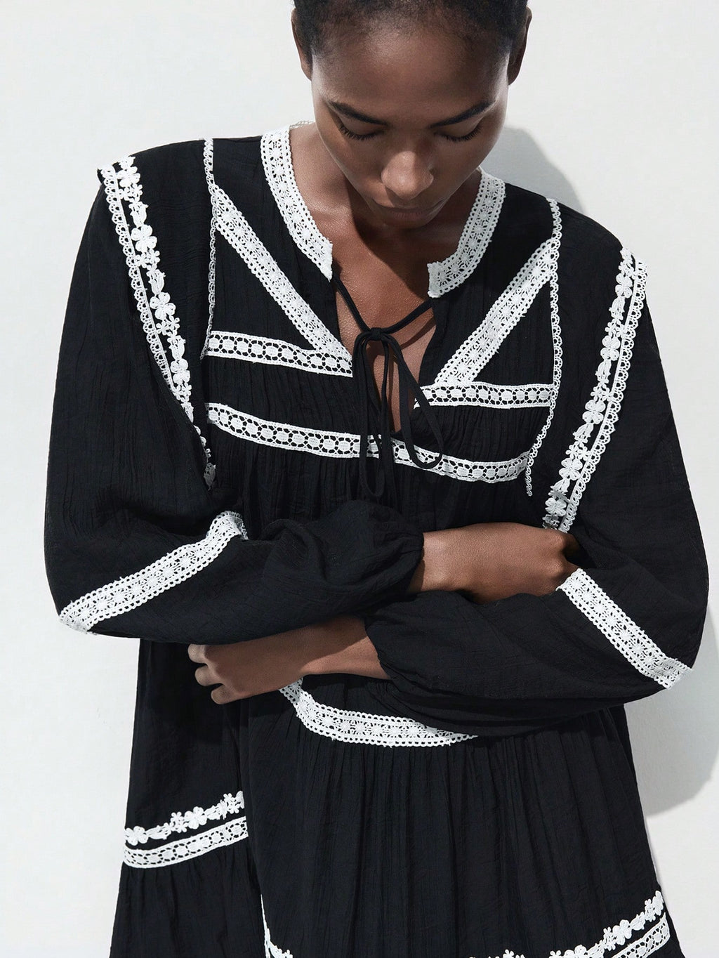 MIU Black Embroidered Patchwork Long Sleeve Women's Short Dress, Loose Boho Beach Casual Vacation Style French Dresses For Women Black Dress With White Lace Black And White Dress Lace Dress