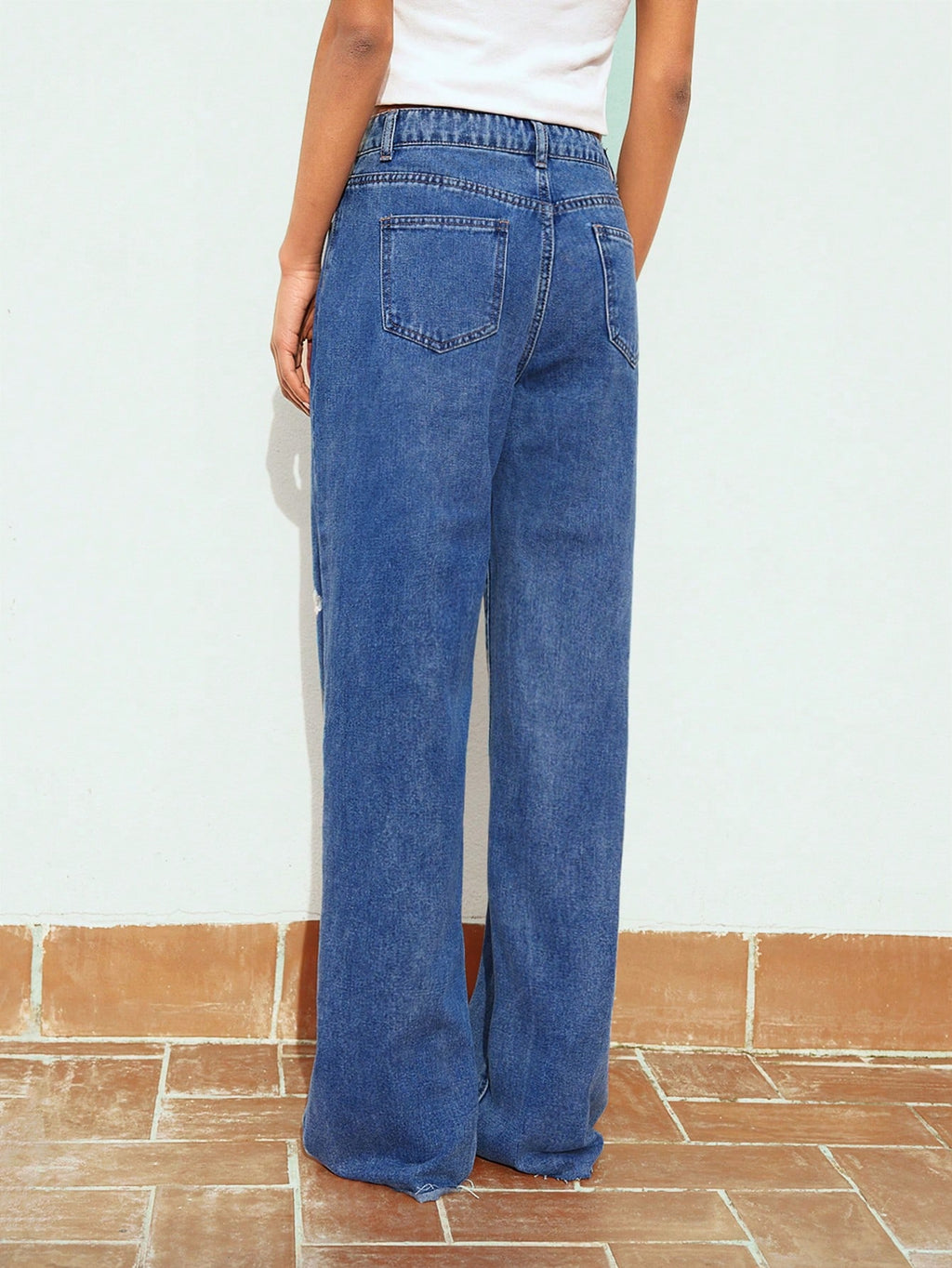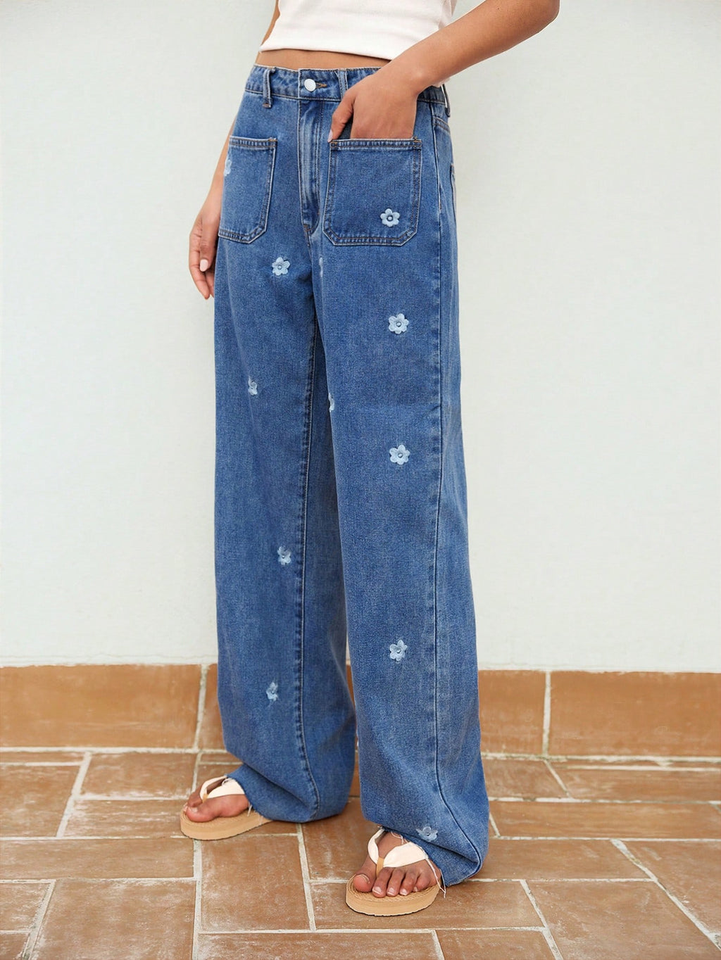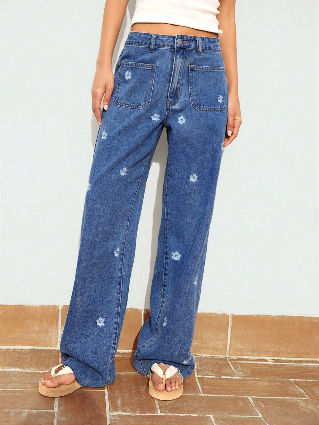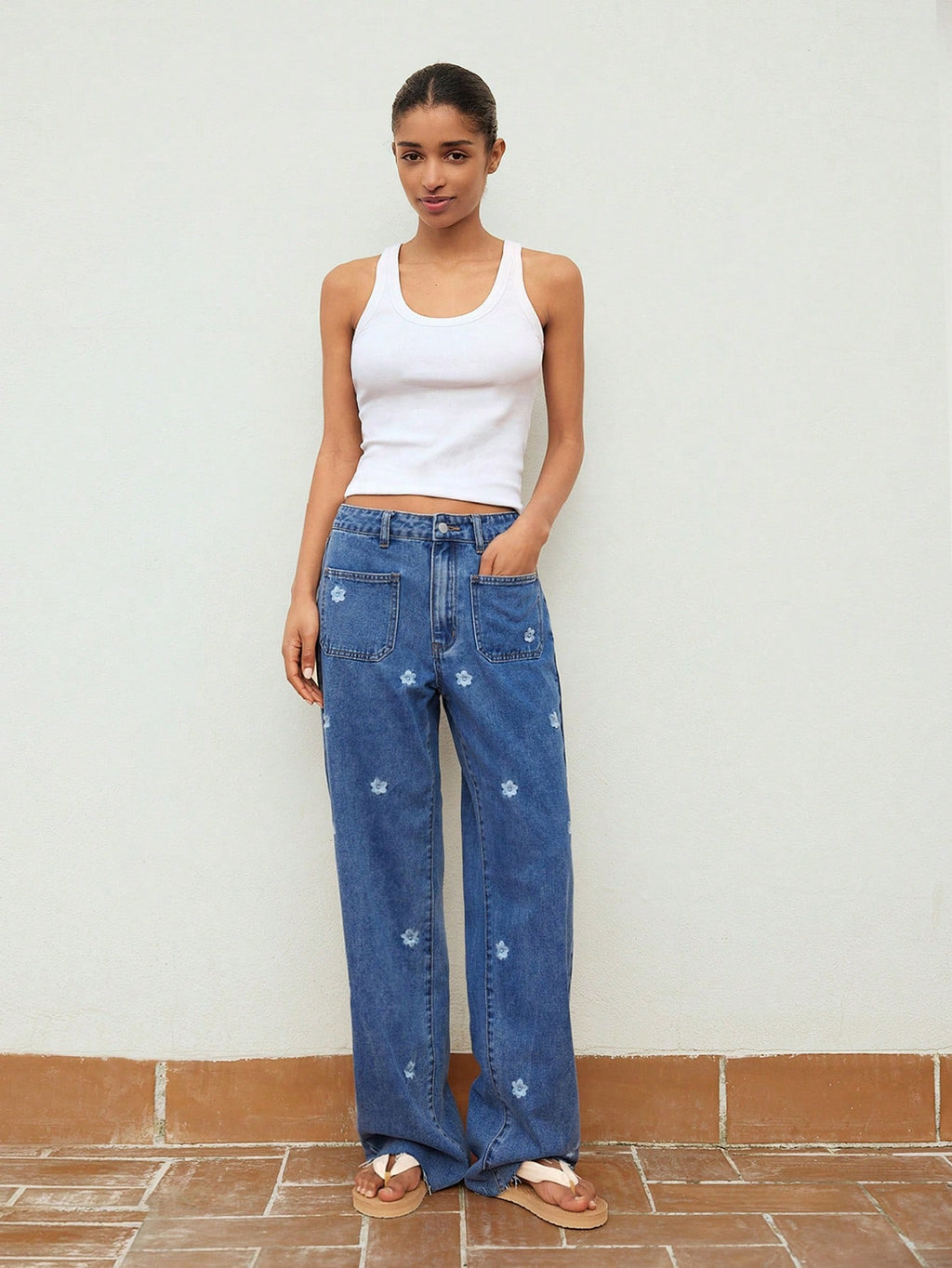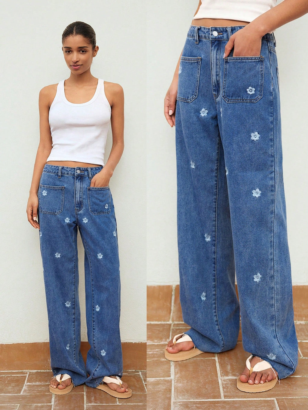 MIU Blue Women's Jeans Embroidery Craft Slimming Straight Pants Low Rise Jeans Summer Denim