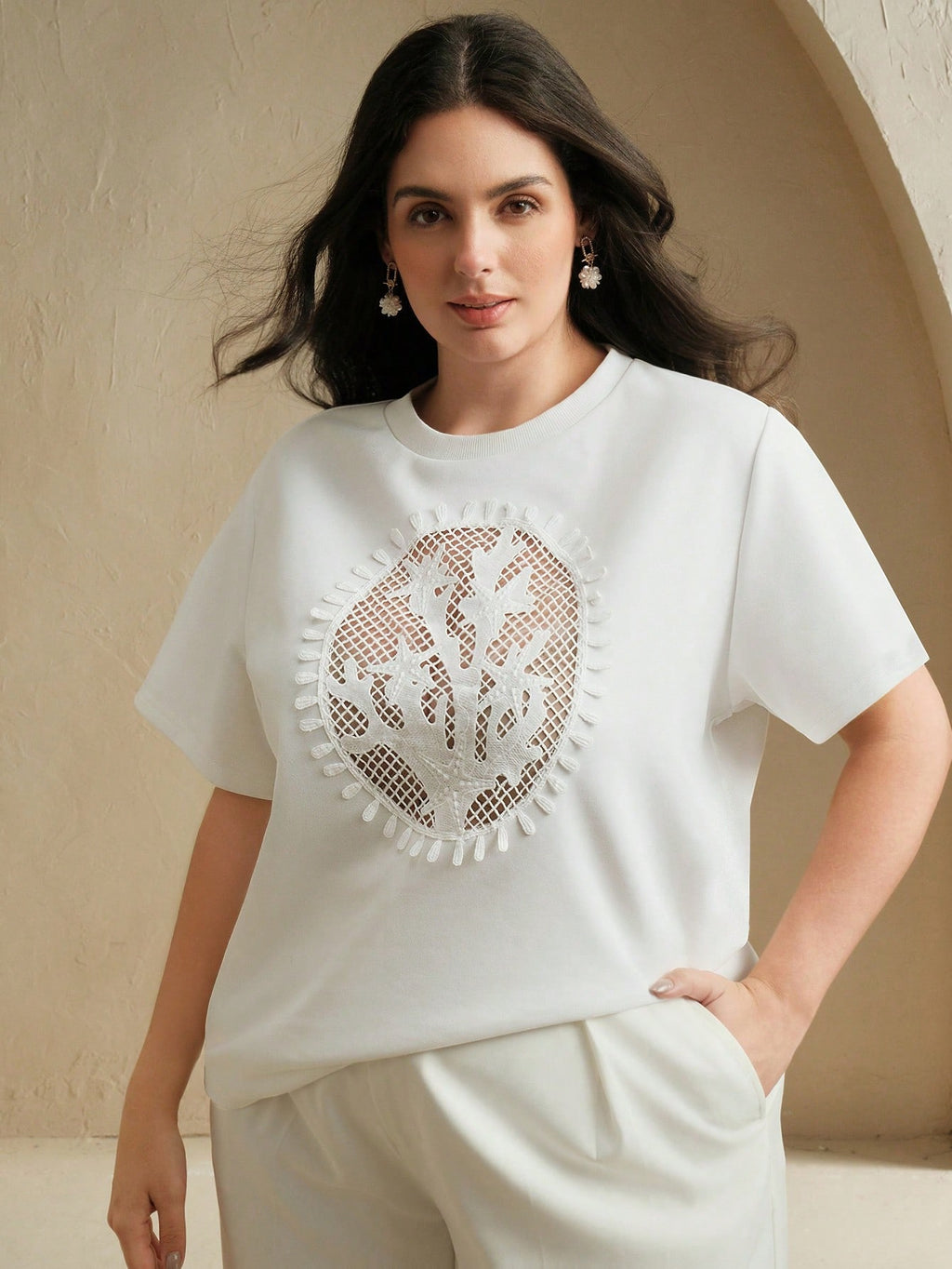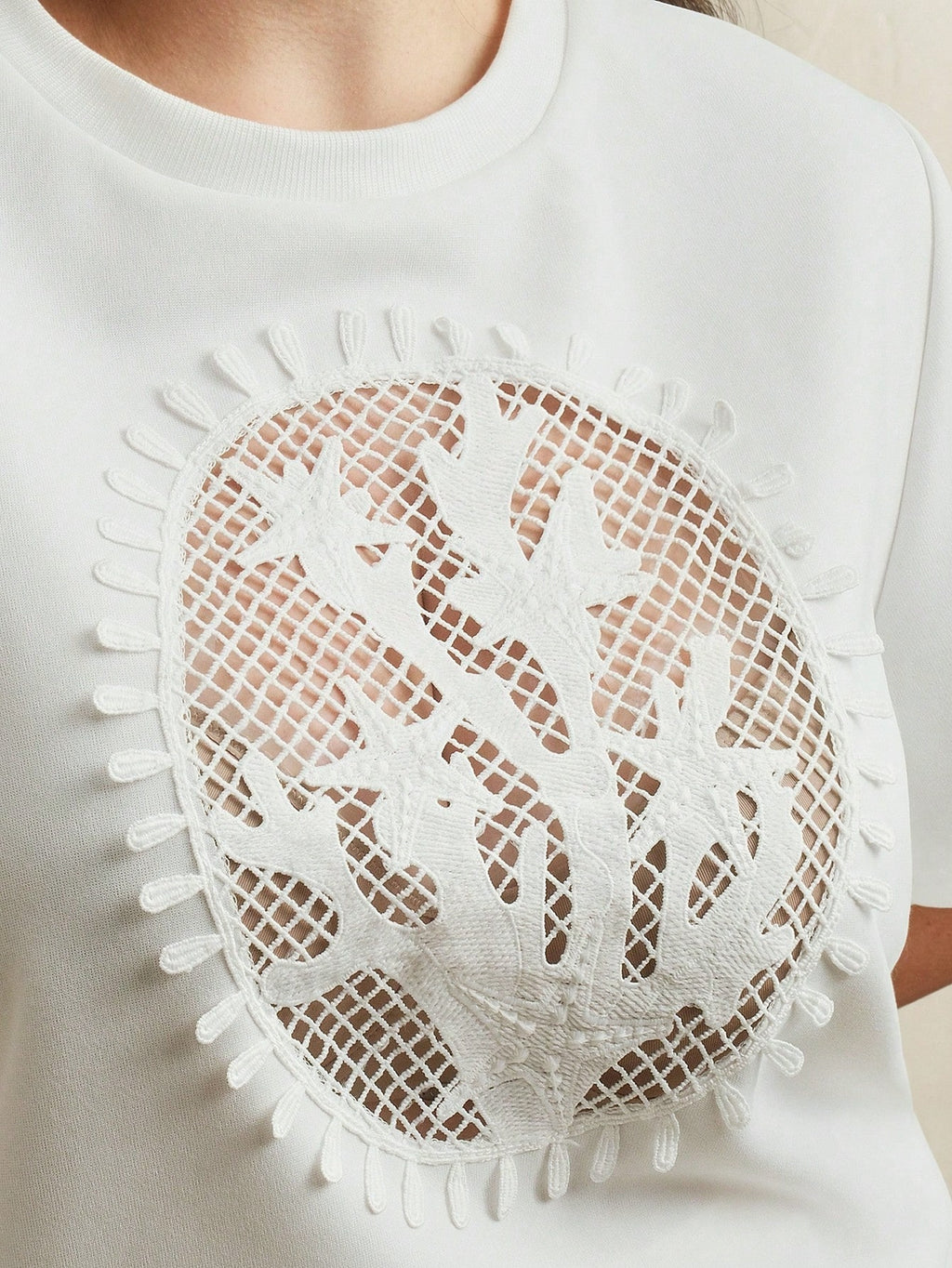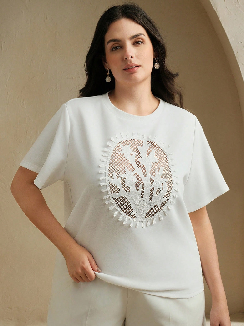 MIU Casual Elegant White Hollow-Out Round Neck Short Sleeve T-Shirt, Summer