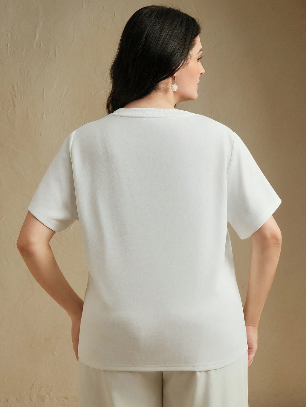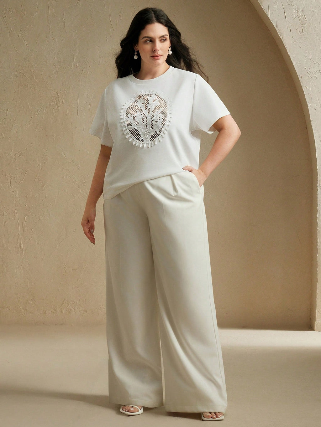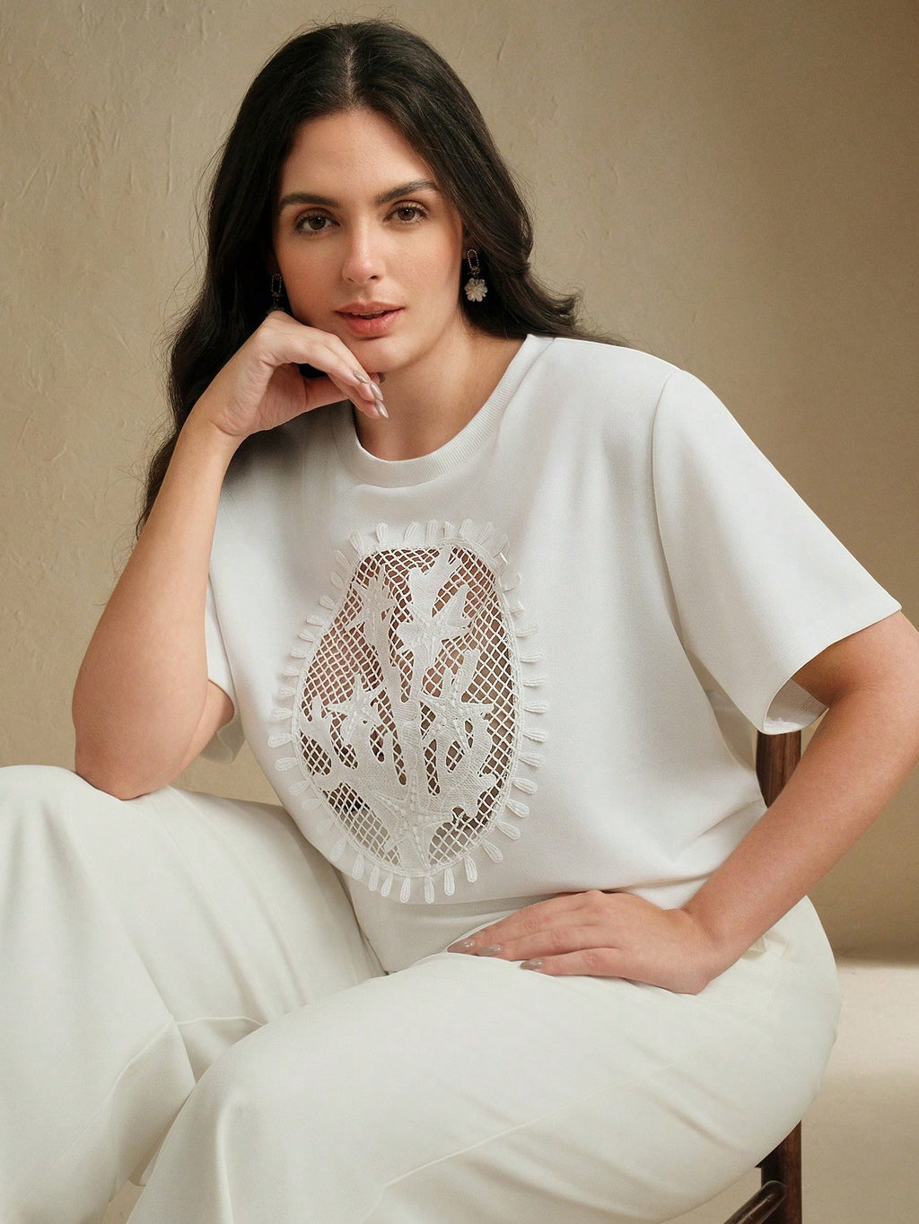 MIU Casual Elegant White Hollow-Out Round Neck Short Sleeve T-Shirt, Summer